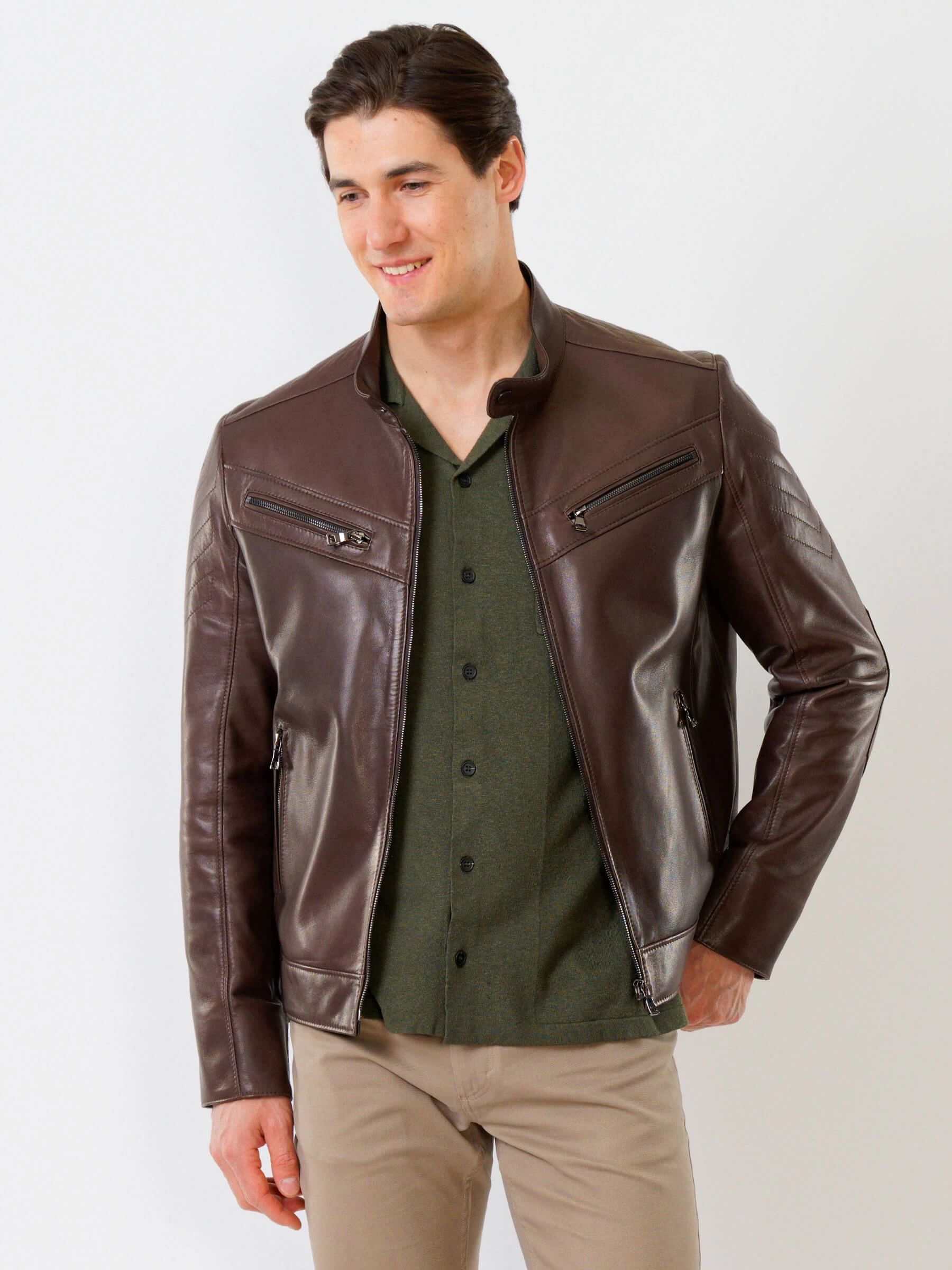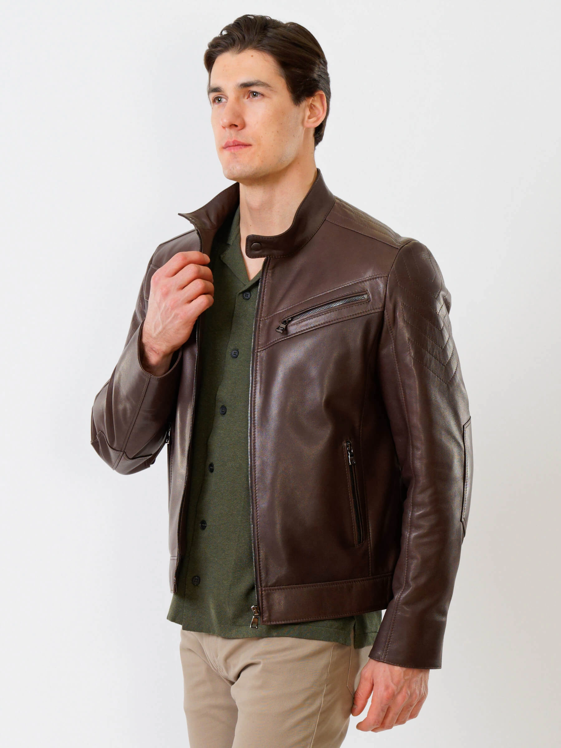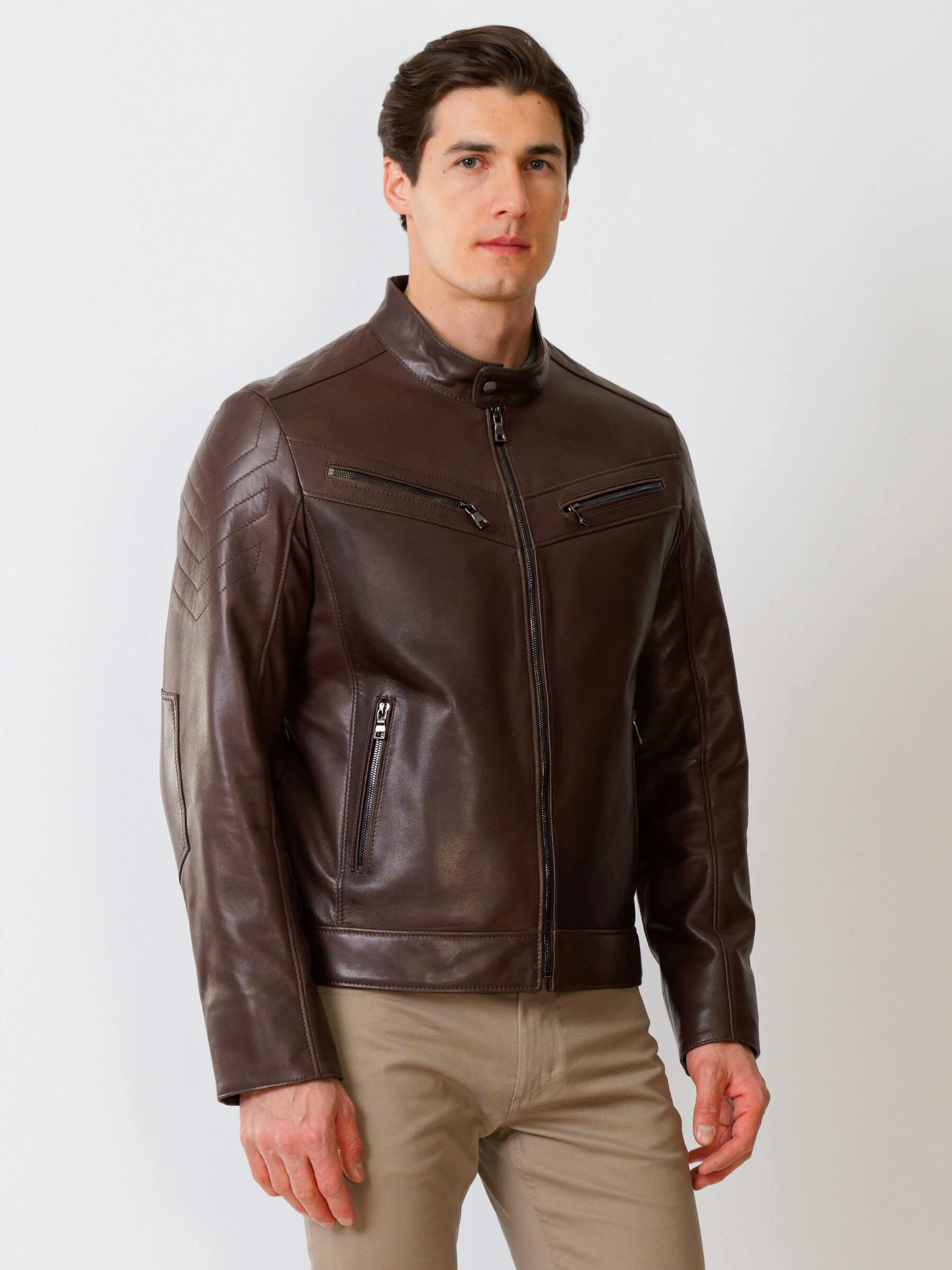 Короткую куртку полуприлегающего силуэта с воротником- стойкой выполинили из гладкой кожи премиального качества. Втачной рукав выделили стеганным ромбовидным узором. Боковые и нагрудные карманы как и само изделие застегиваются молниями. Предусмотрены удобные внутренние карманы для документов. Безупречная работа наших портных. Идеальная посадка по фигуре, прекрасная свобода движений.