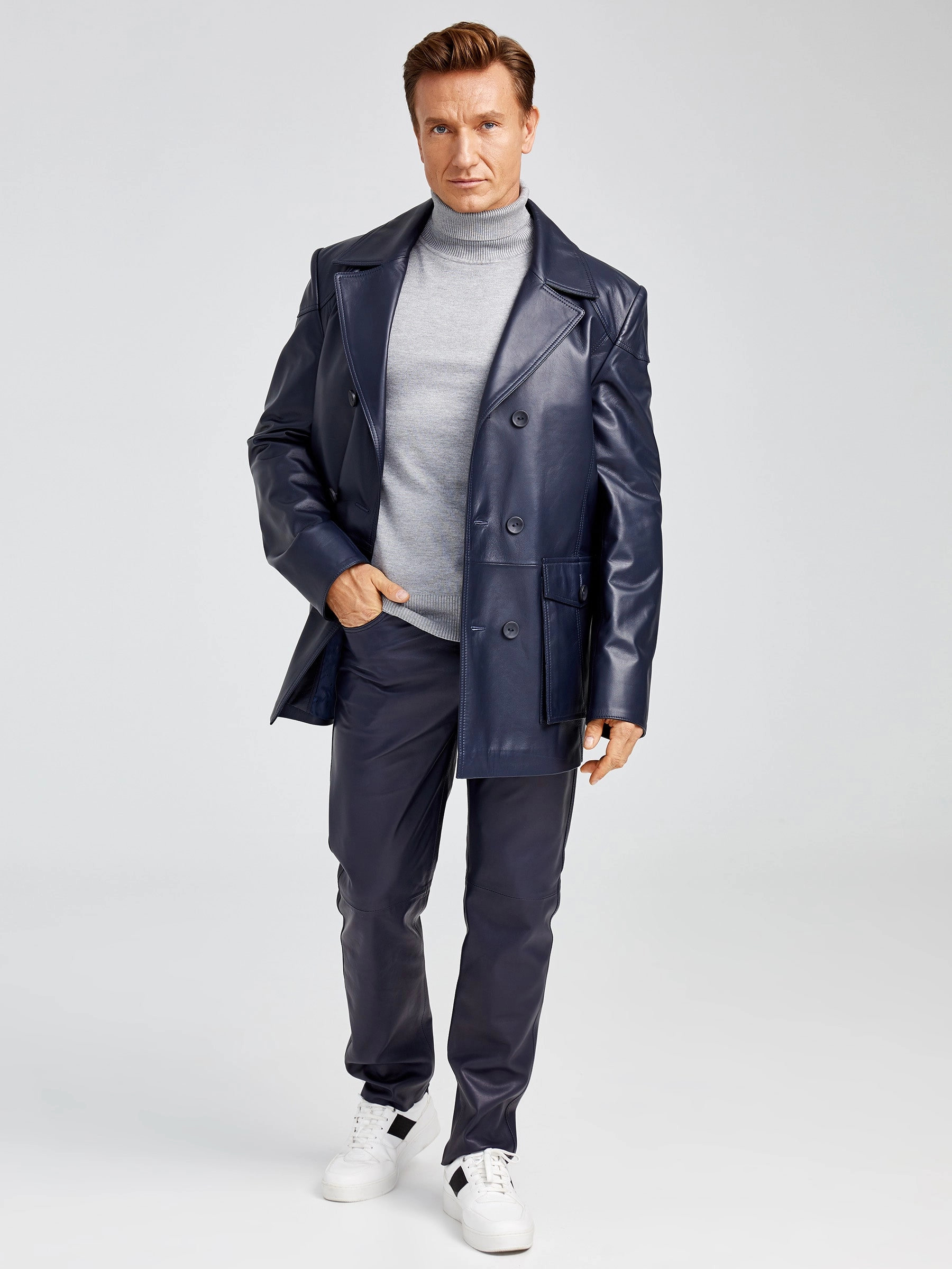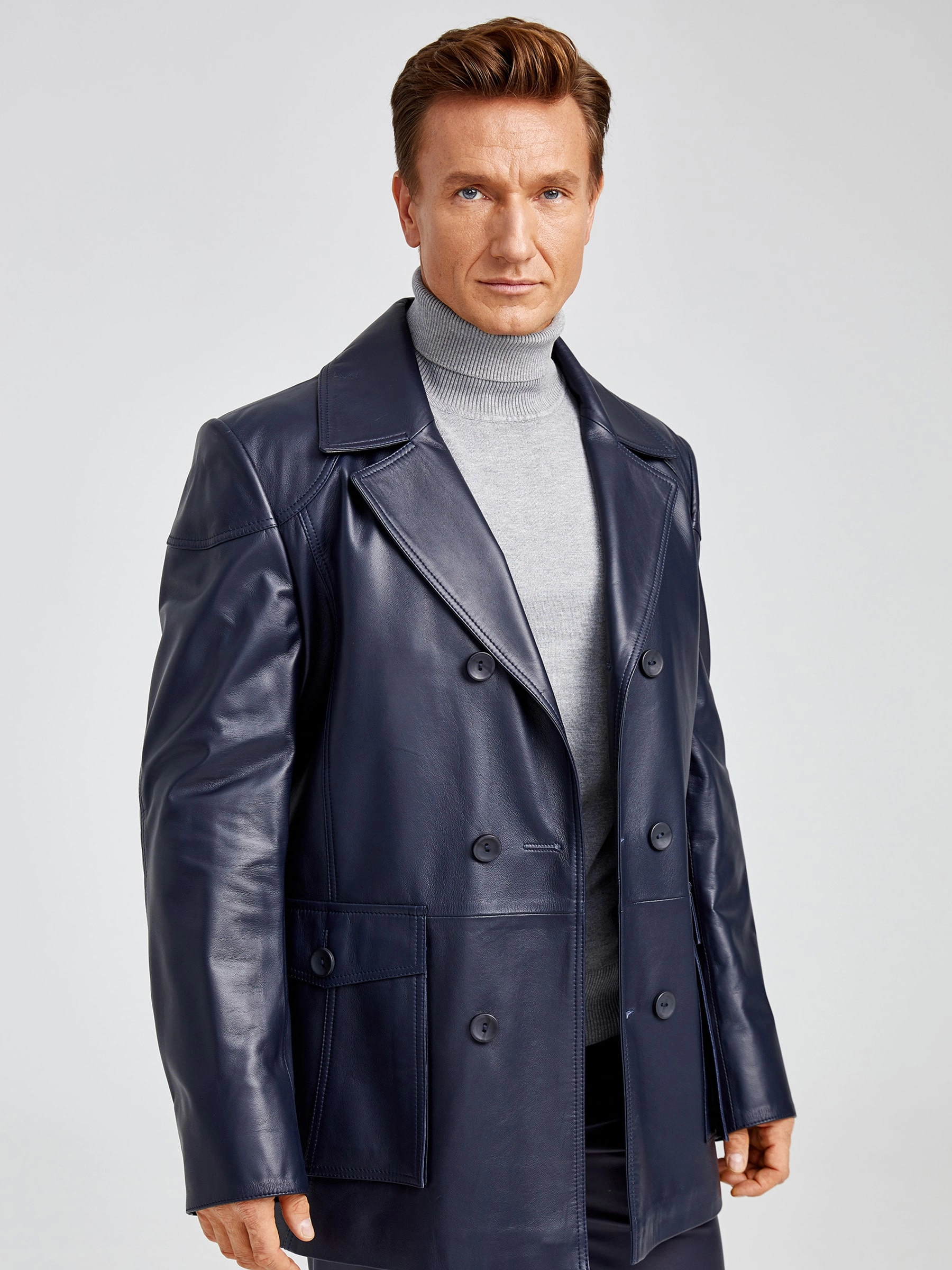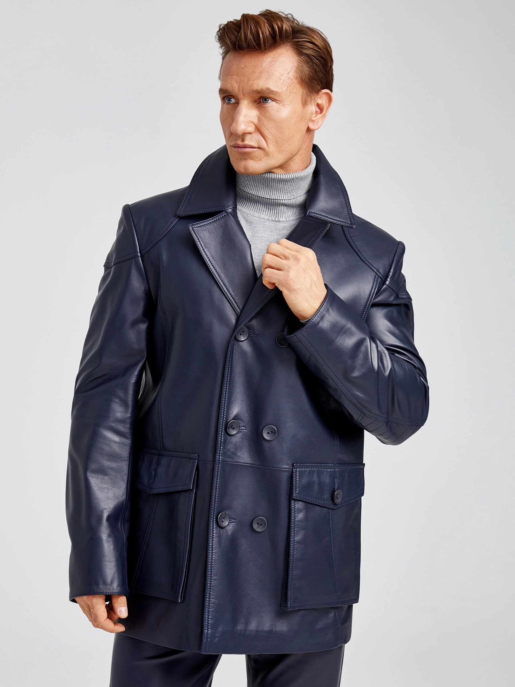 Двубортная мужская кожаная куртка бушлат 549, синяя, размер 48, артикул 28881
