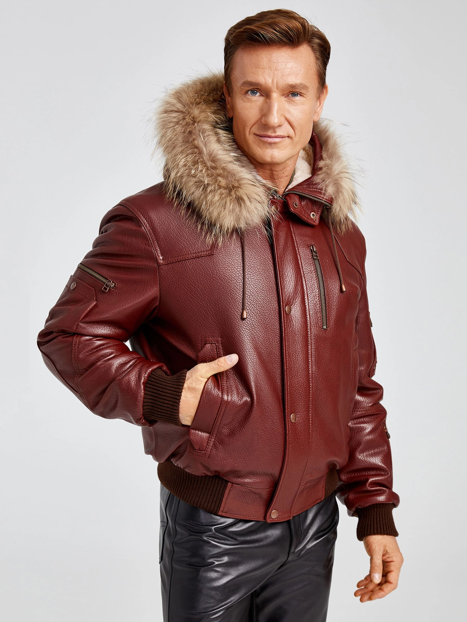 Кожаная мужская куртка аляска утепленная с мехом енота 509, виски, размер 48, артикул 40392
