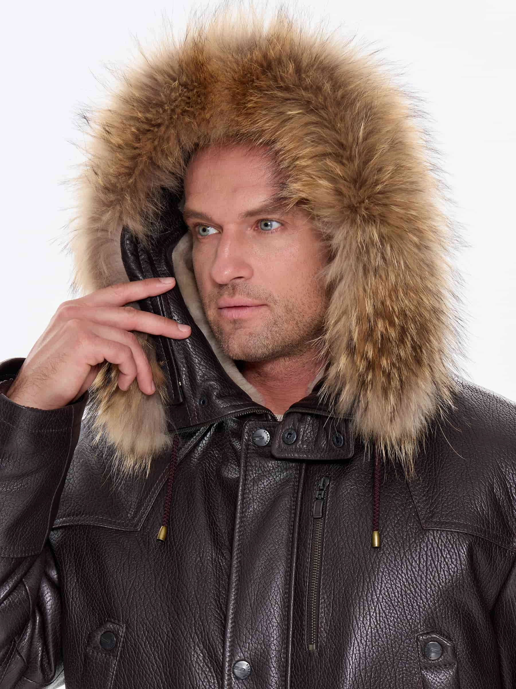 Утепленная мужская кожаная куртка аляска с мехом енота Алекс, коричневая, размер 52, артикул 40300