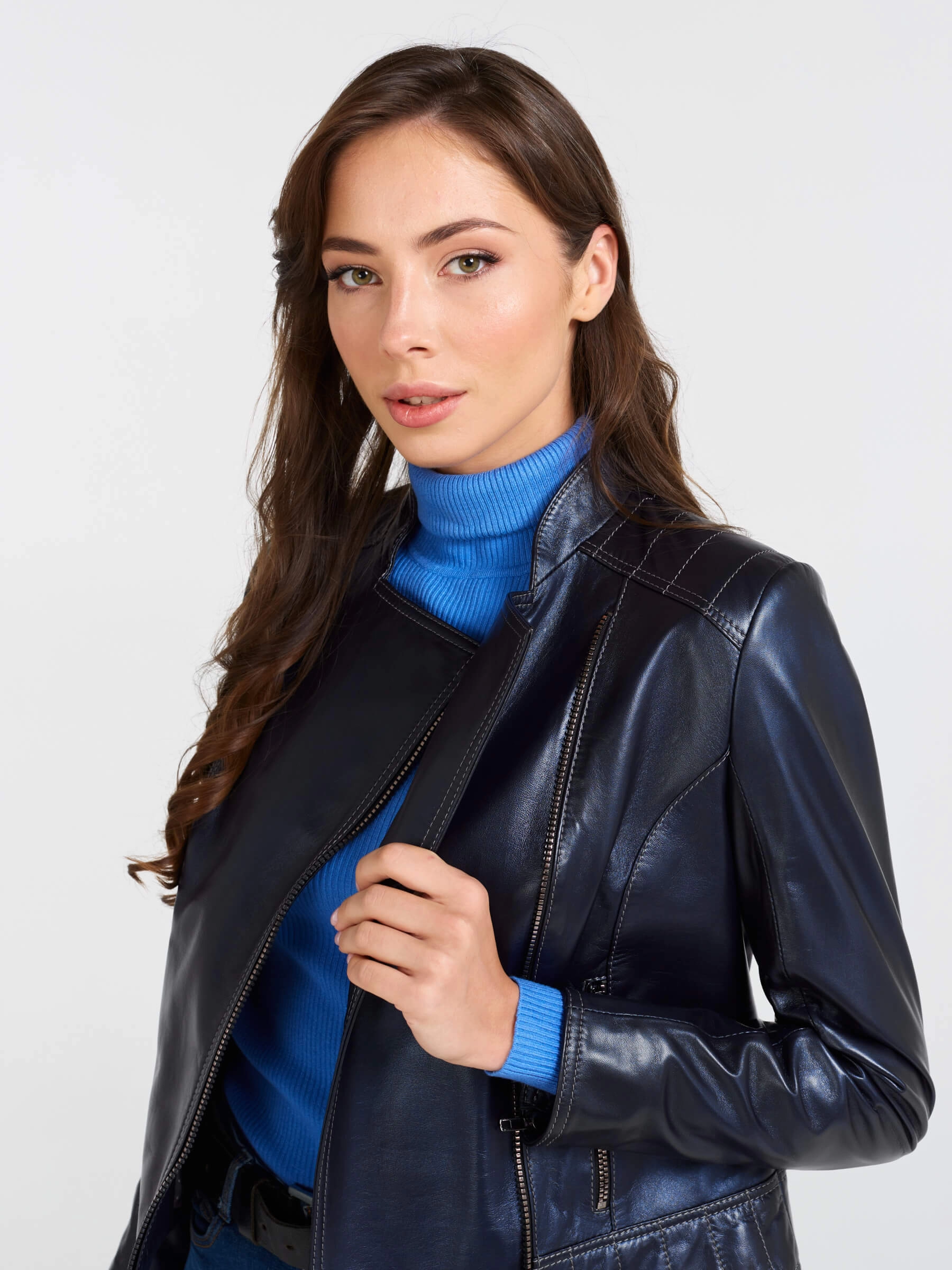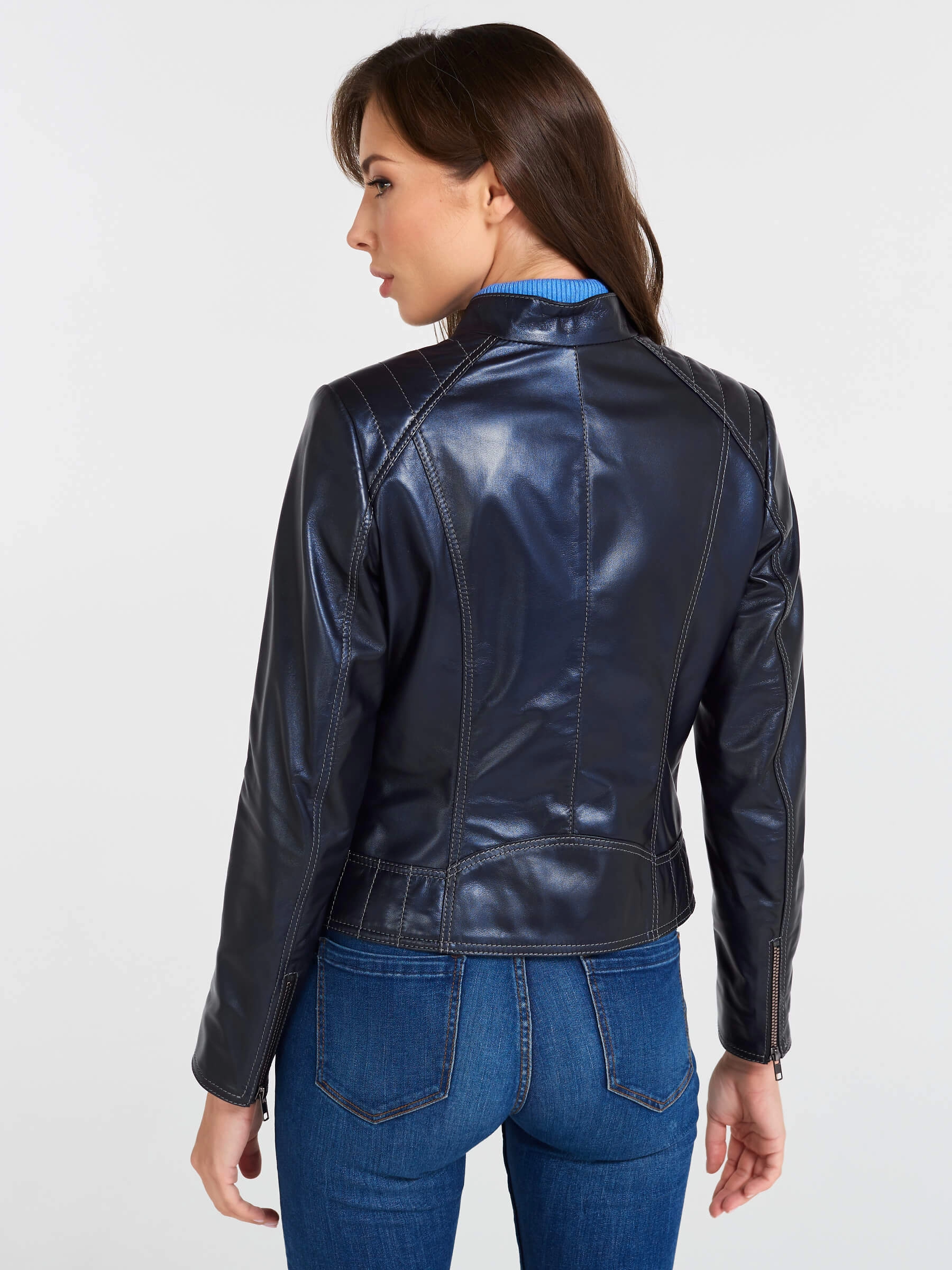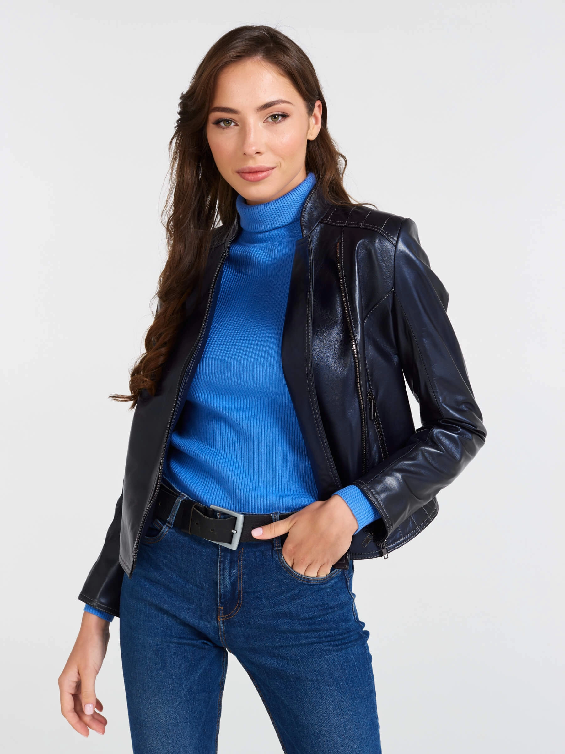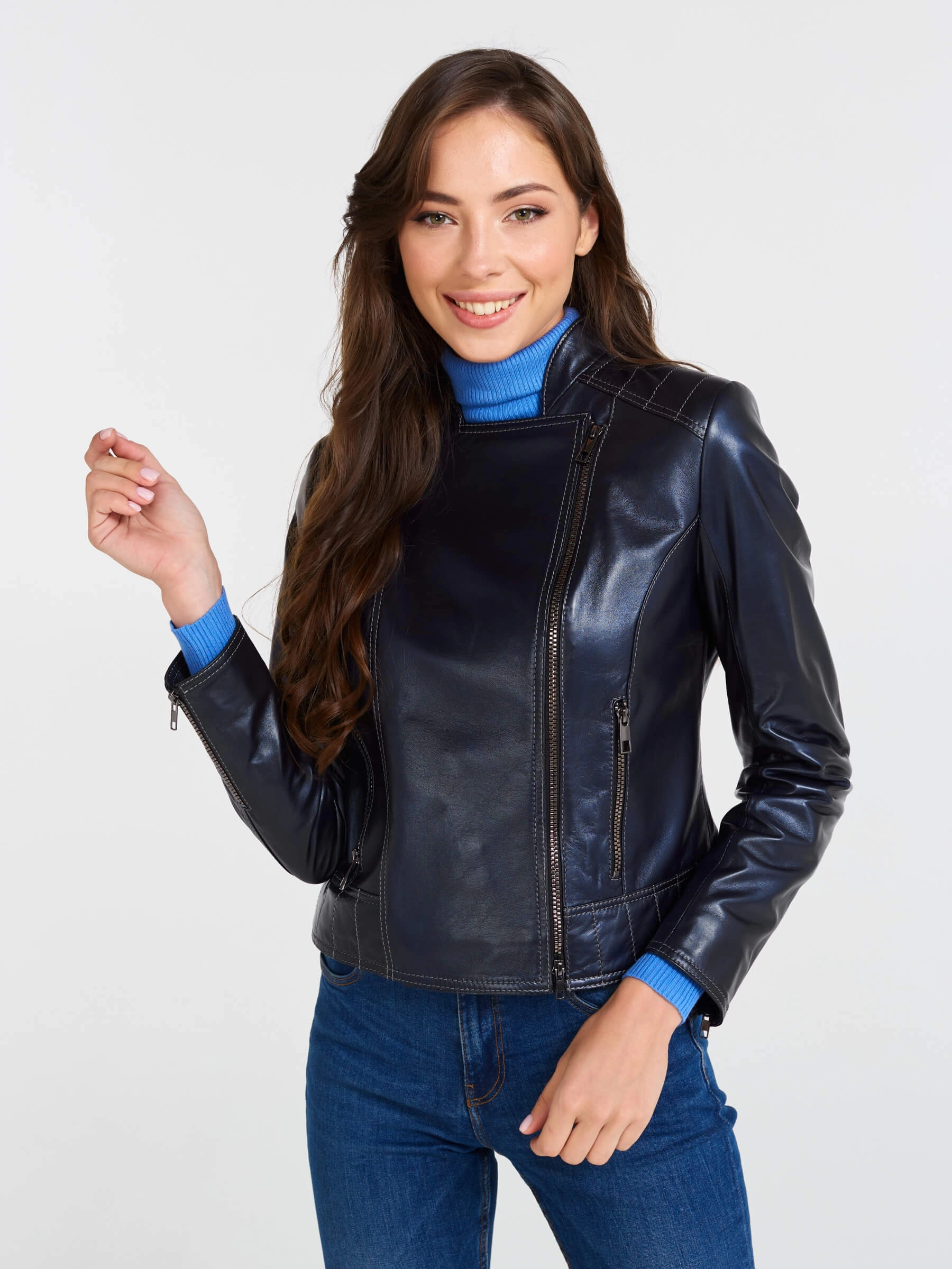 Кожаная куртка косуха женская 300, синий перламутр, размер 46, артикул 90220