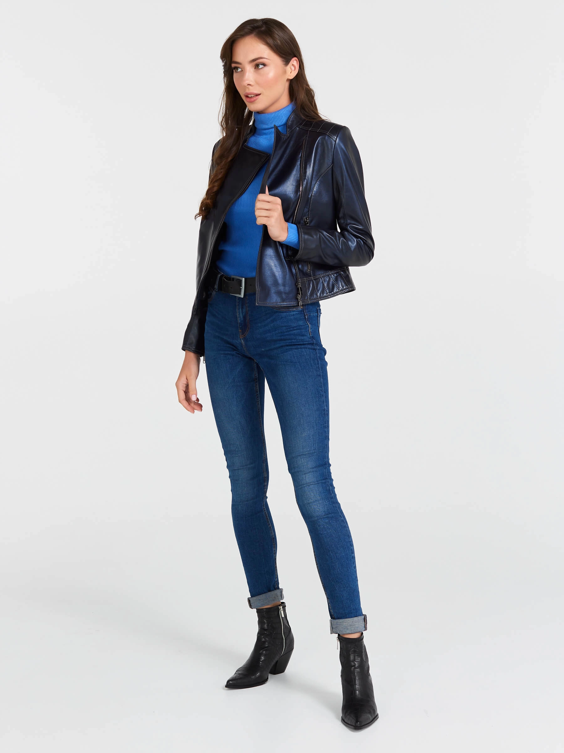 Стильная женская куртка-косуха из натуральной кожи премиум-класса с застежкой-молнией. Полуприлегающий силуэт и втачной рукав подчеркивают фигуру, а дерзкий воротник-стойка с широкими лацканами завершает образ. Боковые карманы на молниях добавляют практичности. Эта универсальная модель станет ключевым элементом вашего гардероба — сочетайте её с джинсами для бунтарского стиля или набрасывайте на платье, чтобы создать контрастный образ.