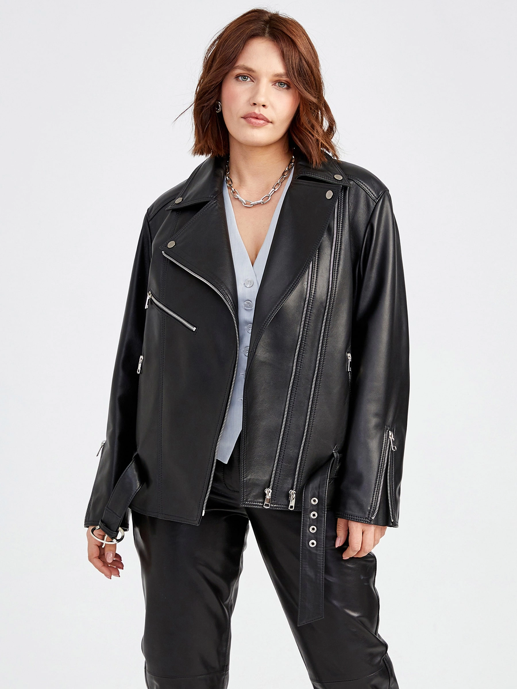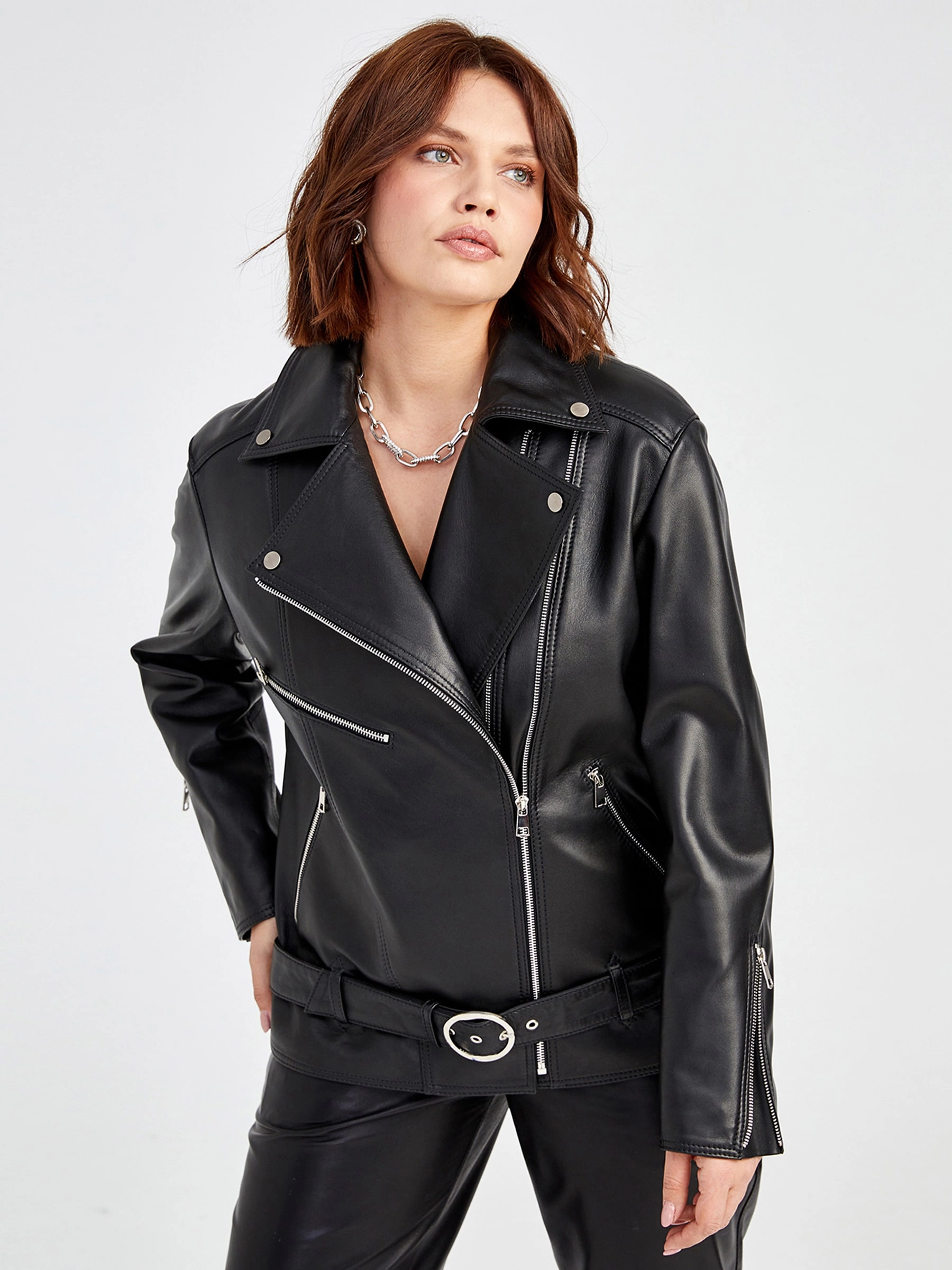 Куртка-косуха из мягчайшей натуральной кожи ягненка на молнии. Английский воротник с широкими лацканами, втачной рукав и прямой силуэт длиной 65 см создают идеальный спортивный шик. Эта дерзкая куртка-косуха из натуральной кожи на молнии заряжена деталями: крупные молнии на рукавах и врезных карманах, съёмный пояс для акцента на талии. Легендарный образ в духе рок-н-ролла — идеально смотрится с укороченными джинсами, кедами, ботинками в стиле милитари или даже с платьями-комбинациями для контраста!