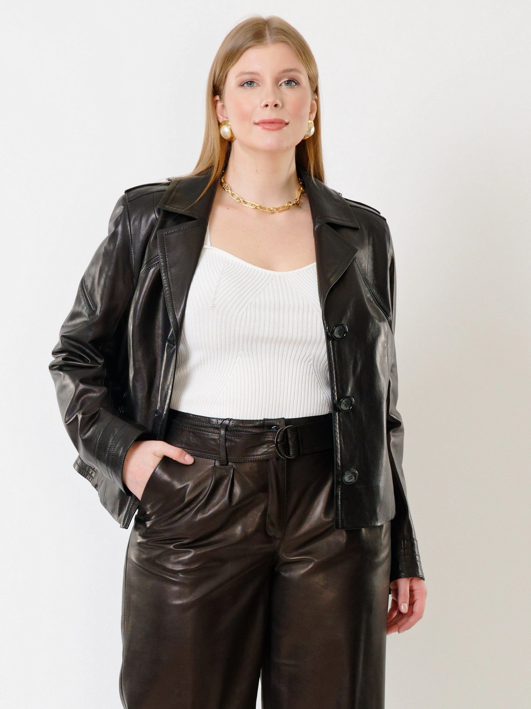 Короткий кожаный пиджак в стиле милитари на пуговицах с полуприлегающим силуэтом. Безупречную посадку обеспечивают четкие линии английского воротника, втачной рукав и акцент на талии. Лаконичный дизайн дополняют практичные врезные карманы. Сочетайте с джинсами и ботинками для дерзкого повседневного образа или с брюками-карго для полного воплощения милитарной эстетики.