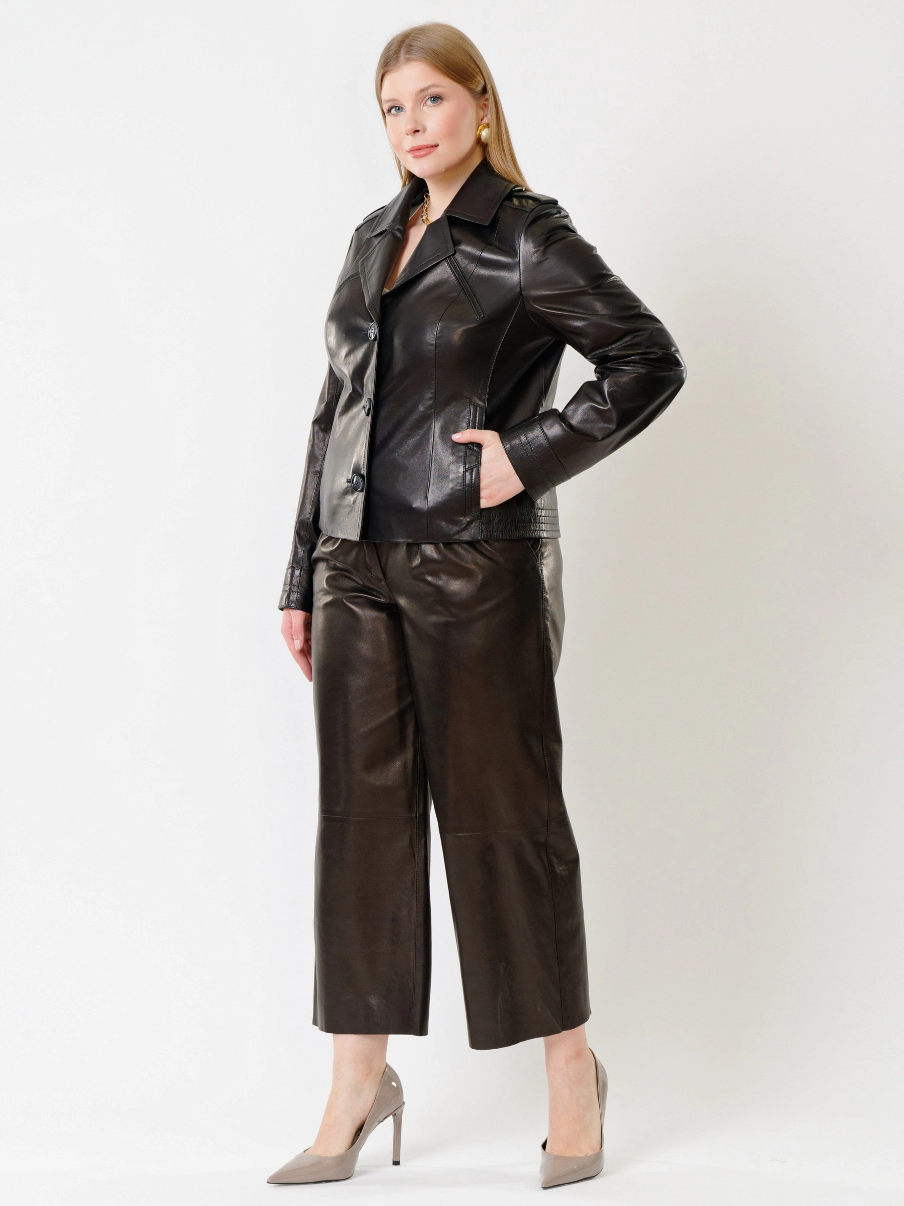 Короткая женская кожаная куртка пиджак 304, черная, размер 46, артикул 91213