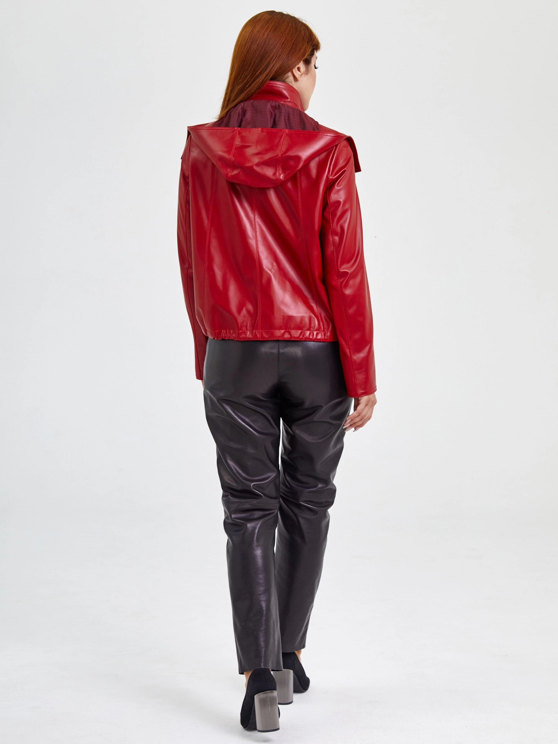 Кожаная женская куртка бомбер с капюшоном 305, красная, размер 48, артикул 91741