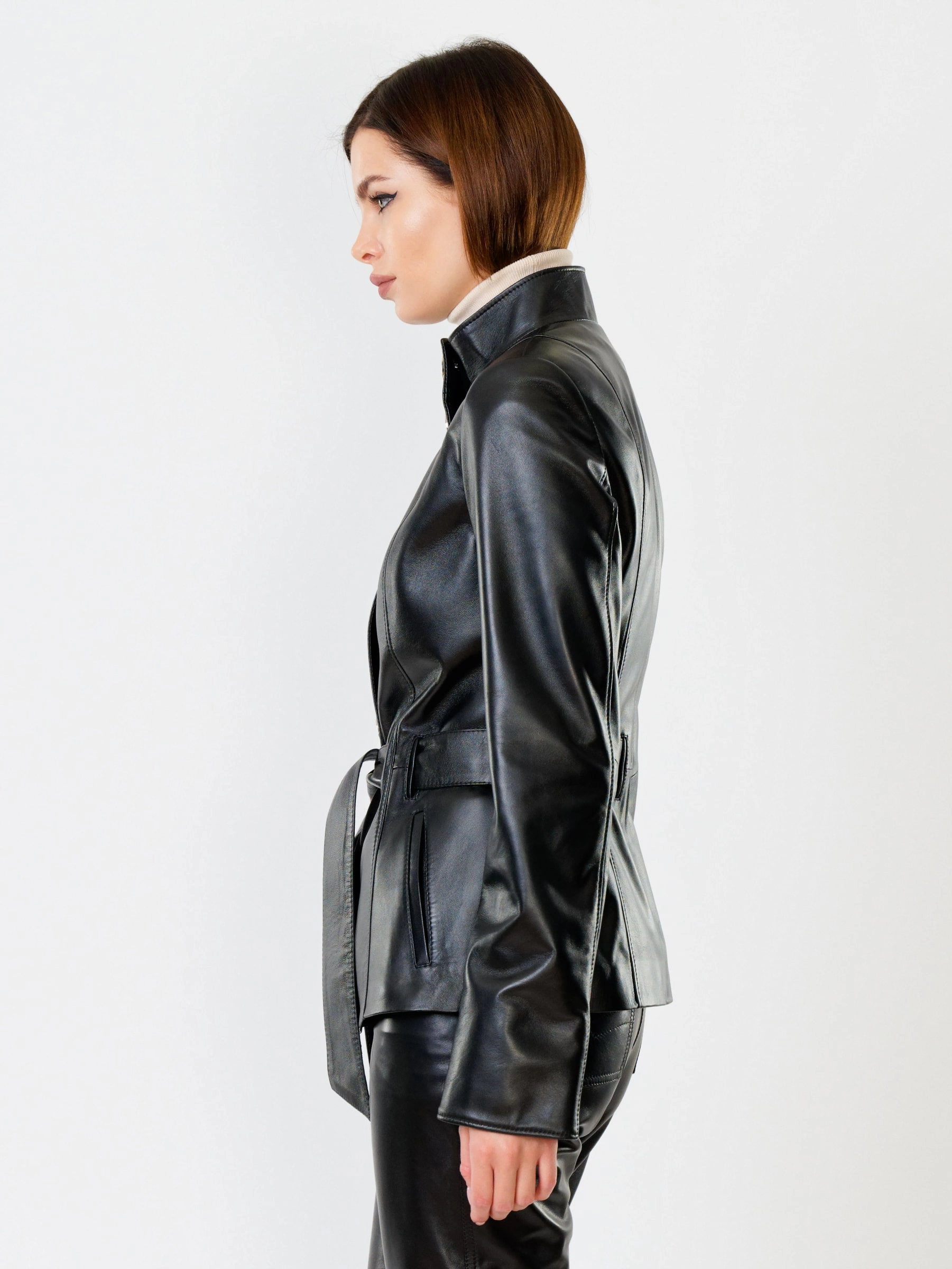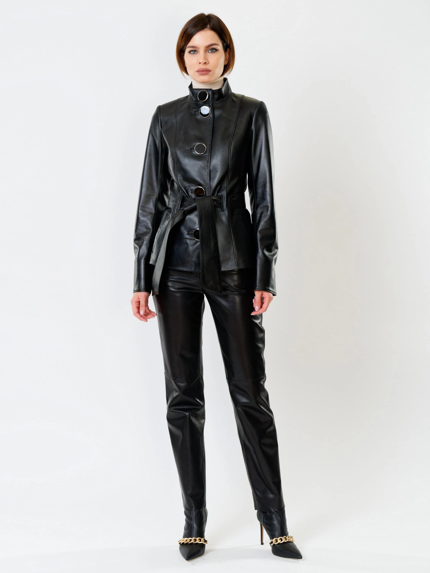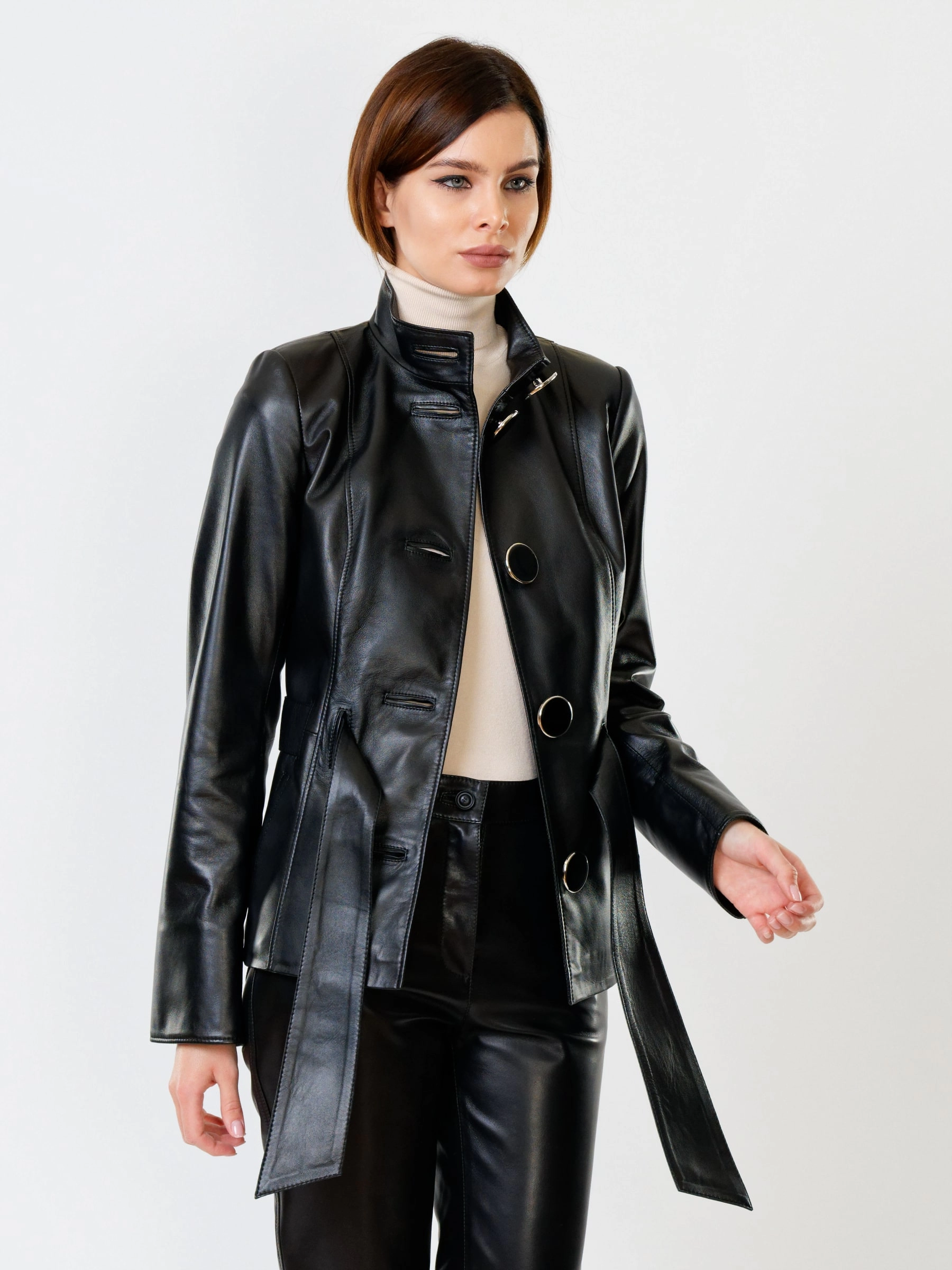 Элегантная куртка из натуральной кожи на пуговицах с акцентным поясом — идеальное сочетание утонченности и дерзкого характера. Приталенный силуэт длиной 66 см подчеркивает талию, а невысокая стойка и лаконичные врезные карманы завершают сдержанный образ. Гладкая кожа премиального качества и выразительные пуговицы подчеркивают статусность модели. Носите эту куртку с кожаными брюками для монохромного ансамбля или набросьте на платье-миди, чтобы создать контрастный повседневный образ с ноткой смелости.
