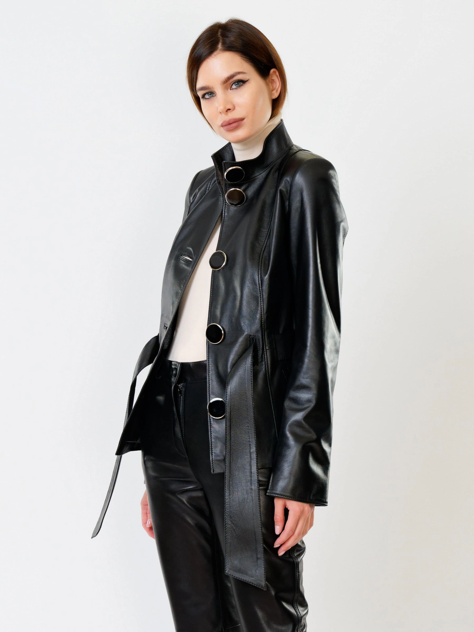 Товар кожаная женская куртка с поясом 334, черная, размер 40, артикул 91101 выполнен из натуральной кожи с застежкой пуговицы. Рассчитан на сезон: весна-лето. Длина изделия 66 см, силуэт приталенный .