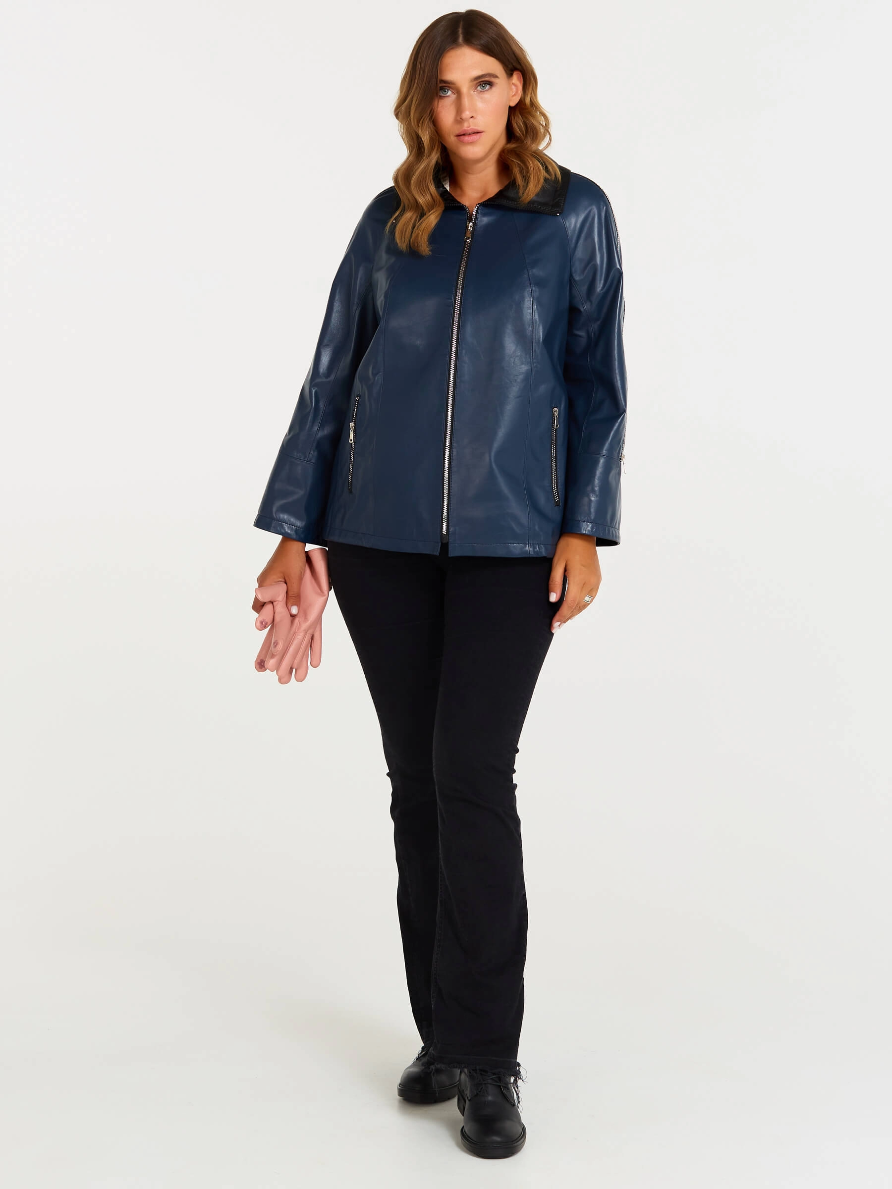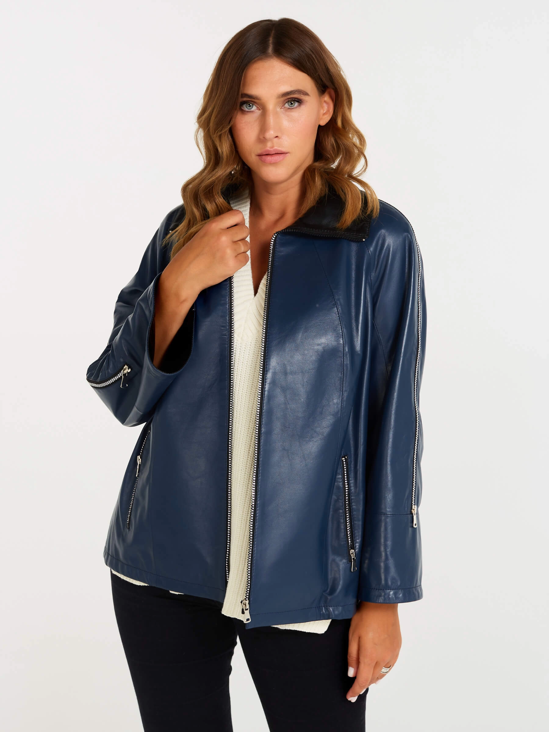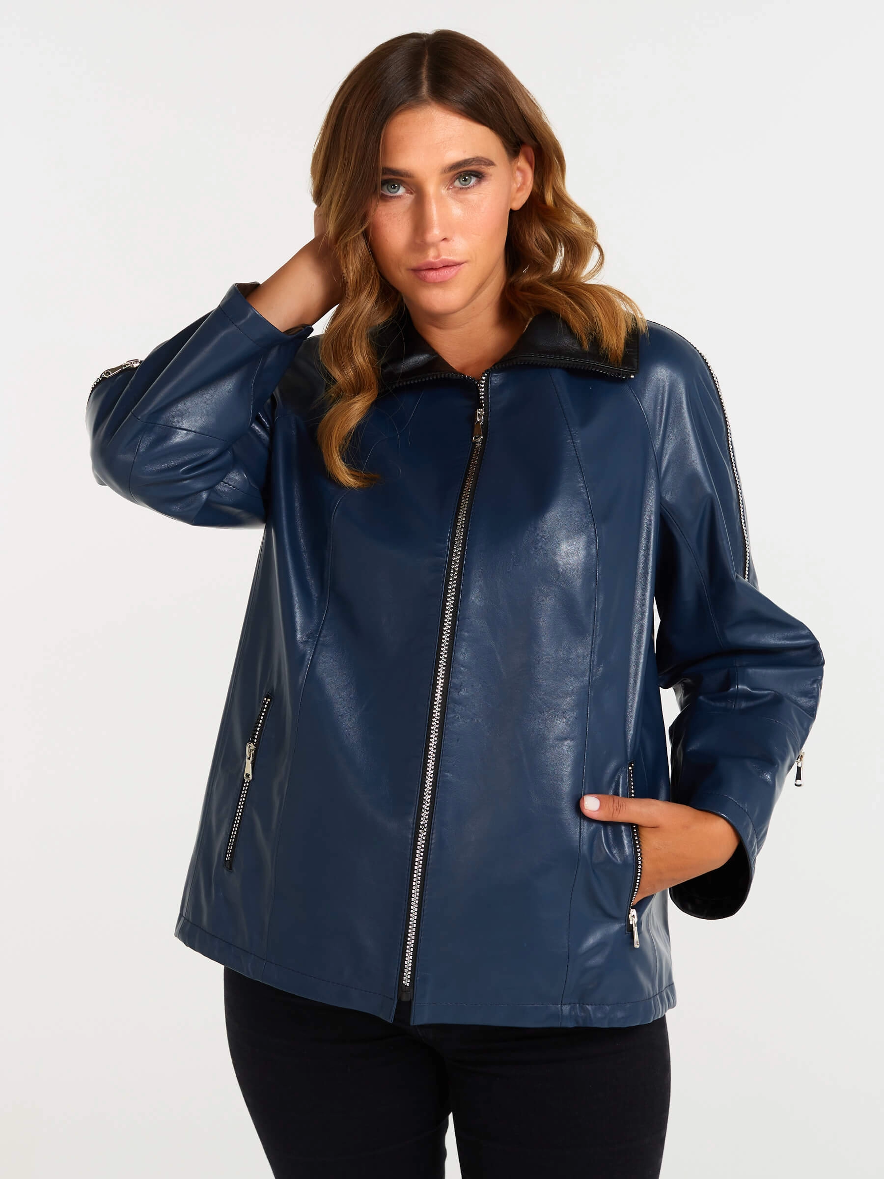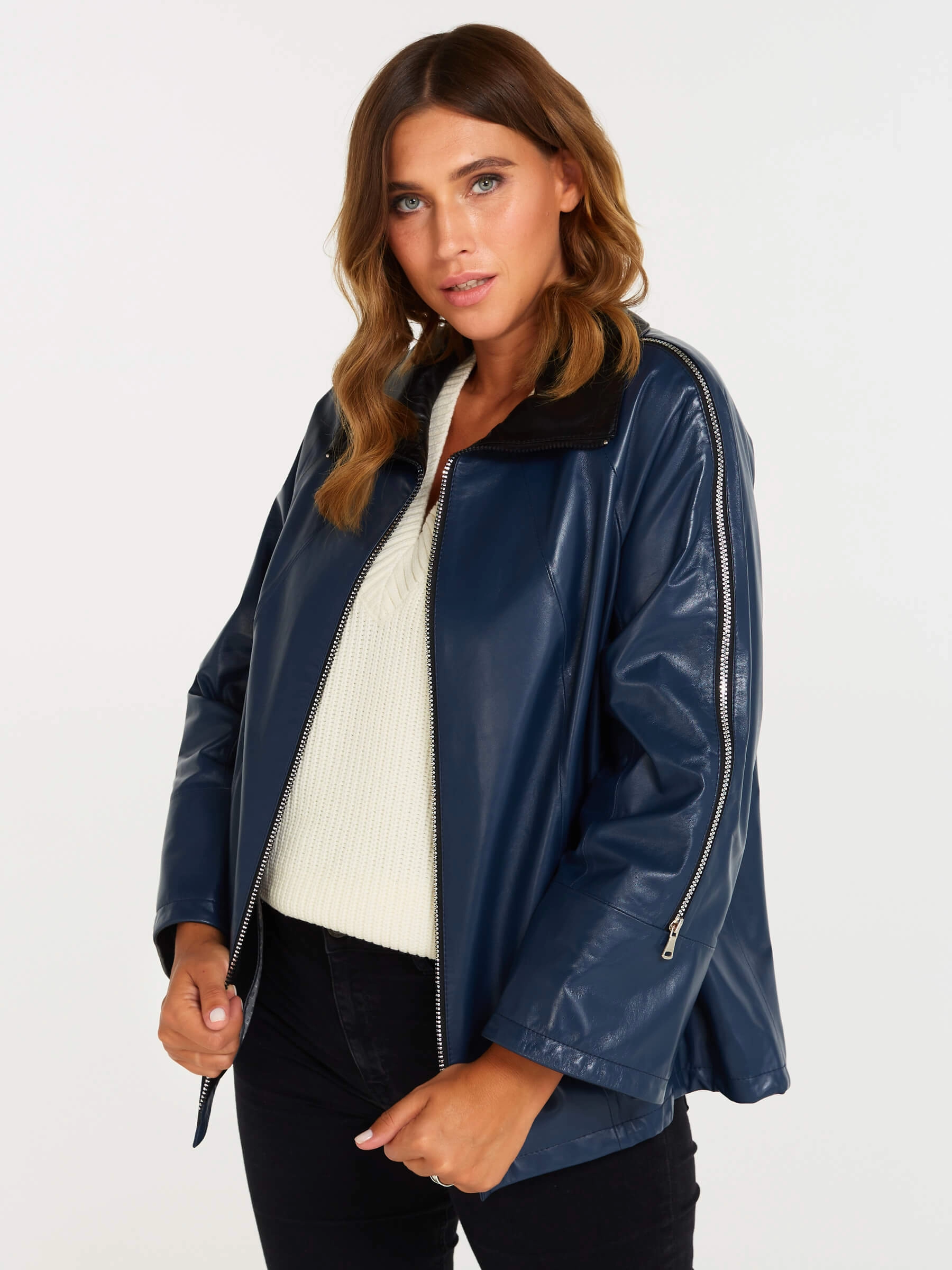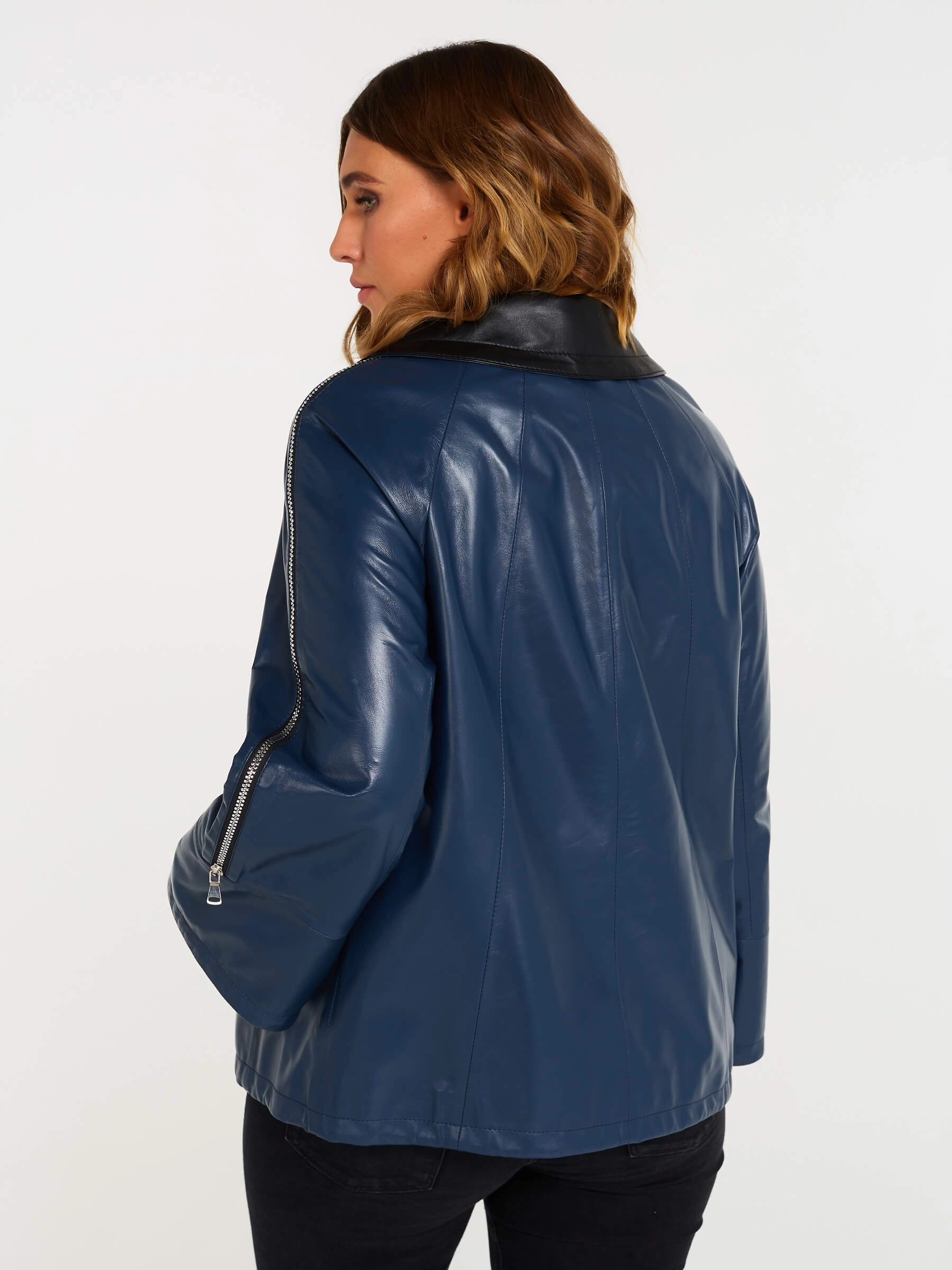 Товар кожаная женская куртка оверсайз 385, синяя, размер 48, артикул 90400 выполнен из натуральной кожи с застежкой молния. Рассчитан на сезон: демисезон. Длина изделия 65 см, силуэт свободный.