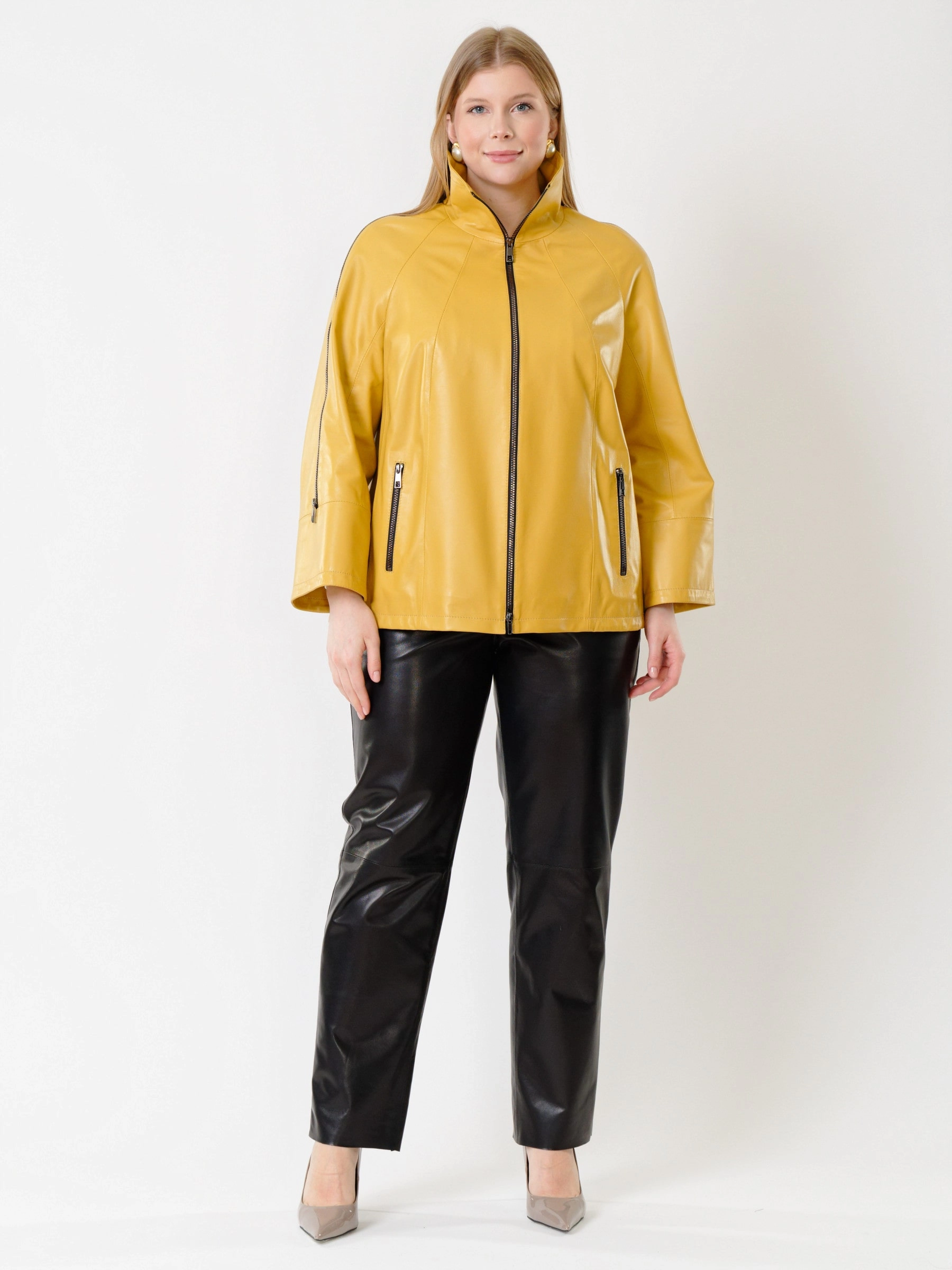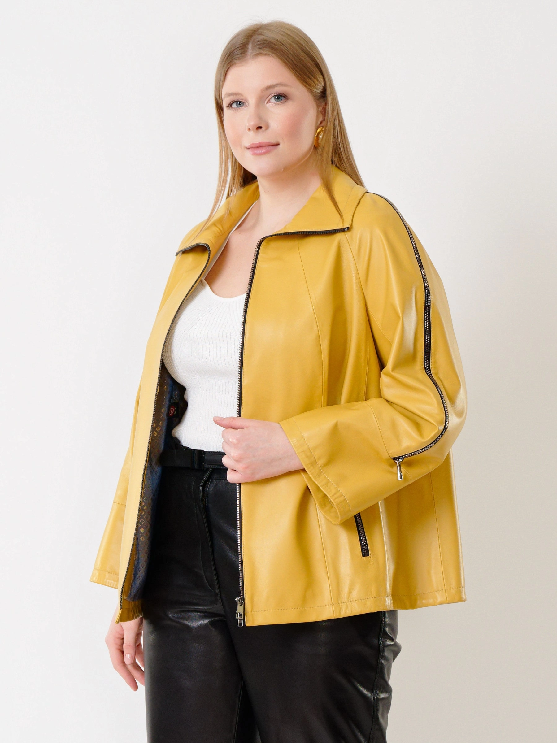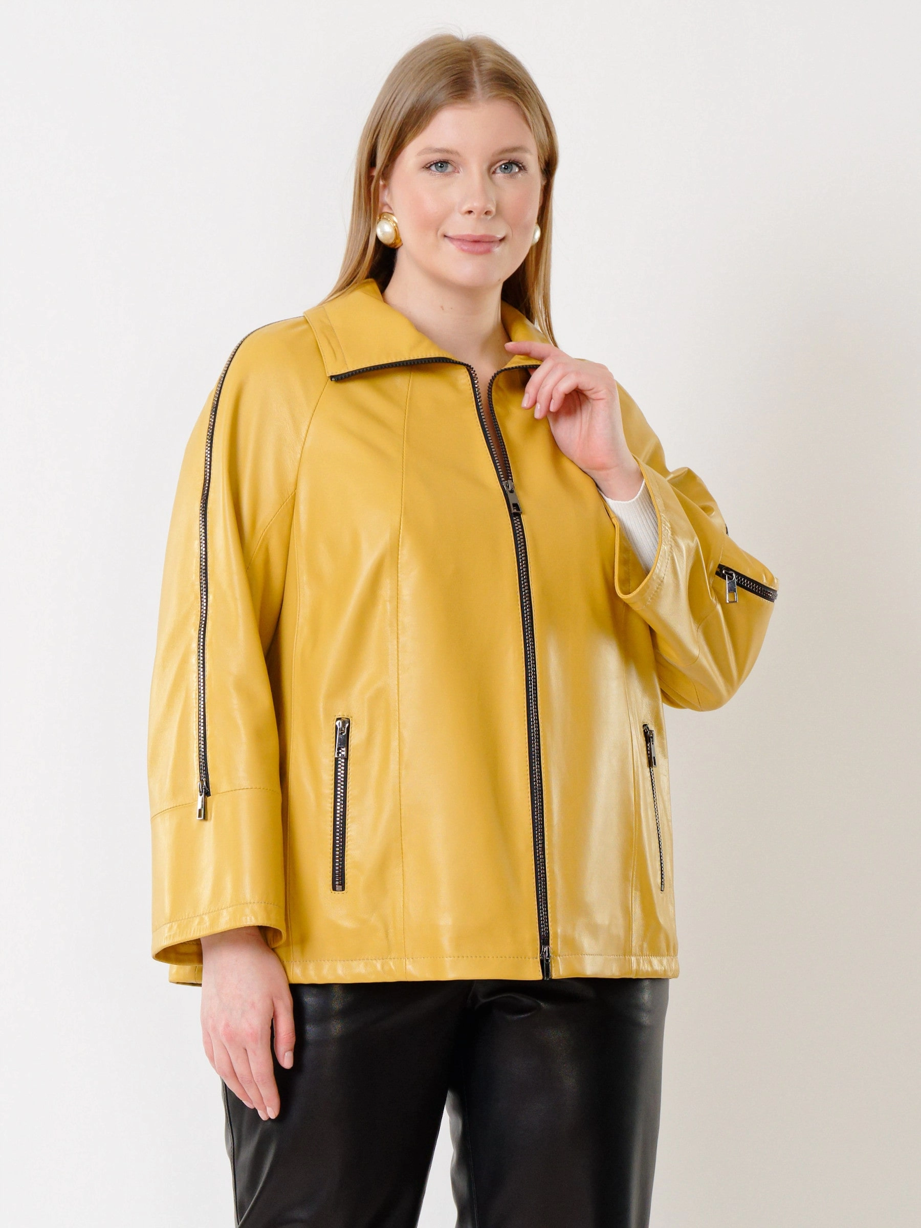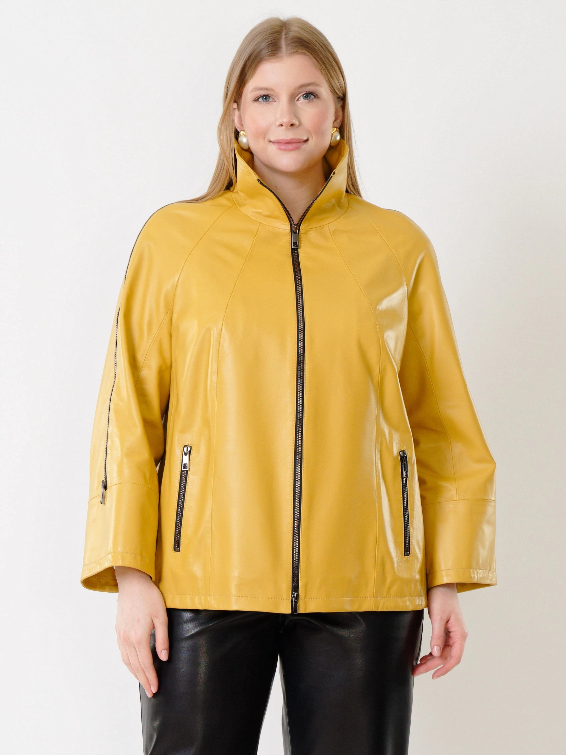Товар кожаная женская куртка оверсайз 385, желтая, размер 52, артикул 91331 выполнен из натуральной кожи с застежкой молния. Рассчитан на сезон: демисезон. Длина изделия 65 см, силуэт свободный.
