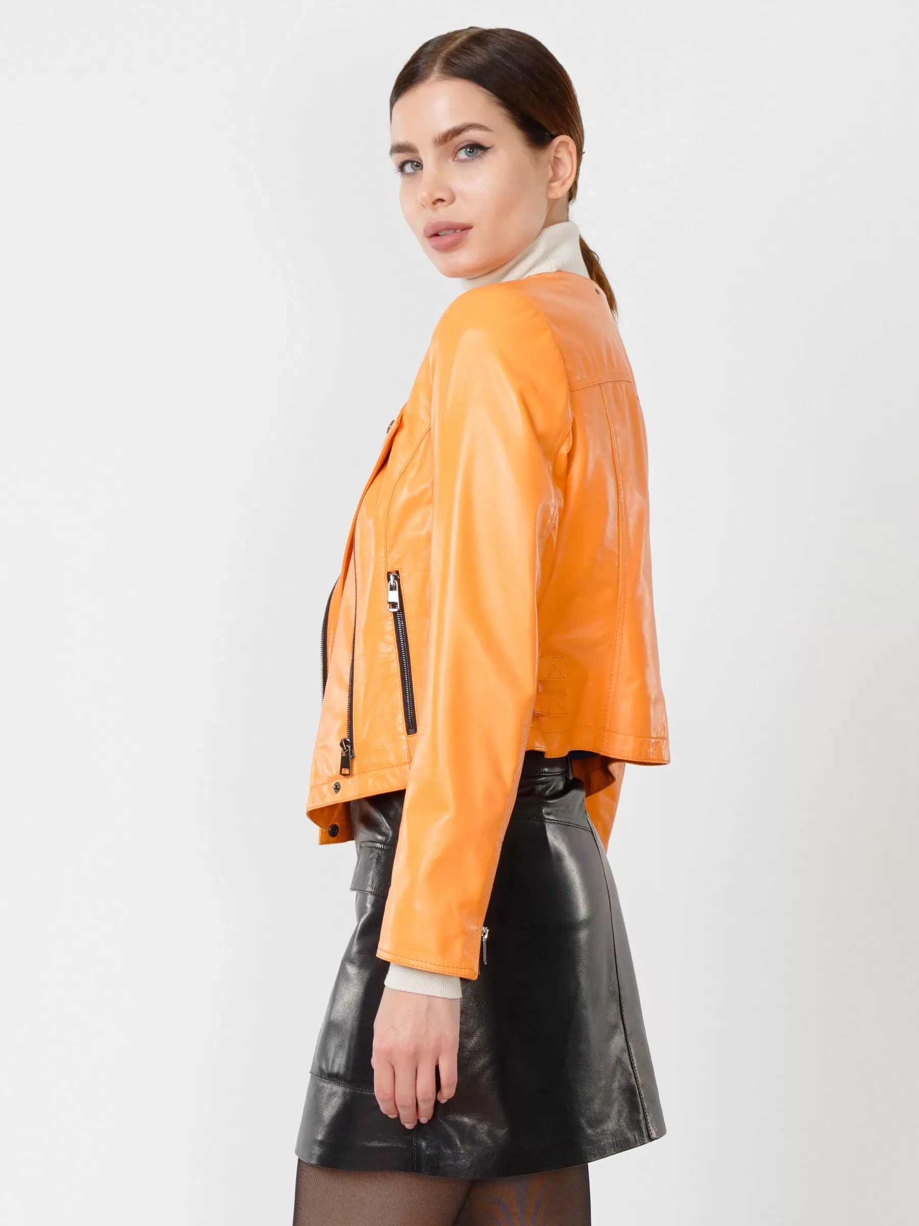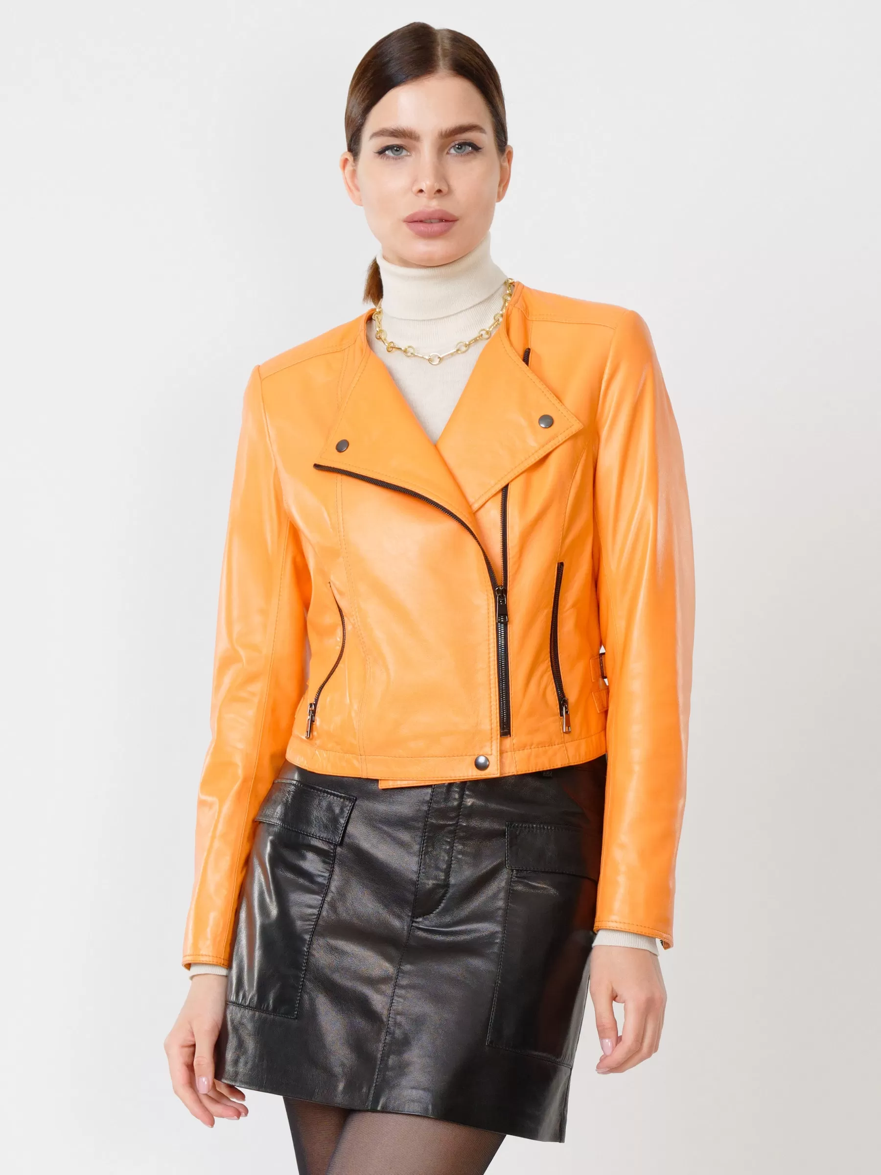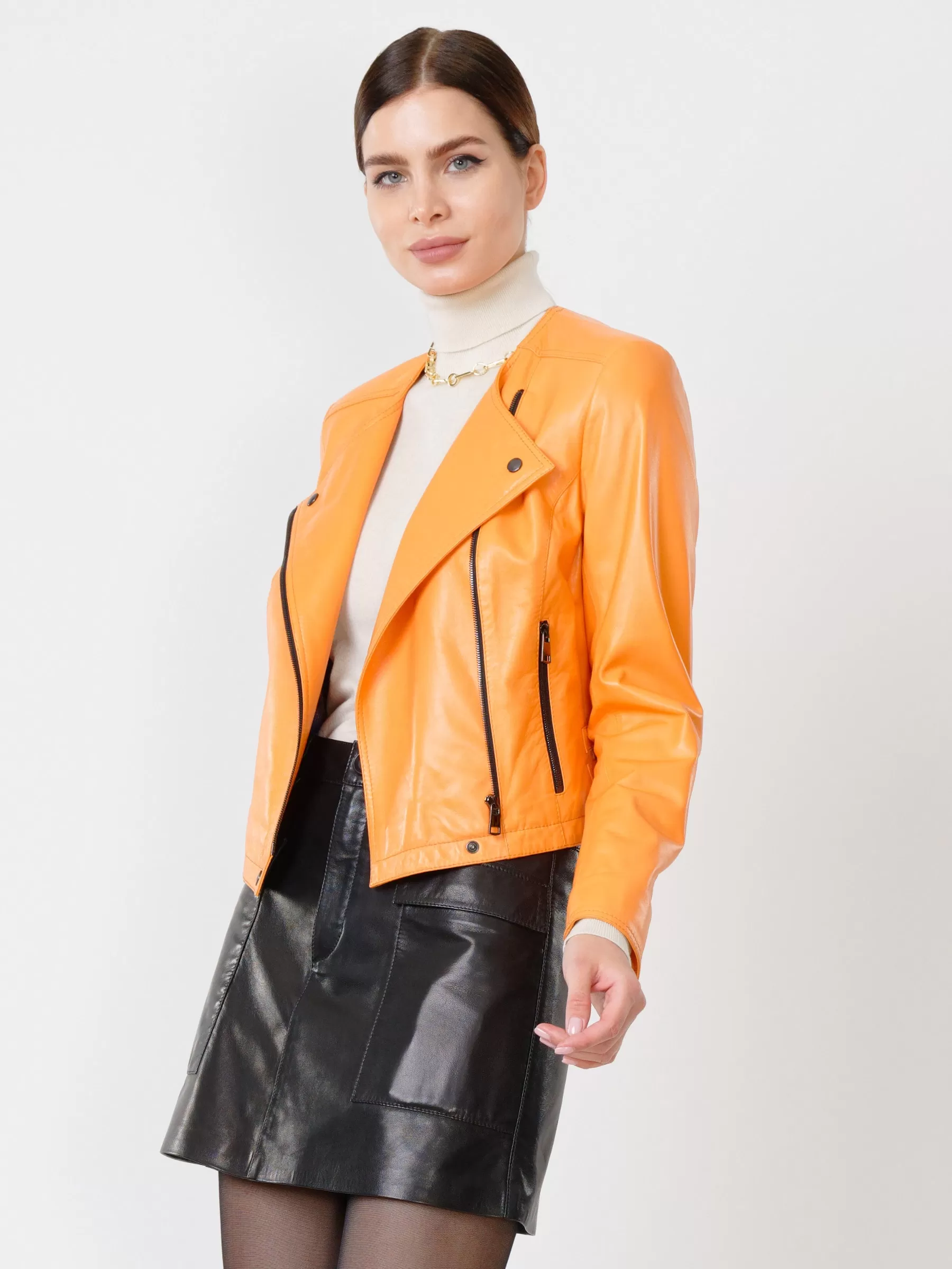 Товар кожаная женская куртка косуха 389, оранжевая, размер 46, артикул 90880 выполнен из натуральной кожи с застежкой молния. Рассчитан на сезон: весна-лето. Длина изделия 45 см, силуэт полуприлегающий.