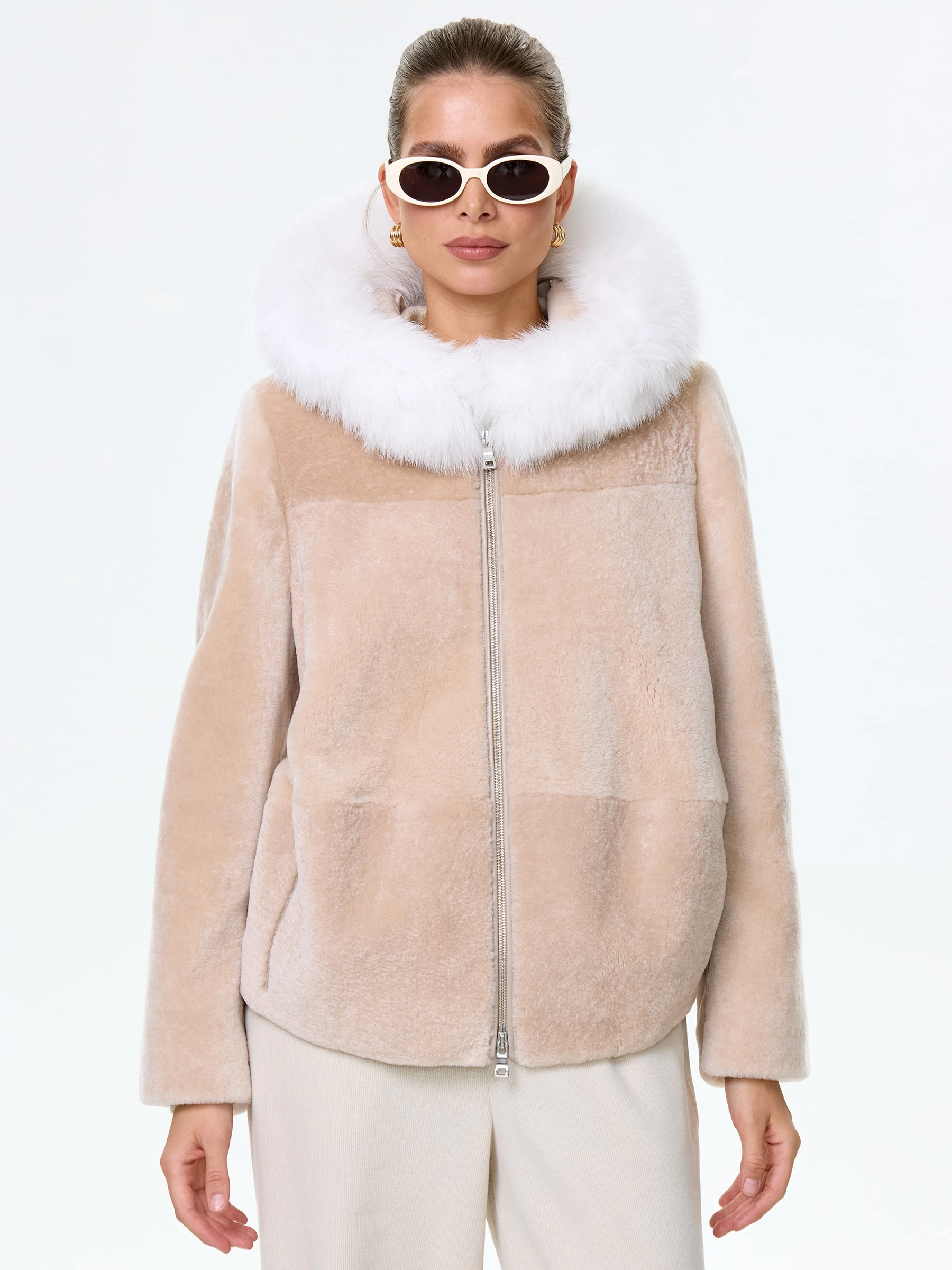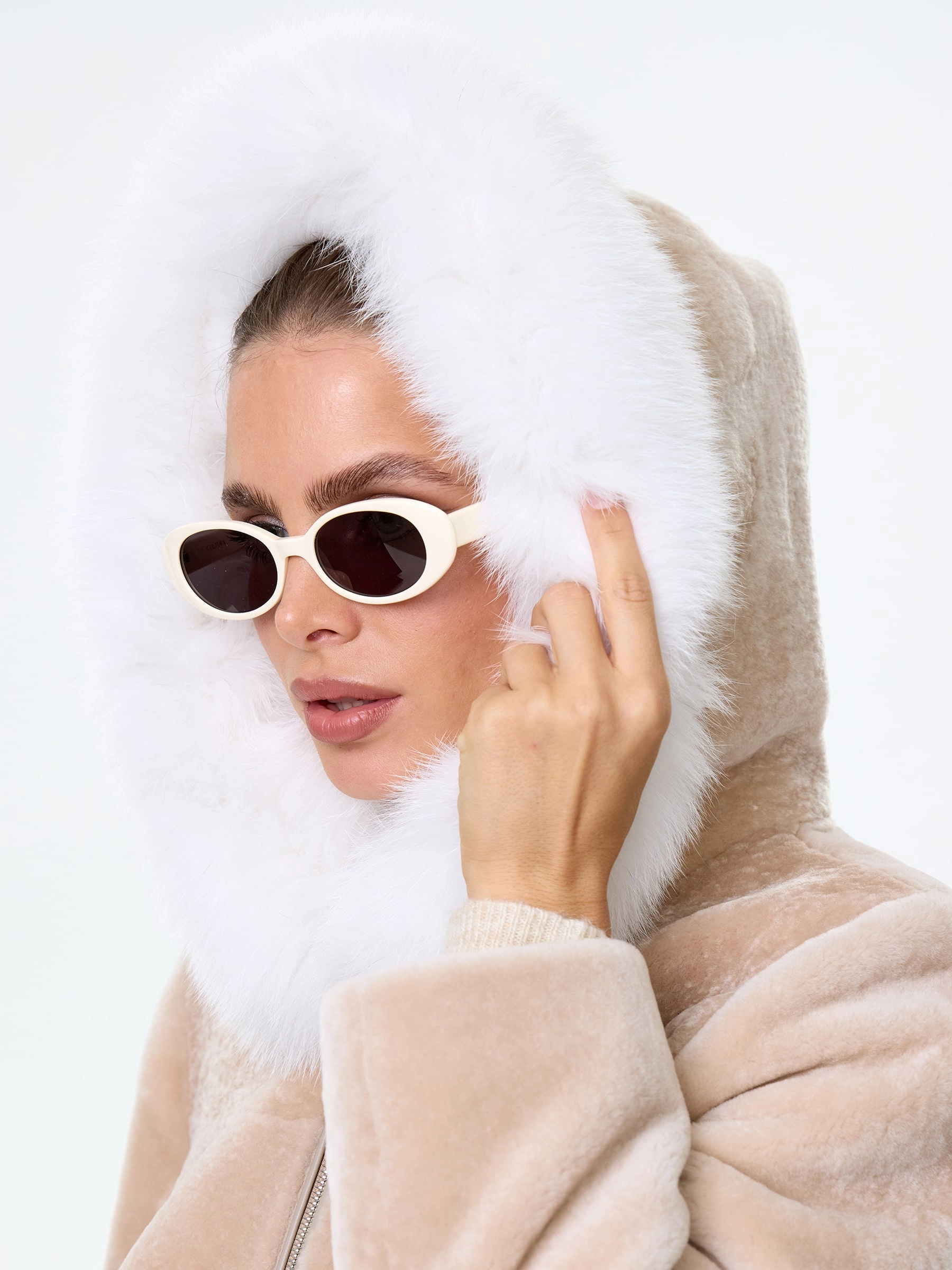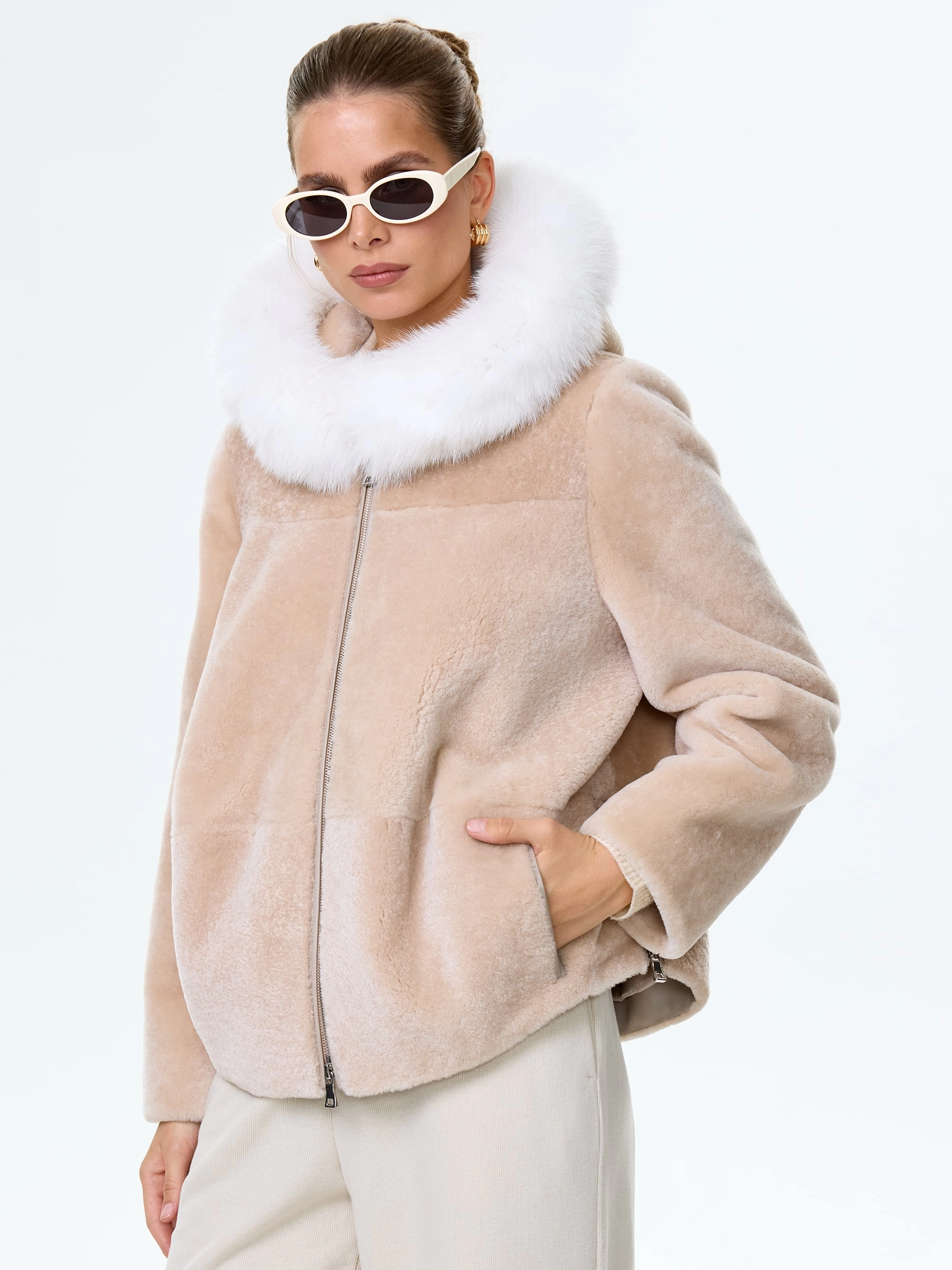 Короткая женская дубленка из астрагана с капюшоном и отделкой мехом песца 48мех, бежевая, размер 46, артикул 17581