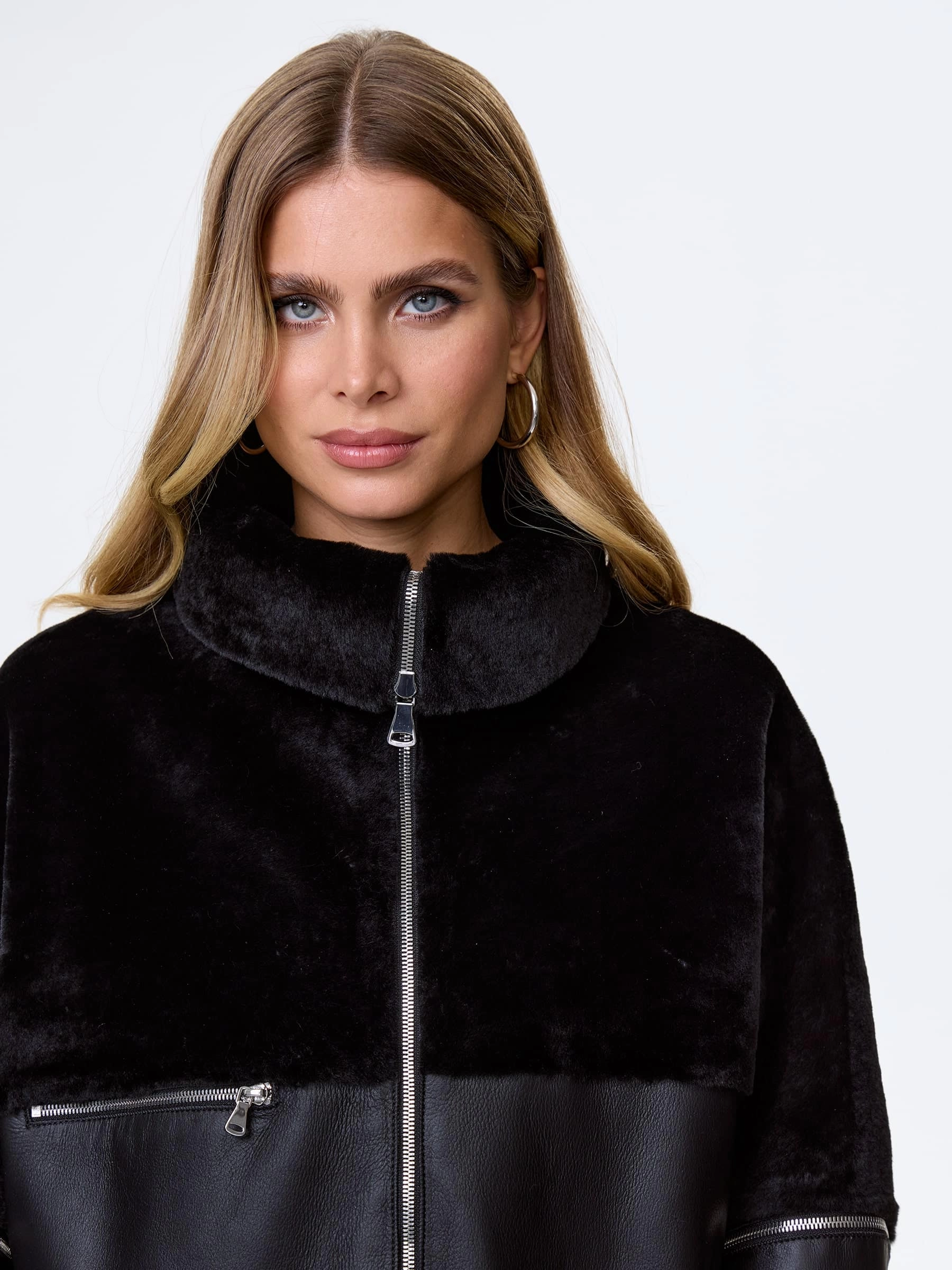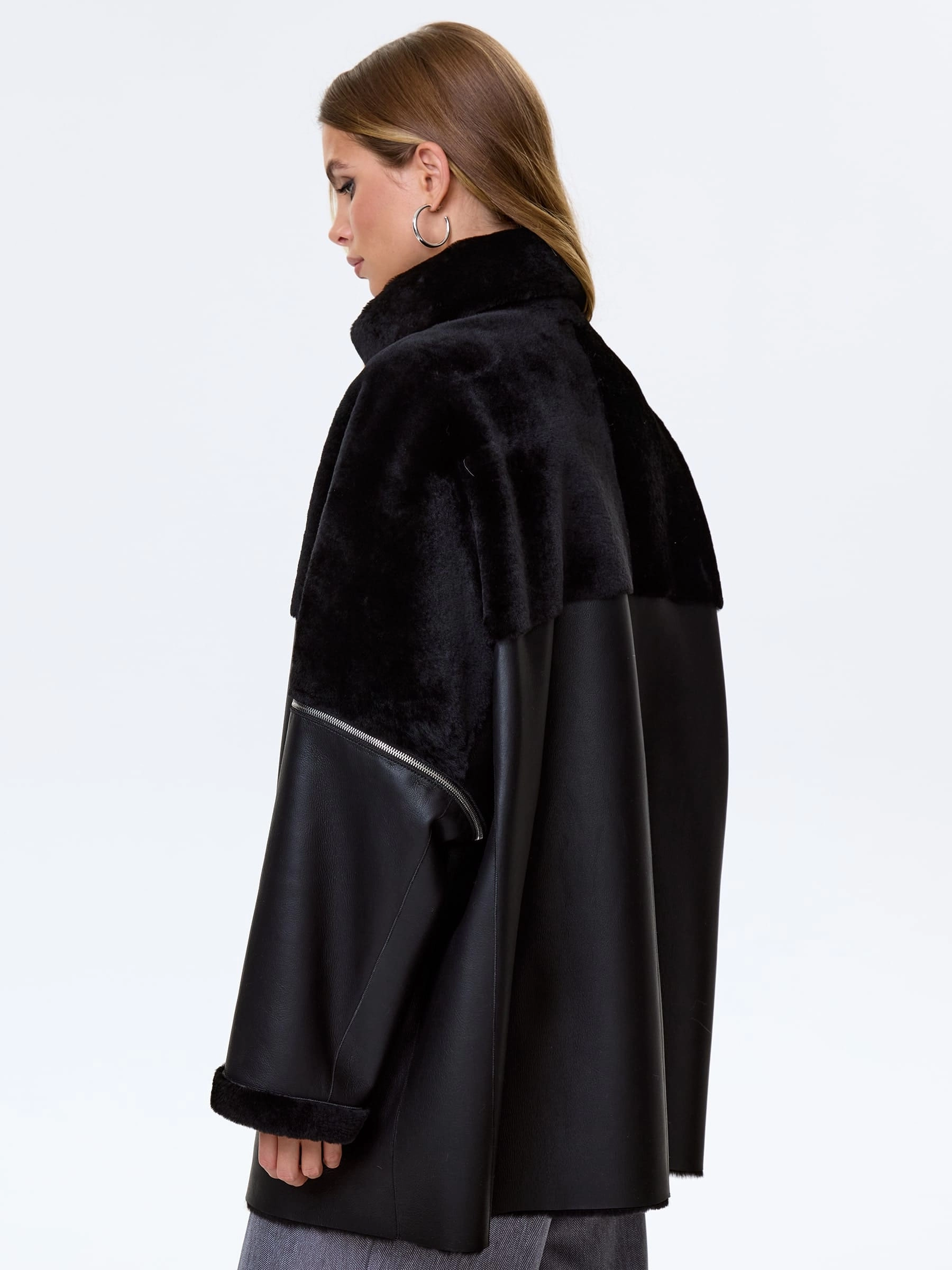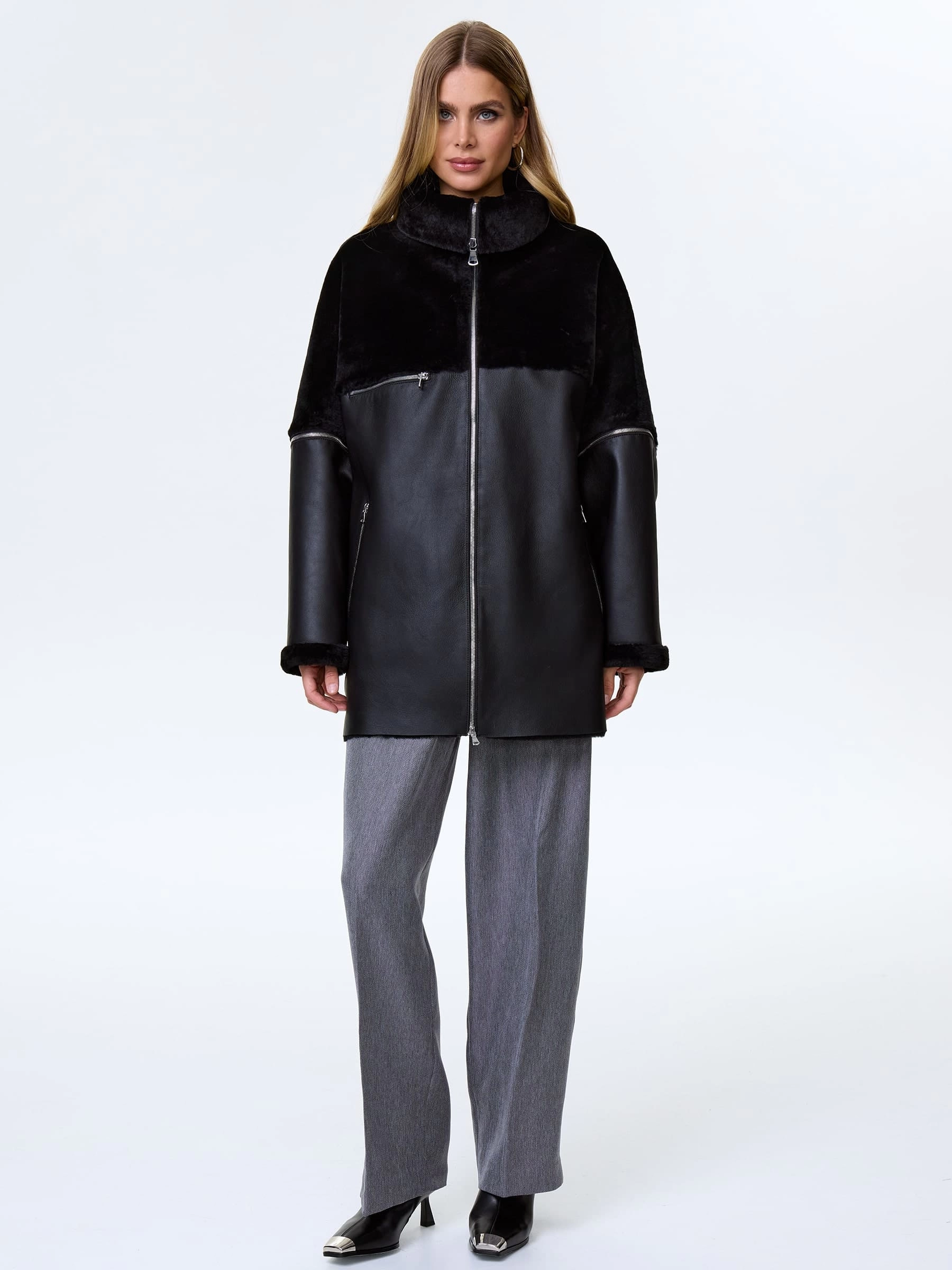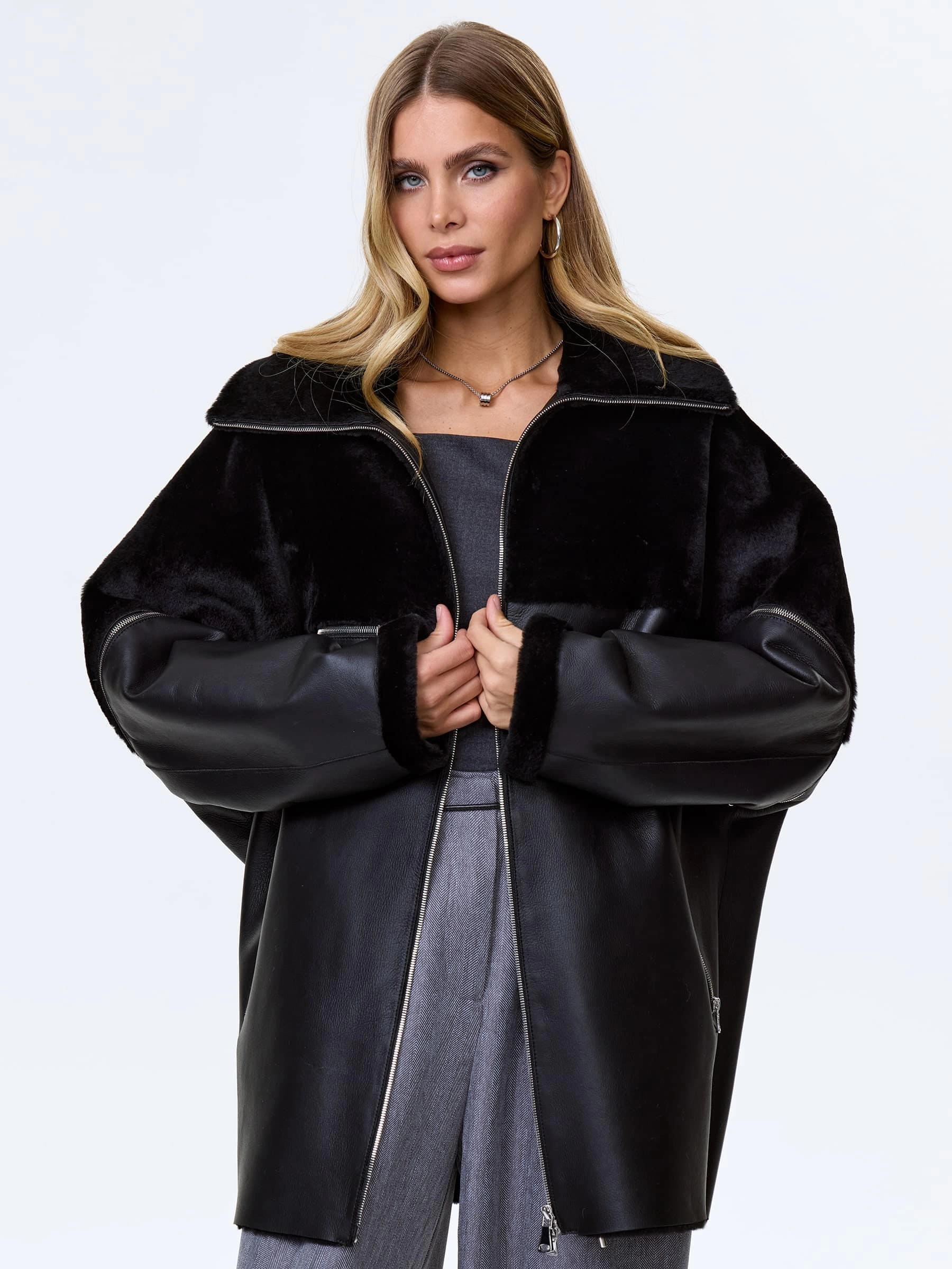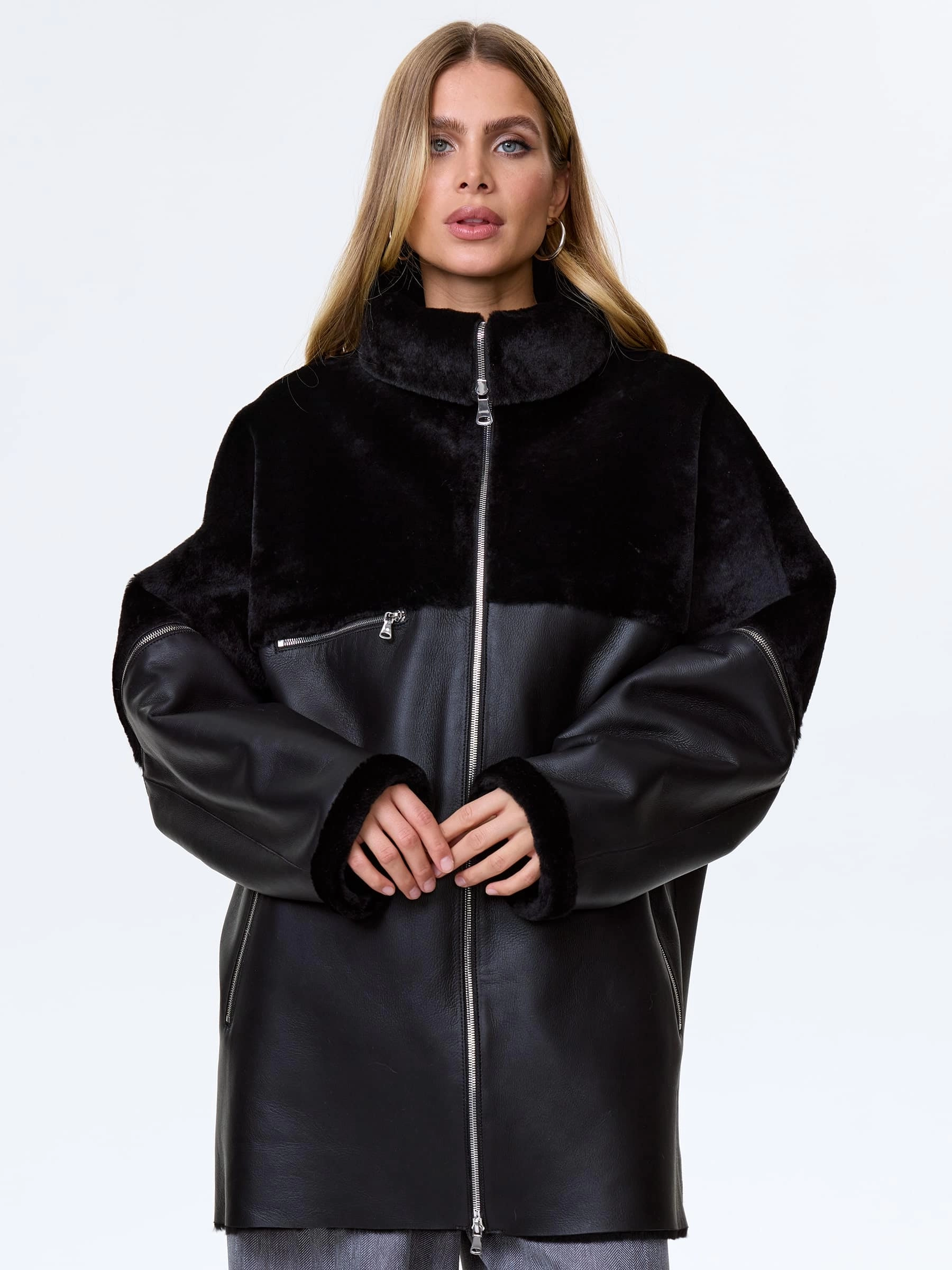 Дубленку свободного кроя выполнили из стриженой овчины премиум класс. Свободный крой позволяет ощутить полный комфорт изделия. Воротник- стойка трансформируется в отложной. Отстегивающиеся рукава. Карманы как и сама модель застегиваются молниями.