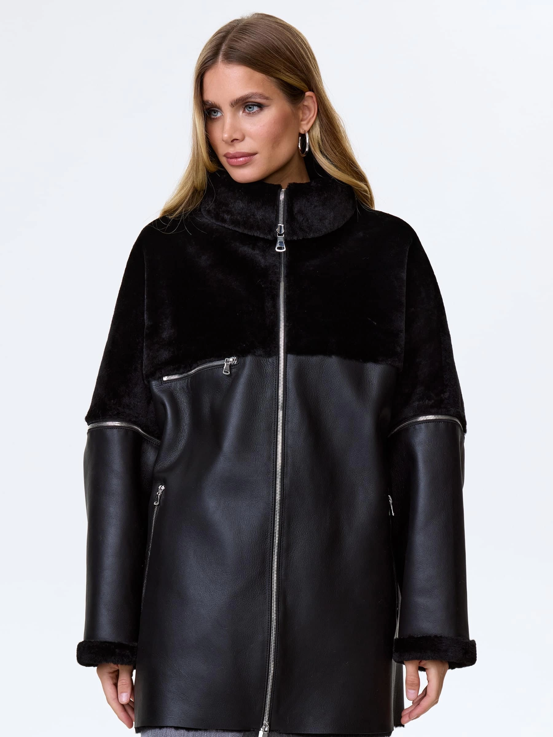 Товар молодежная дубленка оверсайз для женщин премиум класса 2051, черная, размер 48, артикул 64160 выполнен из овчина "мерино" с застежкой молния. Рассчитан на сезон: осень-зима. Длина изделия 80 см, силуэт свободный.