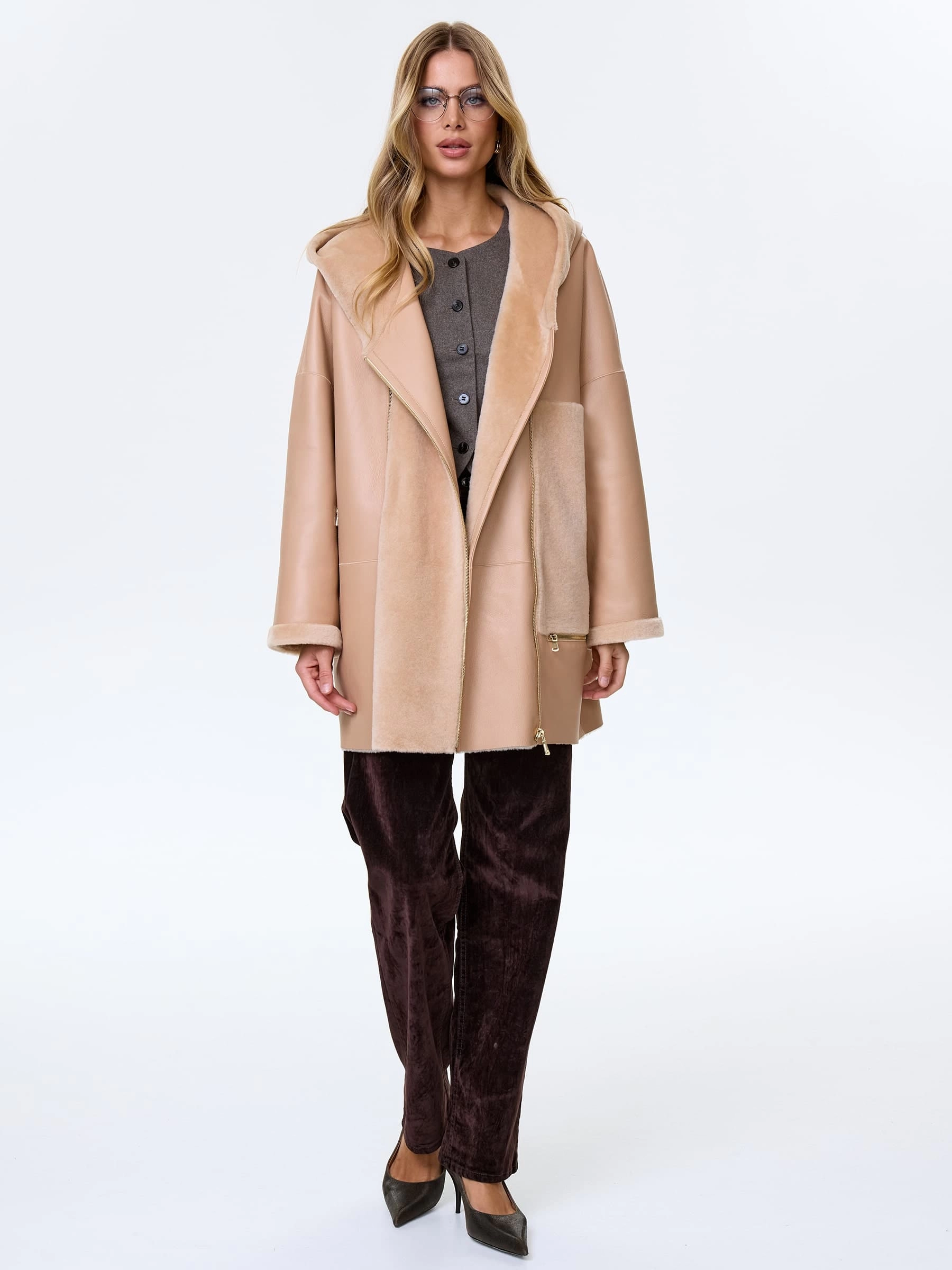 Молодежная комбинированная женская дубленка с капюшоном премиум класса 2056, бежевая, размер 48, артикул 64130