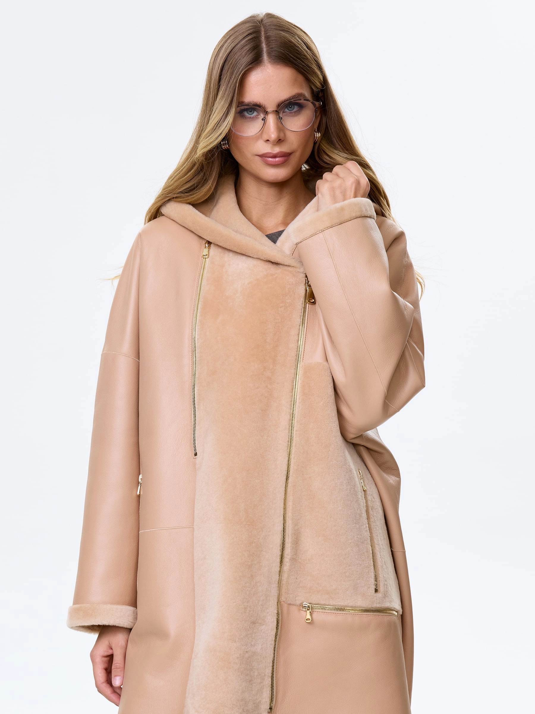 Товар молодежное полупальто из натуральной овчины для женщин с капюшоном премиум класса 2056, бежевое, размер 48, артикул 64350 выполнен из овчина "мерино" с застежкой молния. Рассчитан на сезон: осень-зима. Длина изделия 81 см, силуэт свободный.