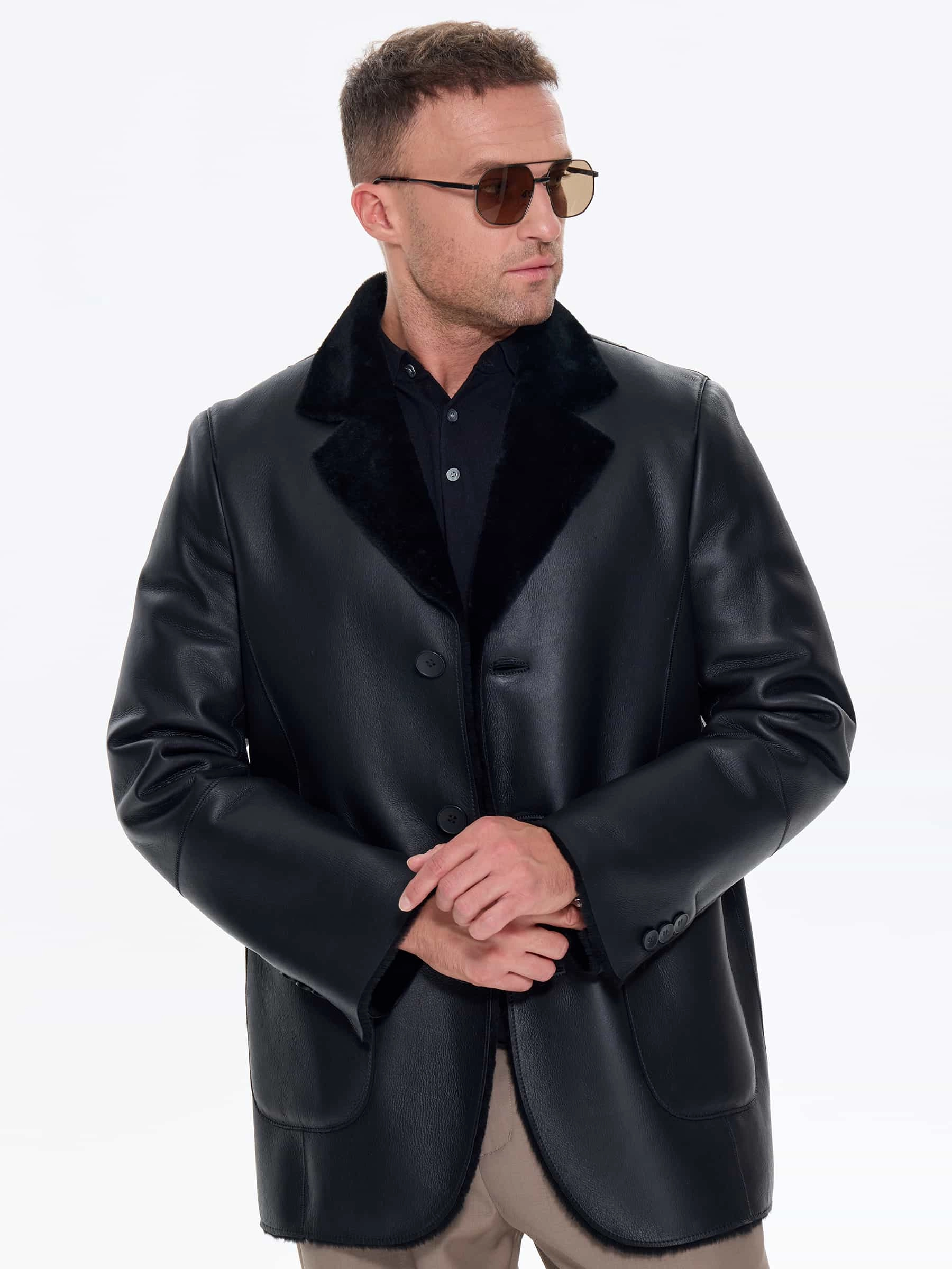 Мужская дубленка пиджак премиум класса 443, черная, размер 48, артикул 41210