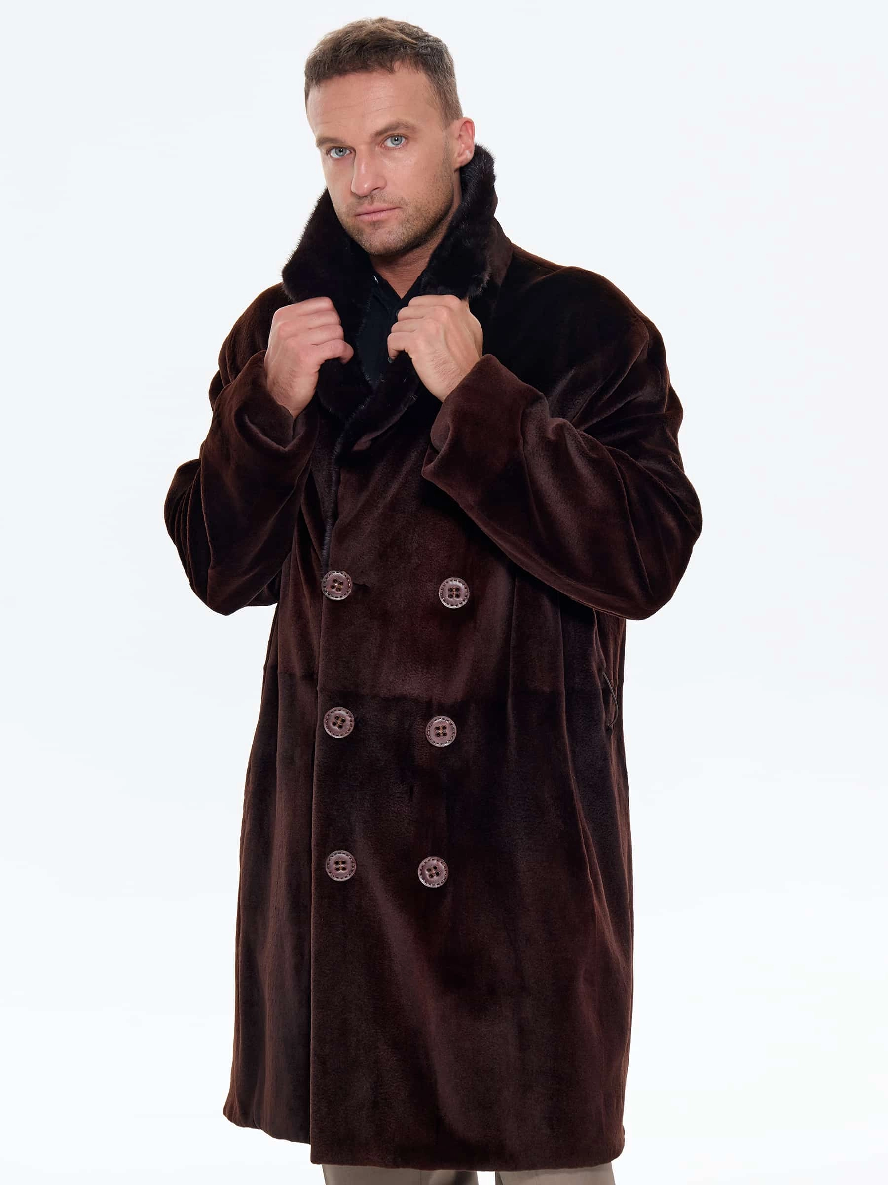 Для пошива двубортного мужского полупальто использовали щипаный мех норки с благородным матовым блеском. Прямой крой, английский воротник, два врезных и два внутренних кармана. Длина миди создают образ мужчины, для которого качество — не компромисс. Удобно в авто, общественном транспорте, при ходьбе. Максимальная защита от ветра и мороза. Изменить силуэт поможет широкий пояс. Застежка: крупные пуговицы.