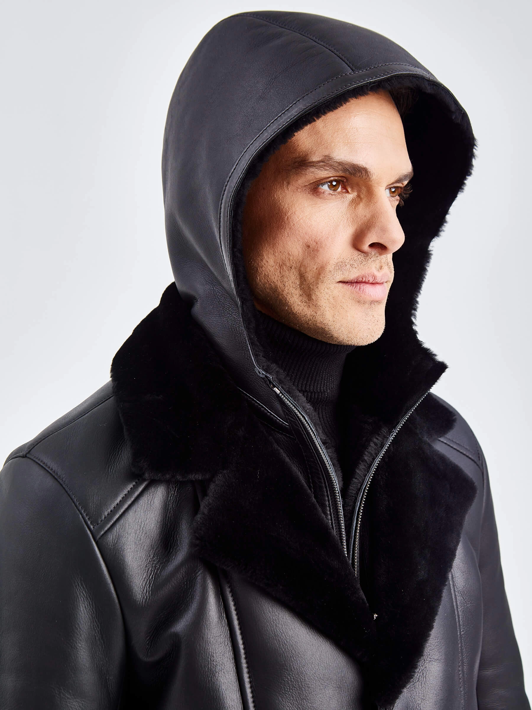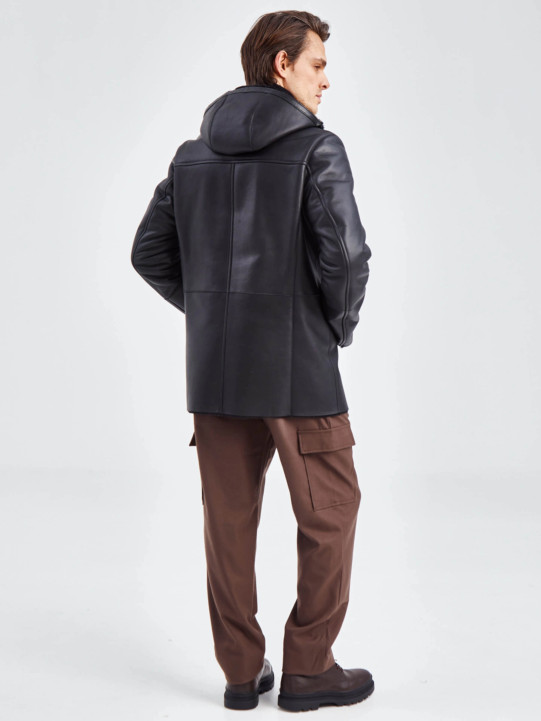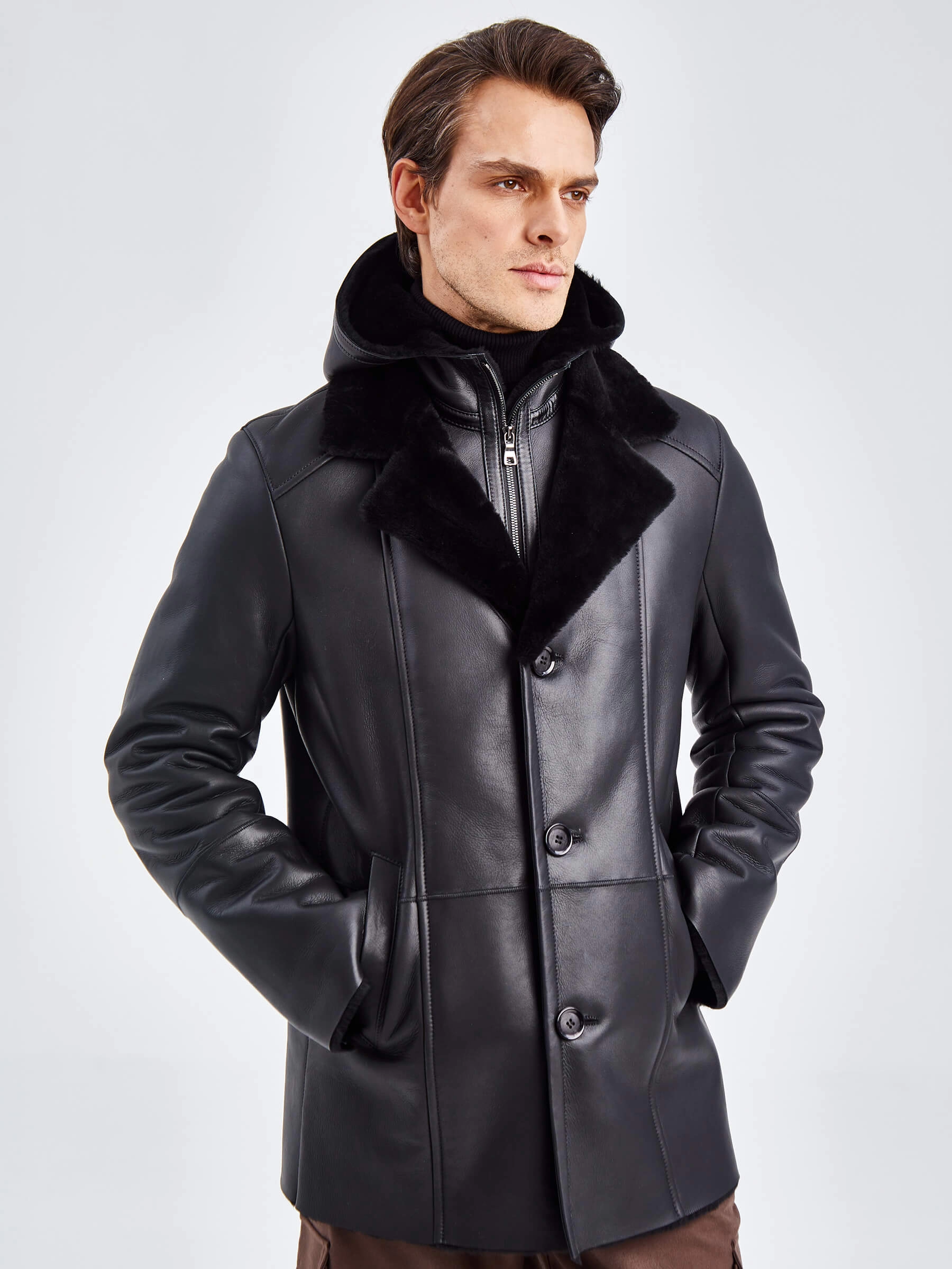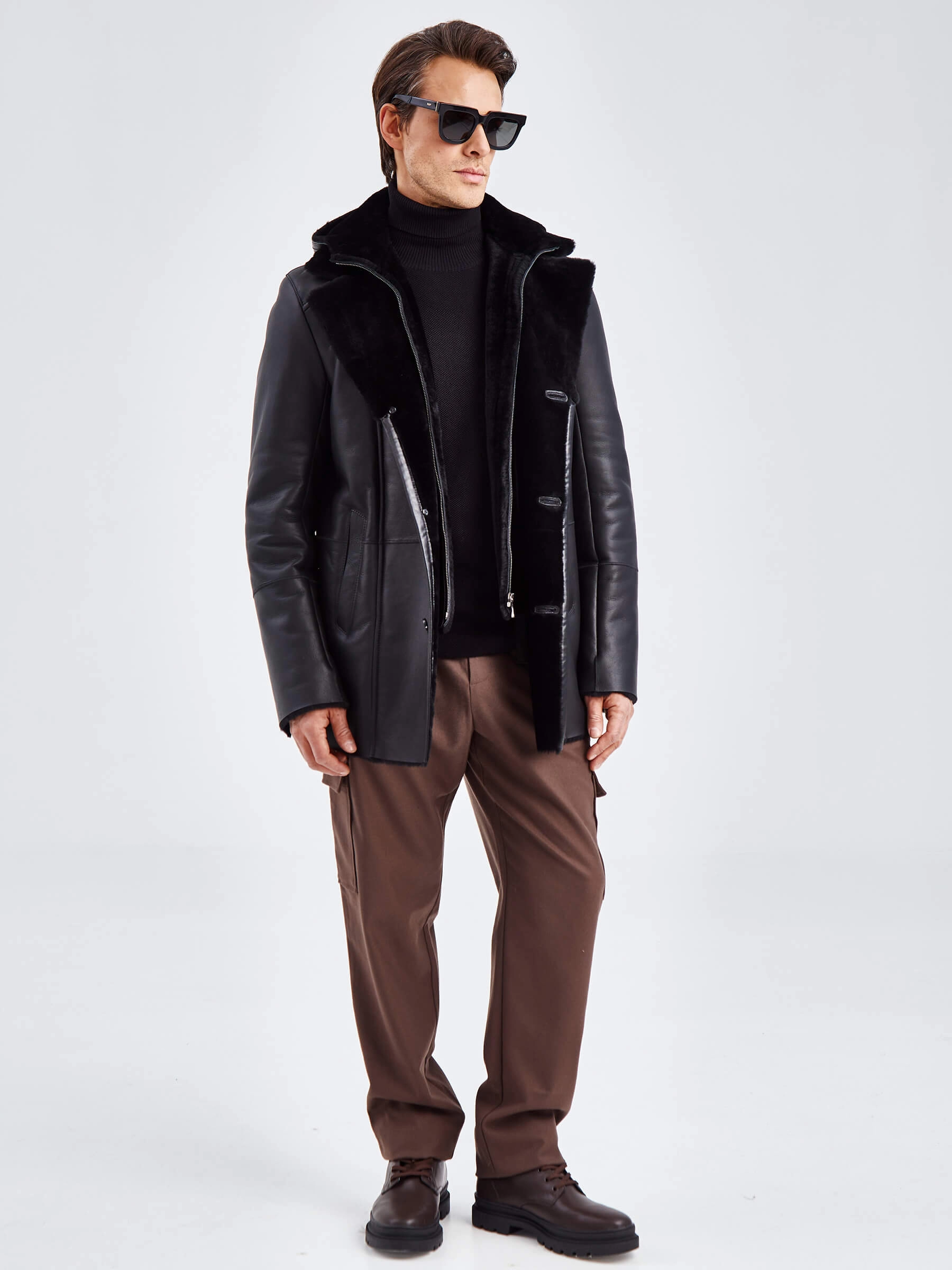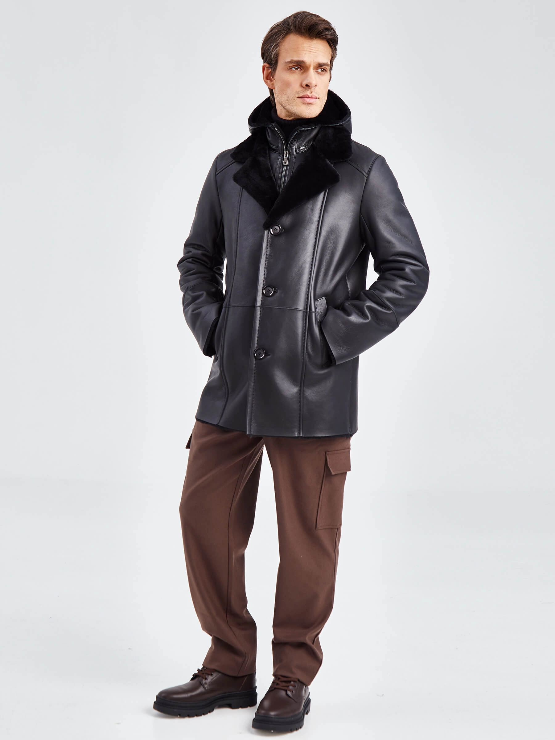 Мужская классическая дубленка премиум класса со съемным капюшоном 436, черная, размер 48, артикул 71450