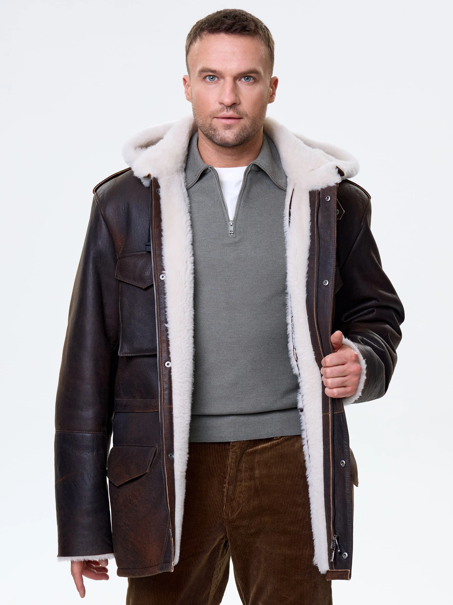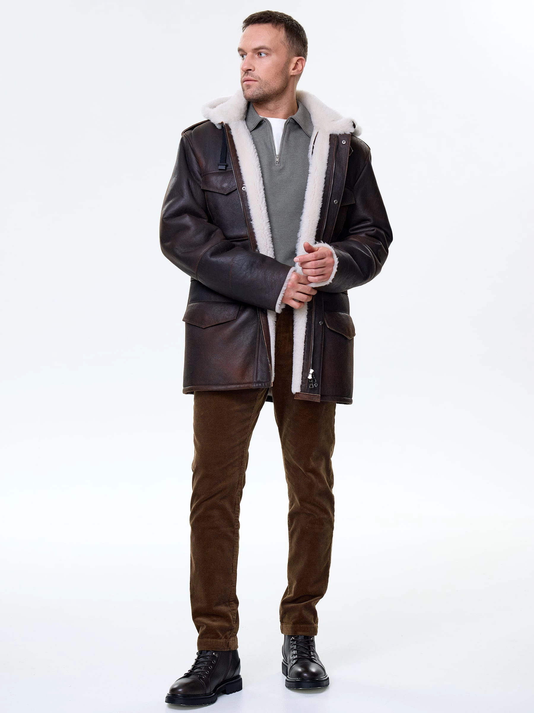 Мужское полупальтов стиле милитари из коричневой плотной овчины. Изделие имеет невысокий воротник-стойку с застежкой в виде паты с квадратной пряжкой, а также четыре вместительных кармана. Потайная застежка на молнии, внутри модели пояс-кулиска.