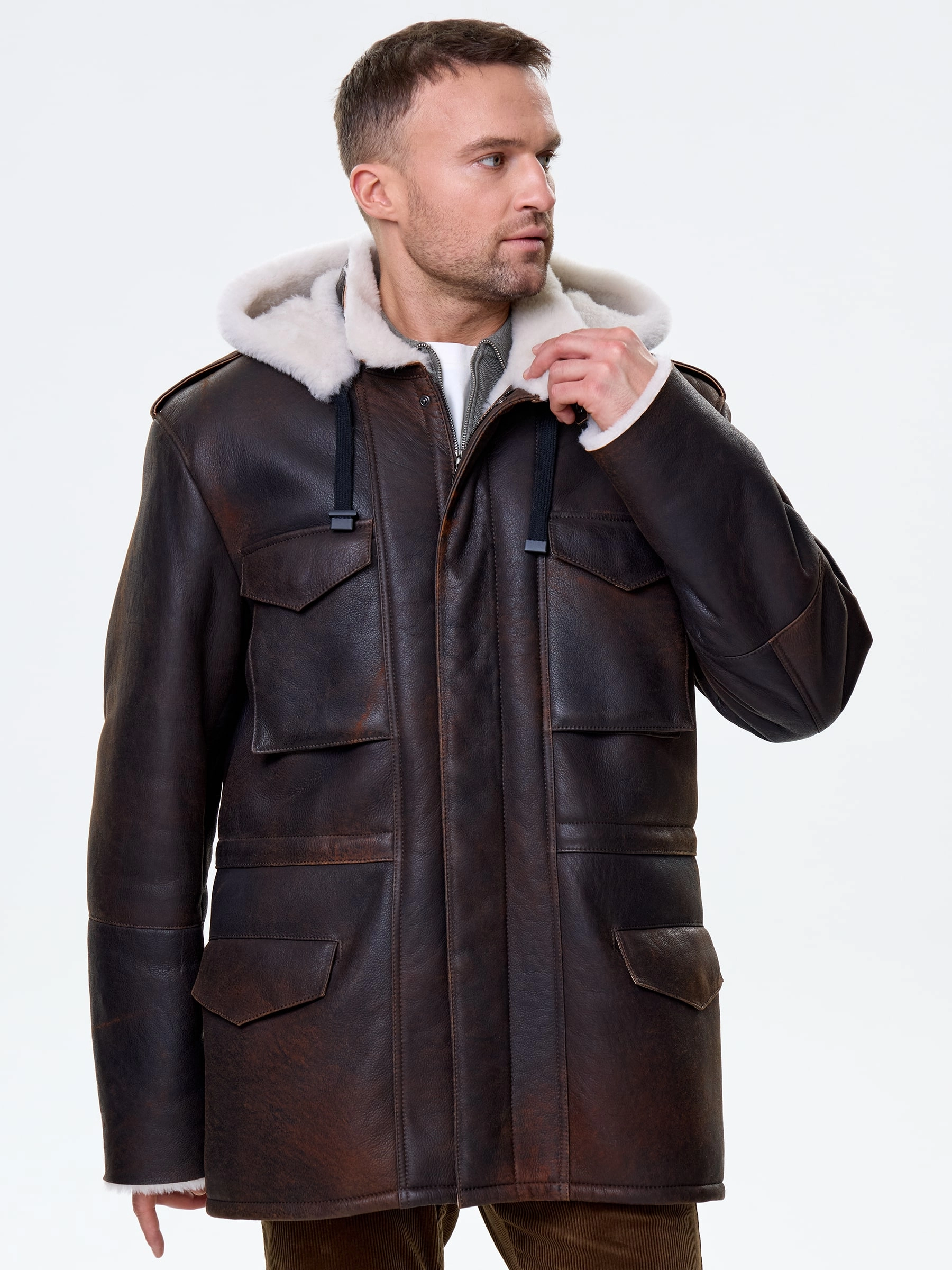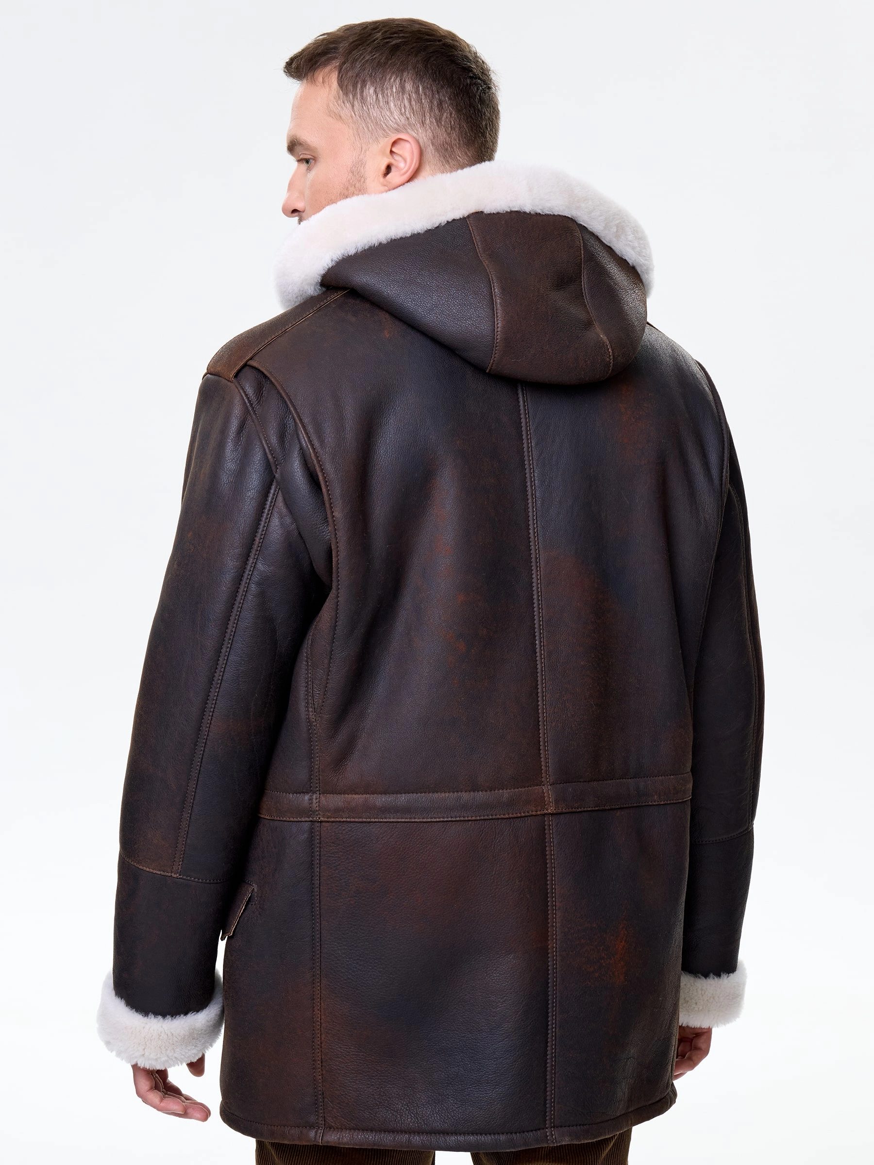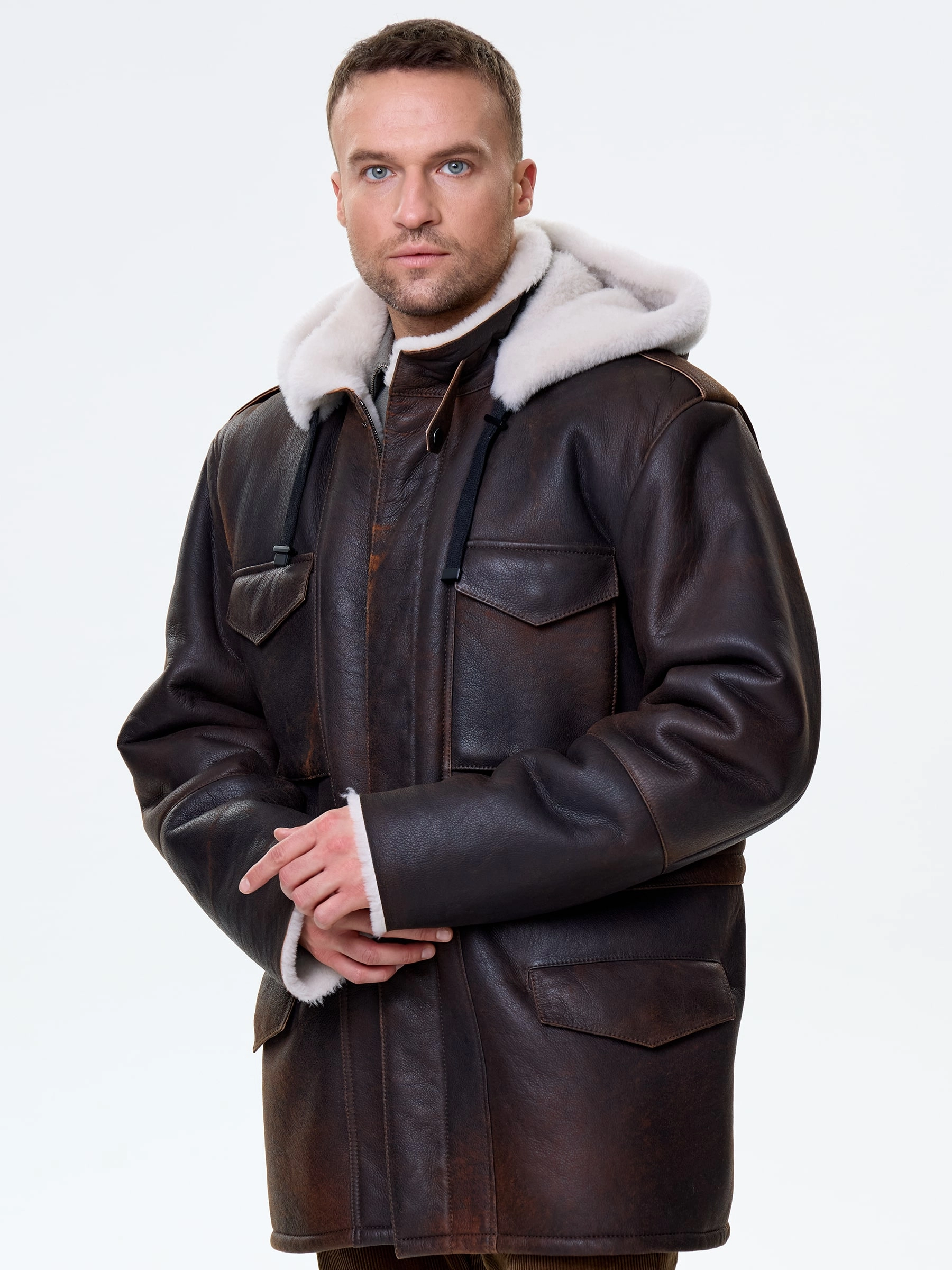 Товар мужское полупальто из натуральной овчины с капюшоном премиум класса 433, коричневая, размер 48, артикул 72000 выполнен из овчина "мерино" с застежкой молния. Рассчитан на сезон: осень-зима. Длина изделия 81 см, силуэт прямой.