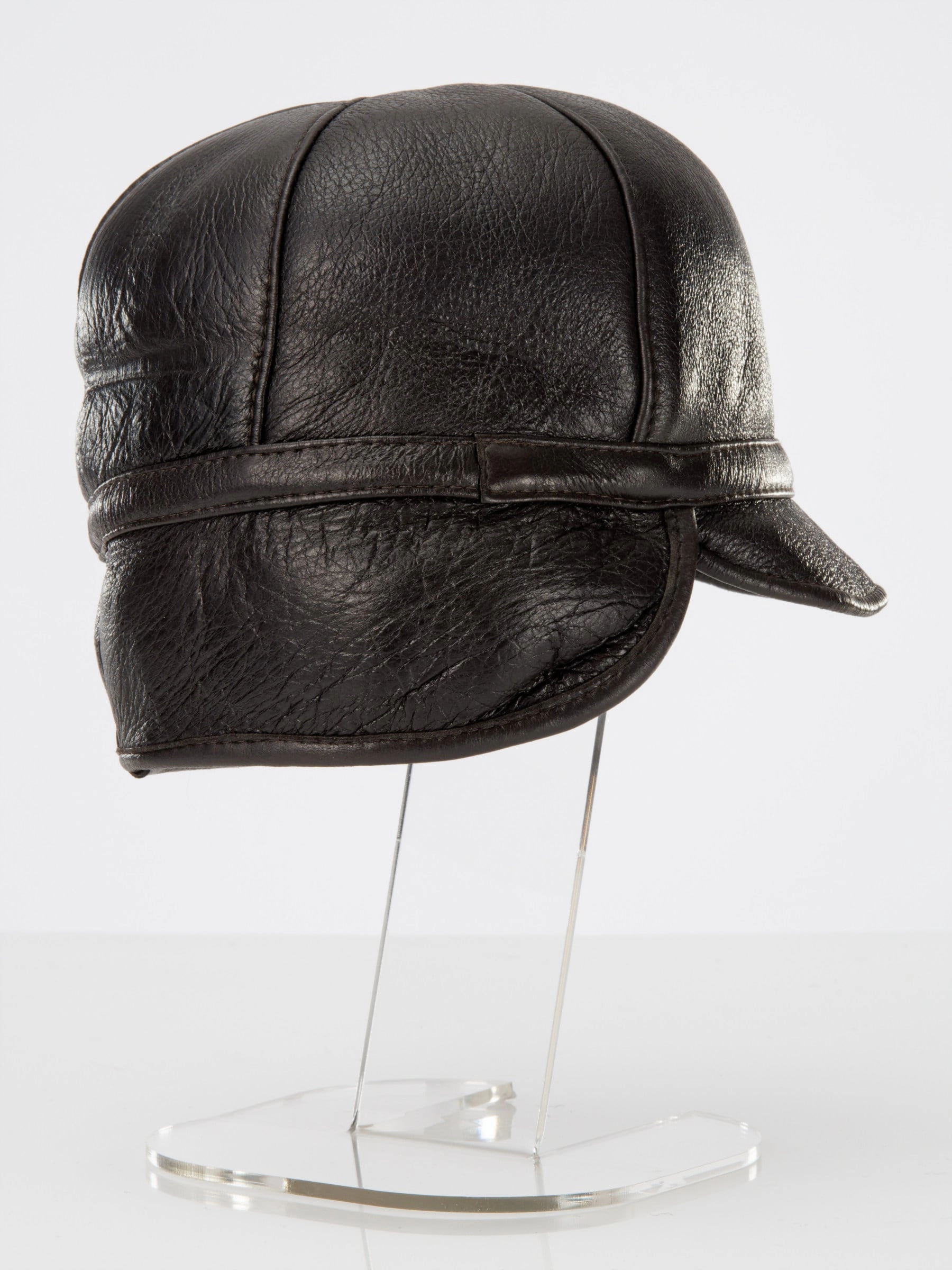 Мужской головной убор выполнен из меха натуральной овчины. Все тыльные части , козырек и тулья выполнены из натуральной мягкой дубленочной кожи. Модель имеет ветрозащитный меховой отворот, который фиксируется кнопками.