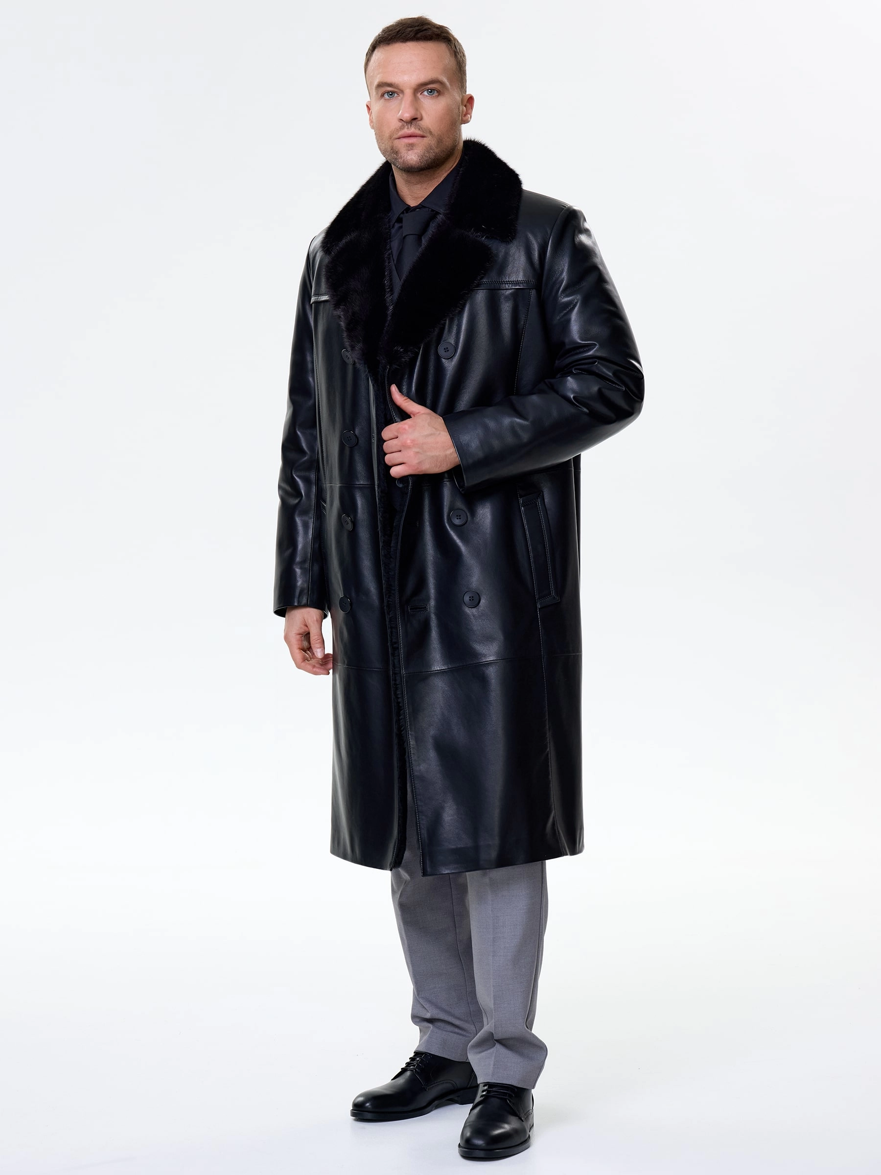 Товар мужской зимний кожаный плащ с норковым воротником премиум класса 563мех, черный, размер 48, артикул 41120 выполнен из натуральной кожи с застежкой пуговицы. Рассчитан на сезон: осень-зима. Длина изделия 115 см, силуэт прямой.