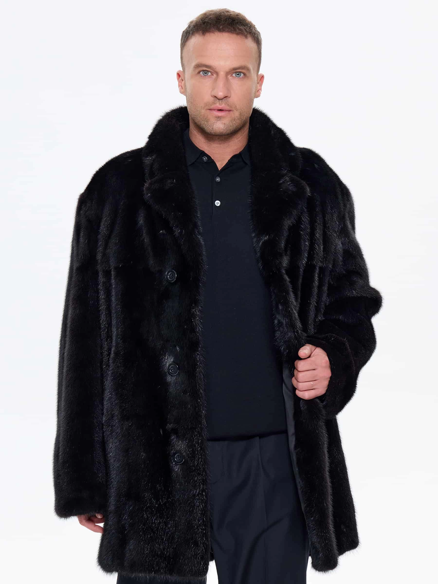 Классическую мужскую шубу выполнили из щипаной норки премиум-класса. Бархатистая поверхность без остевого волоса, мягкий ворс. Прямой крой, комфортная посадка по фигуре. Строгий английский воротник защищает от ветра, совместим с галстуком и шарфами Модель имеет два боковых врезных кармана, два внутренних. Универсальная длина модели закрывает бедра, подходит для офиса, мероприятий, города. Для свободы шага предусмотрена невысокая шлица сзади. Изделие великолепно сохраняет тепло в холодную зиму. Застежка: пуговицы.