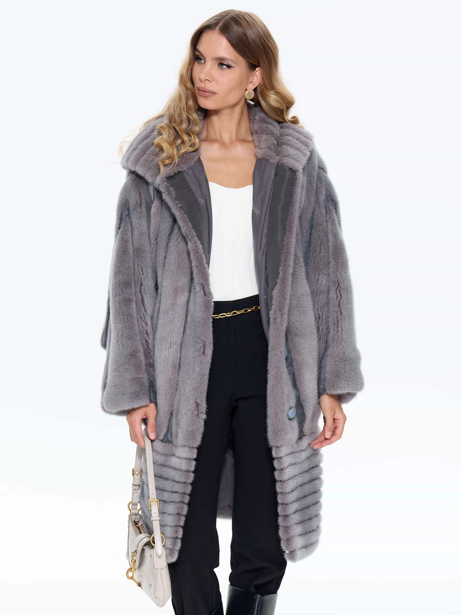 Товар норковая женская шуба braschi elm 042, серая, размер 46, артикул 34440 выполнен из норка с застежкой пуговицы. Рассчитан на сезон: зима. Длина изделия 98 см, силуэт свободный.