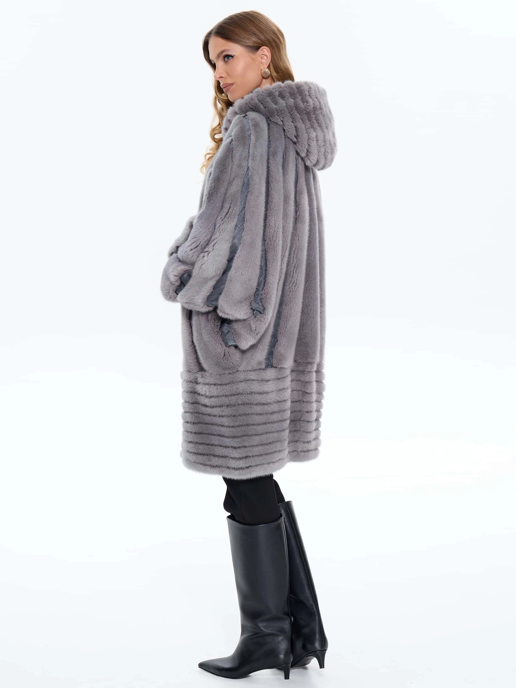 Женская шуба в морозном сером цвете с голубым подтоном выполнена из густого шелковистого меха норки, ее свободный крой не ограничивает движений, мягко скрывает особенности фигуры и позволяет носить объемные свитера. Модель обладает эксклюзивными деталями: рукав «мышка» разработан совместно с лабораторией Milan Fashion Tech, объемный капюшон и внешняя часть выполнены в диагональной раскладке меха. Универсальная длина миди подходит как для городской носки, так и для особых случаев. Изделие дополнено практичной подкладкой из износостойкой вискозы, глубокими боковыми карманами и застежкой на пуговицах, а качественный мех отлично сохраняет тепло в холодную зиму.