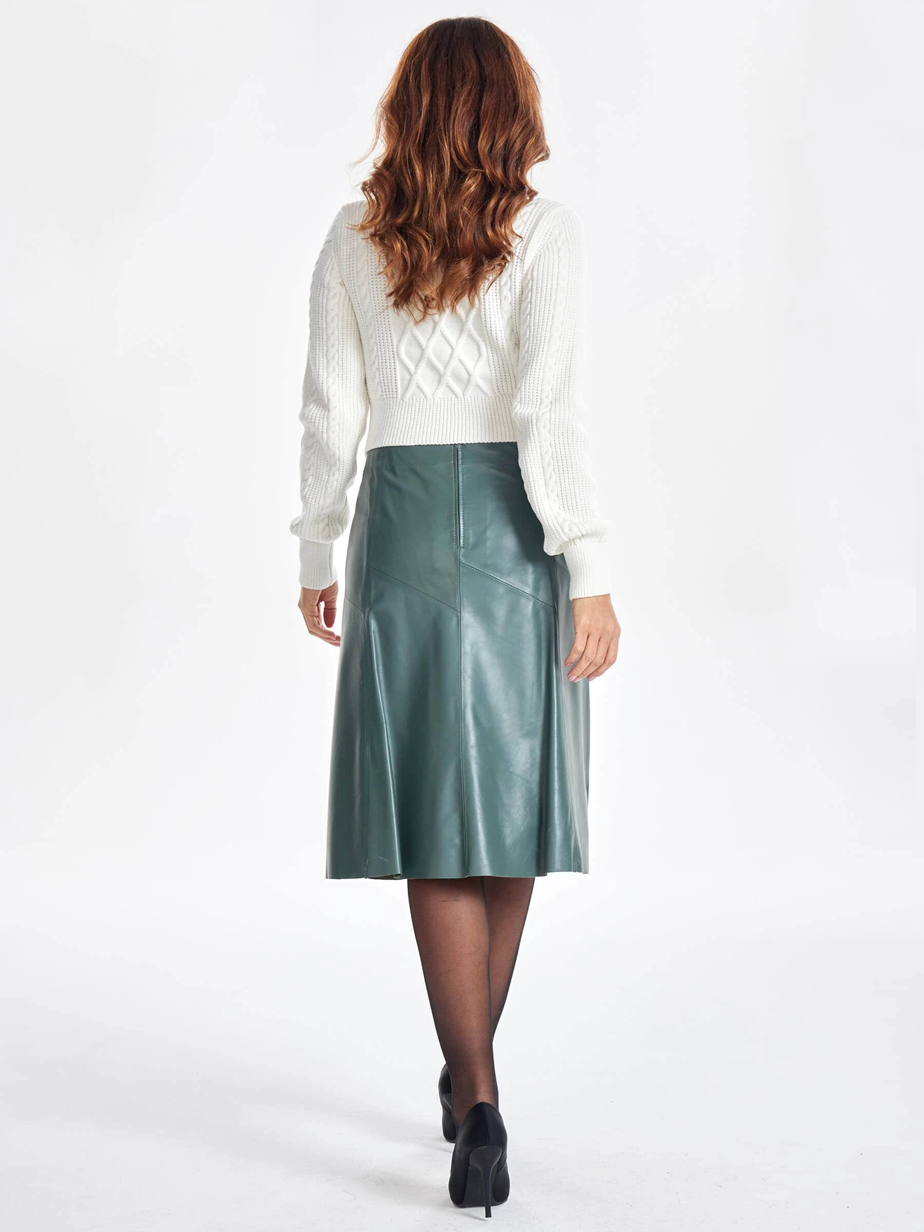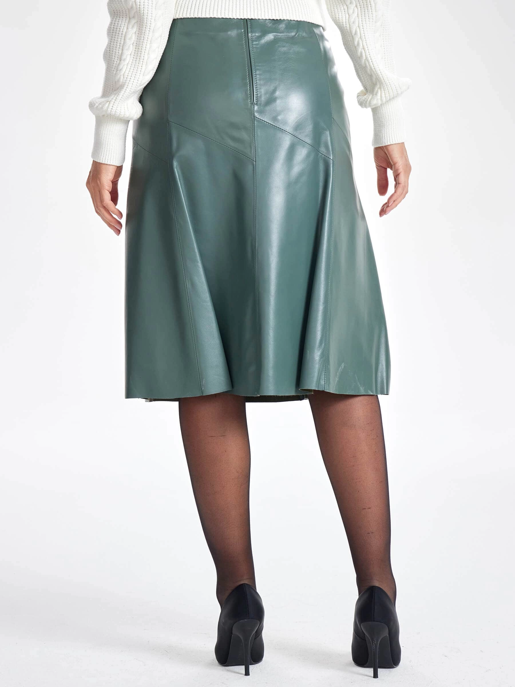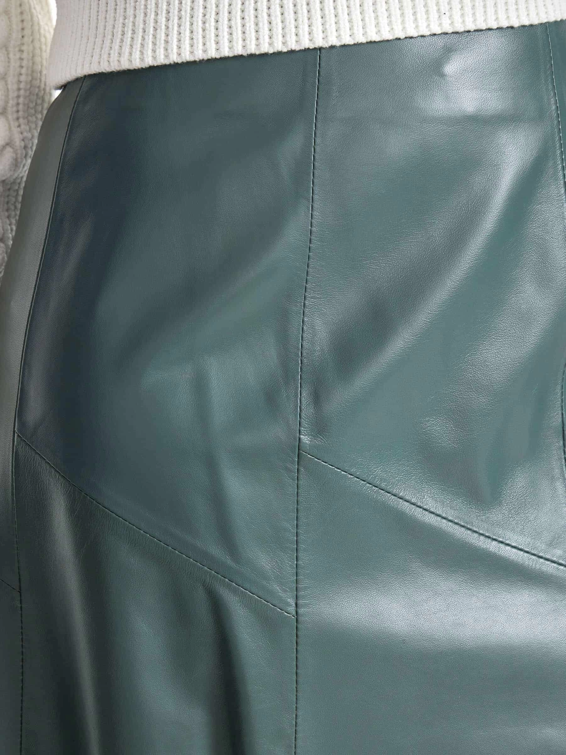 Расклешённая юбка из натуральной оливковой кожи с заниженной талией без пояса сочетает военную эстетику с современной элегантностью. Идеально обработанная кожа глубокого оливкового оттенка с восковым блеском мягко облегает бёдра, эффектно расклешёвываясь от колена — каждый шаг создаёт динамичный струящийся силуэт. Потайная молния сохраняет чистоту линий, а благородный оливковый цвет с уникальной способностью менять оттенок от тёплого хаки до холодного бутылочного тона делает эту модель исключительно универсальной. Сочетайте с песочными блузами для офиса, объёмными свитерами для casual-образа или шёлковыми топами для вечера — эта расклешённая юбка из вощёной кожи премиального качества станет изюминкой вашего гардероба.