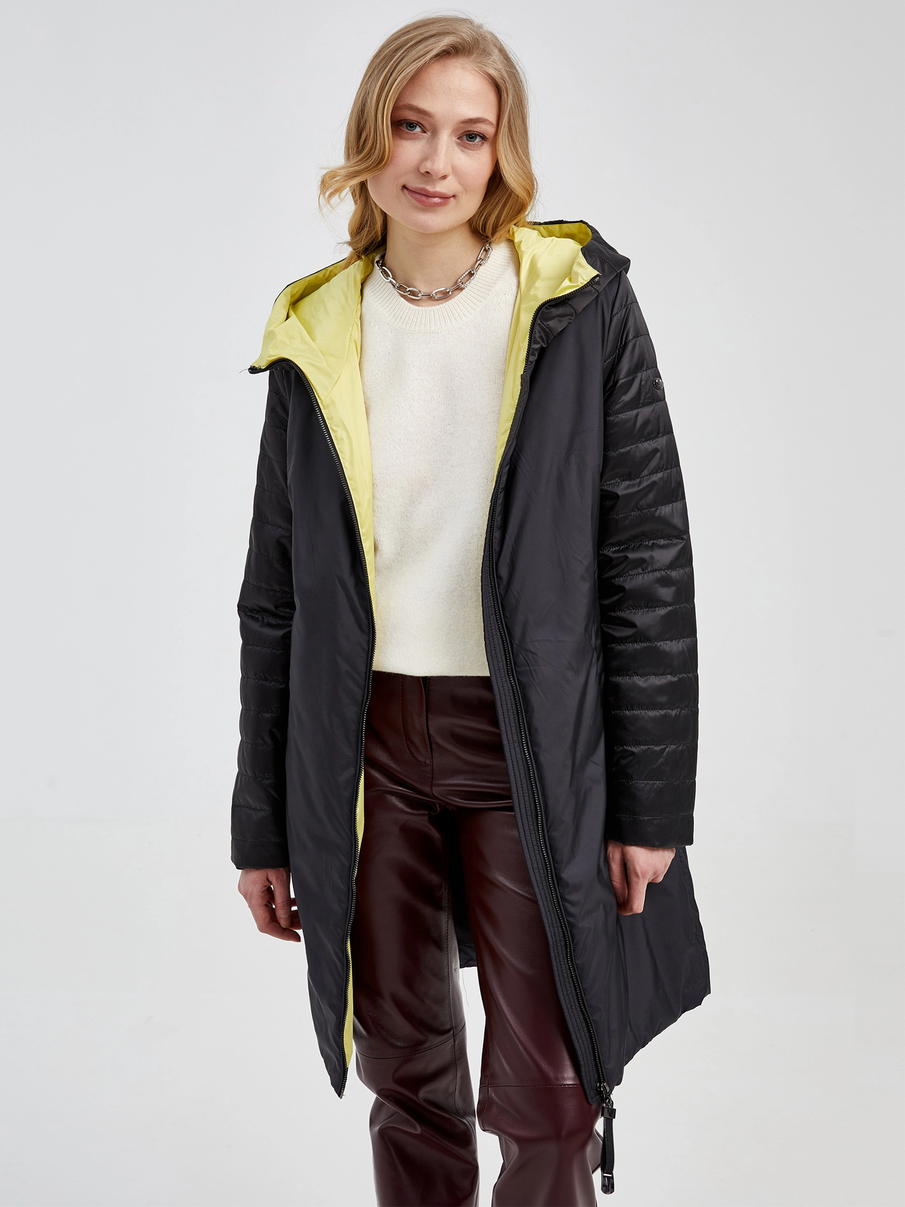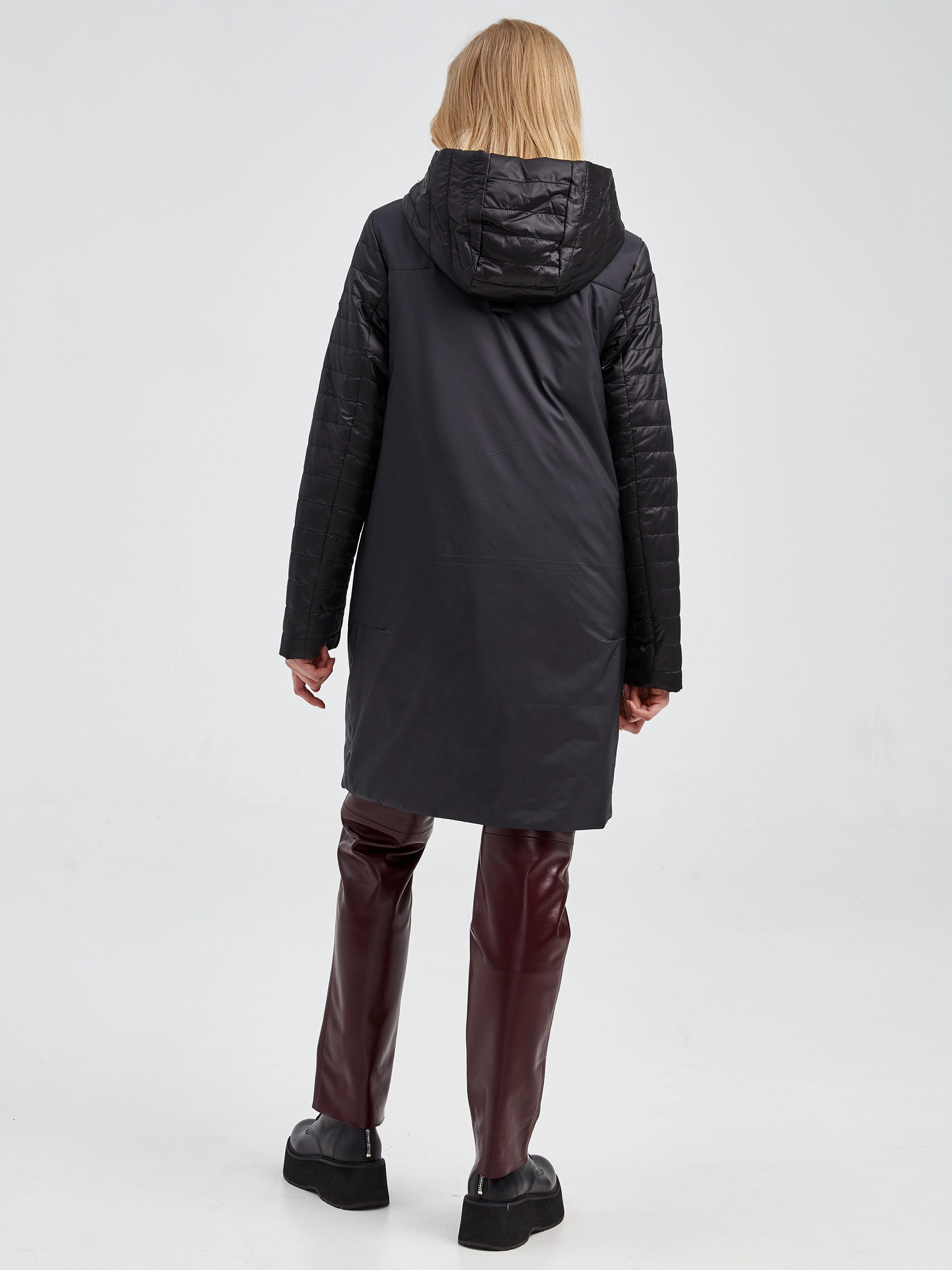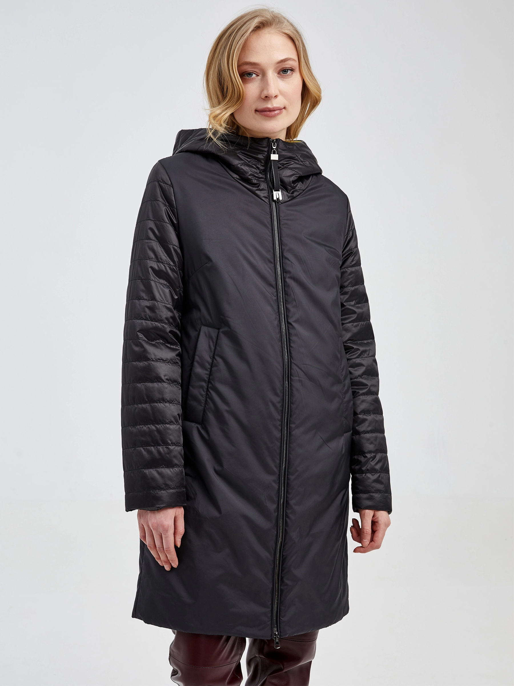 Товар текстильный двусторонний женский пуховик с капюшоном 21380 , черный, размер 42, артикул 25140 выполнен из текстиль с застежкой молния. Рассчитан на сезон: демисезон. Длина изделия свыше 90 см, силуэт прямой.