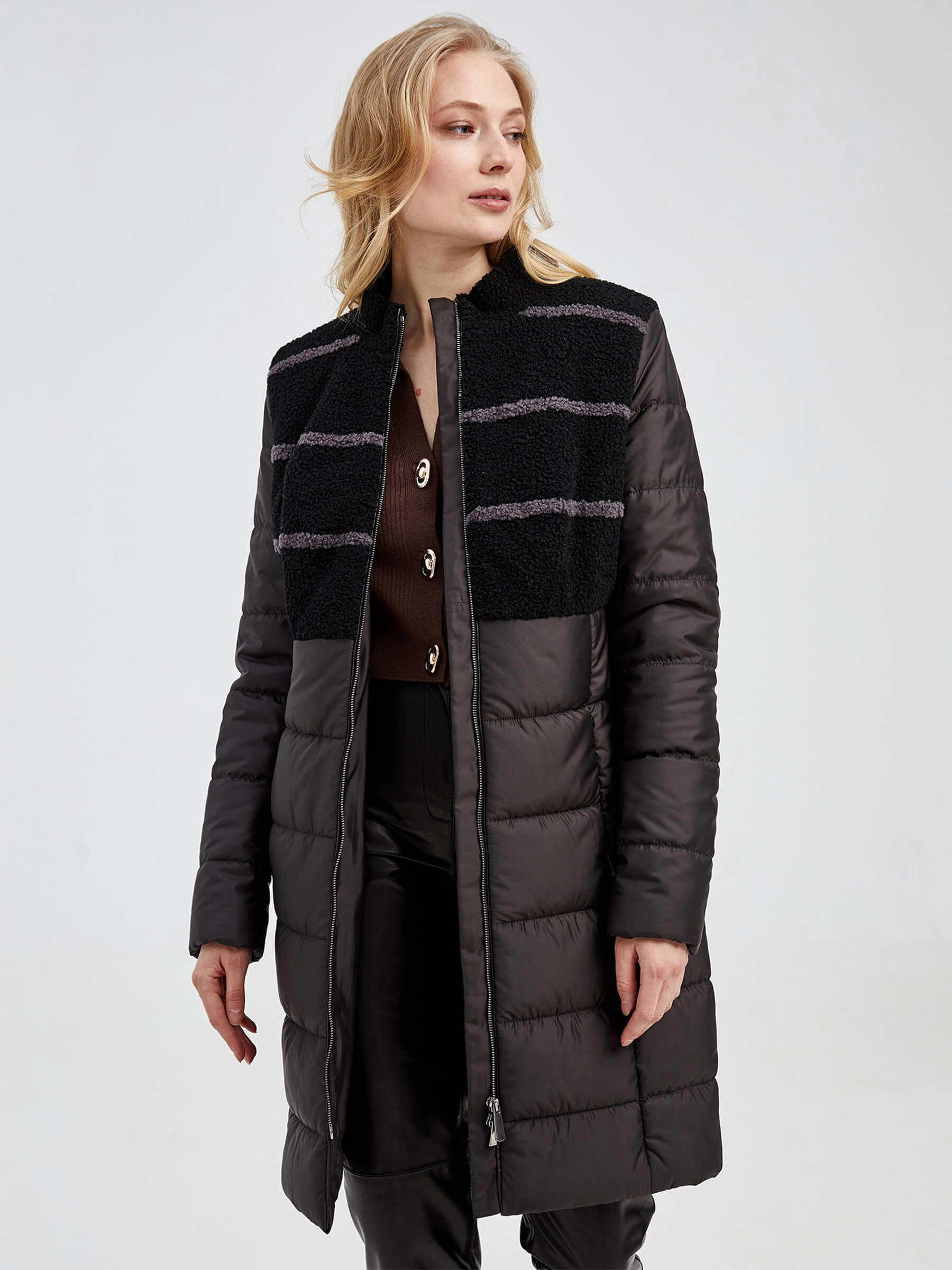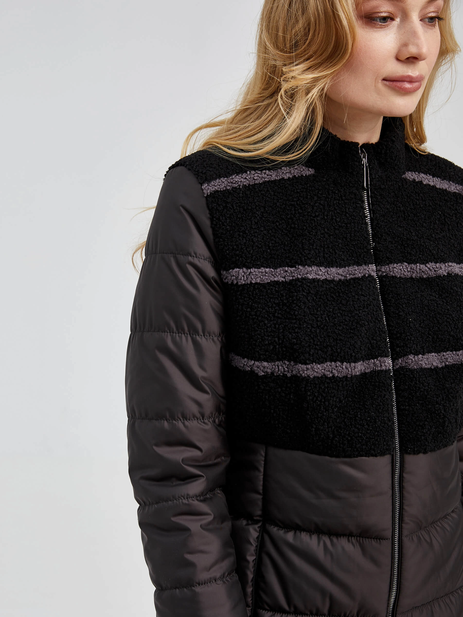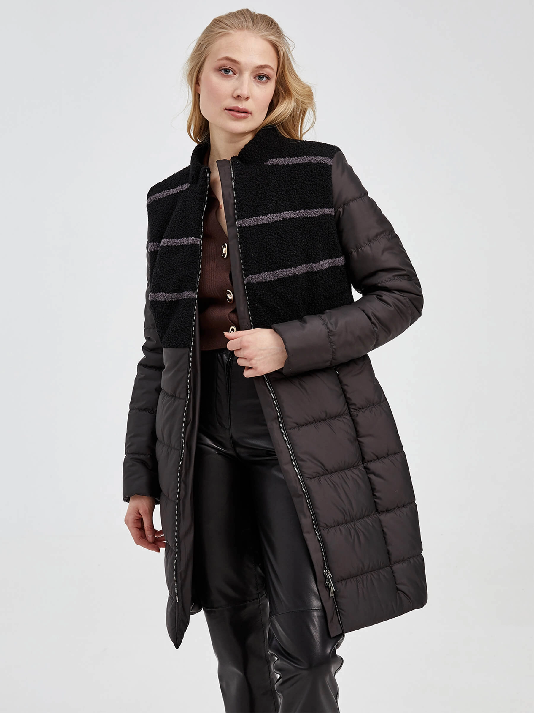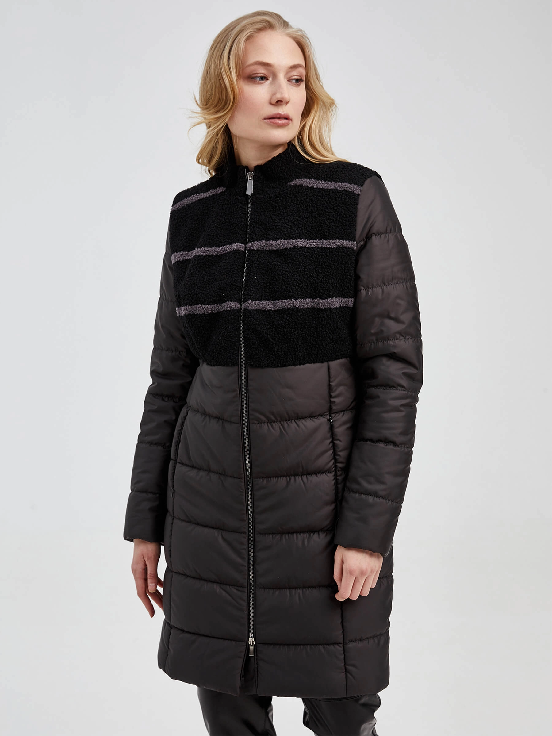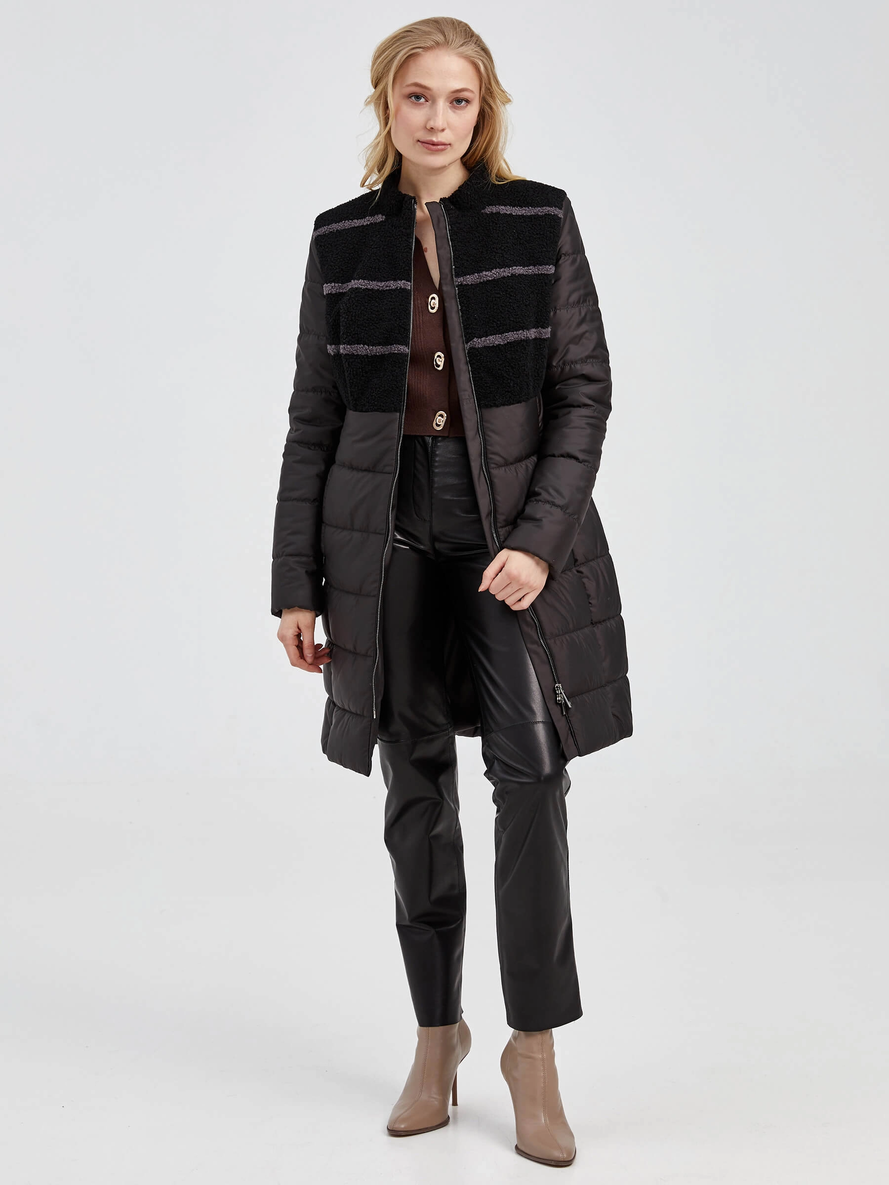 Спортивное полупальто из комбинации полиэстера и овчины «астраган» в полуприлегающем силуэте длиной 75–90 см — это стильное и практичное решение для межсезонья. Модель с чёткими линиями втачного рукава и элегантной стойкой подчеркивает динамичный образ, а отсутствие капюшона и декоративной отделки фокусирует внимание на фактуре плотного, влагостойкого материала. Удобная двухзамковая молния, боковые карманы и мягкая подкладка из 100% вискозы делают эту куртку необыкновенно комфортной для повседневной носки в сезон осень-зима, прекрасно сохраняя тепло.