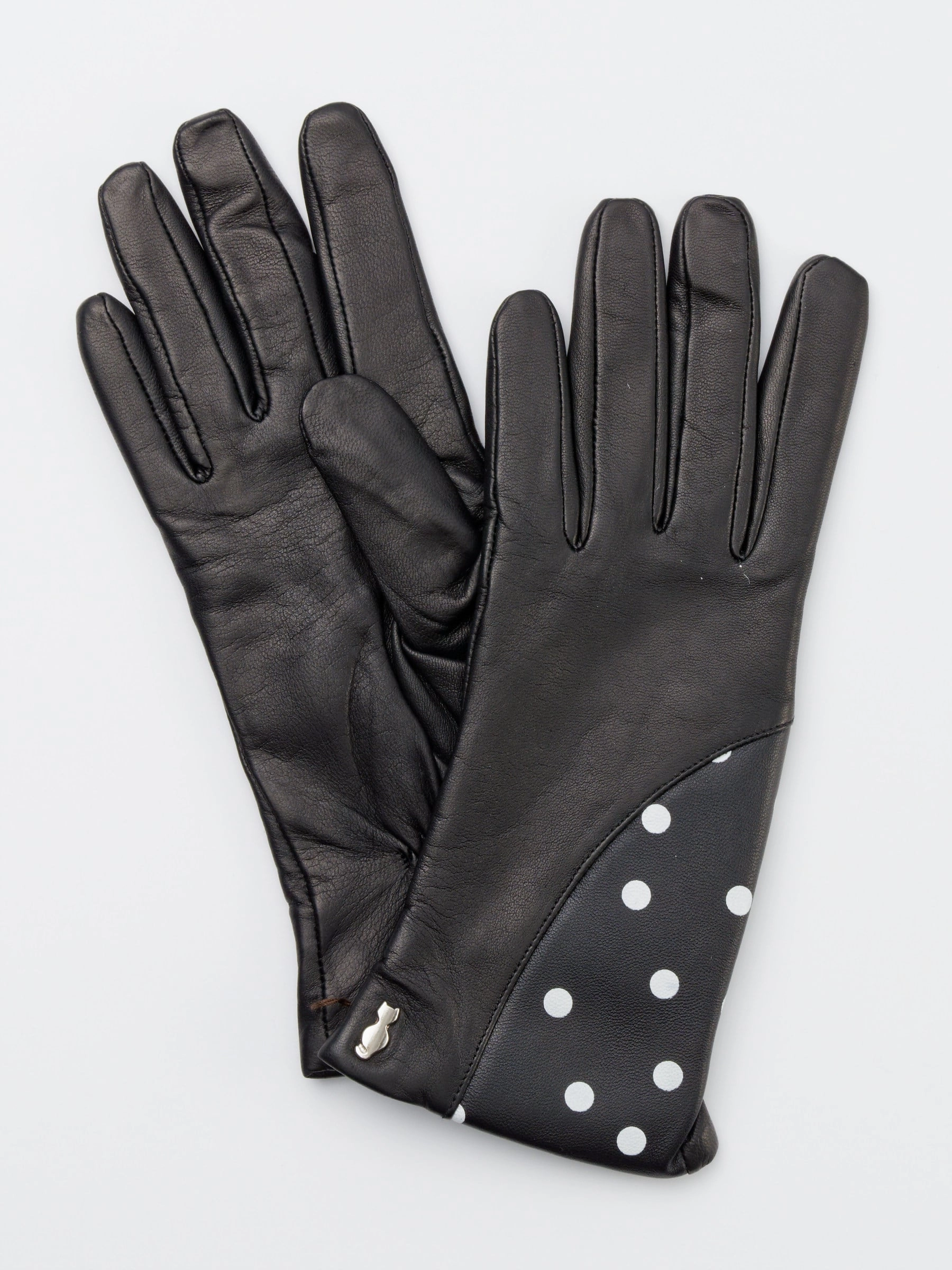 Перчатки торговой марки ELEGANZZA выполнены из натуральной кожи ягненка. Отделка: вставка из принтованной кожи в белый горошек; фурнитура в виде кошки в углу по линии мизинца. Длина манжеты от нижней точки большого пальца до края перчаток - 6 см.