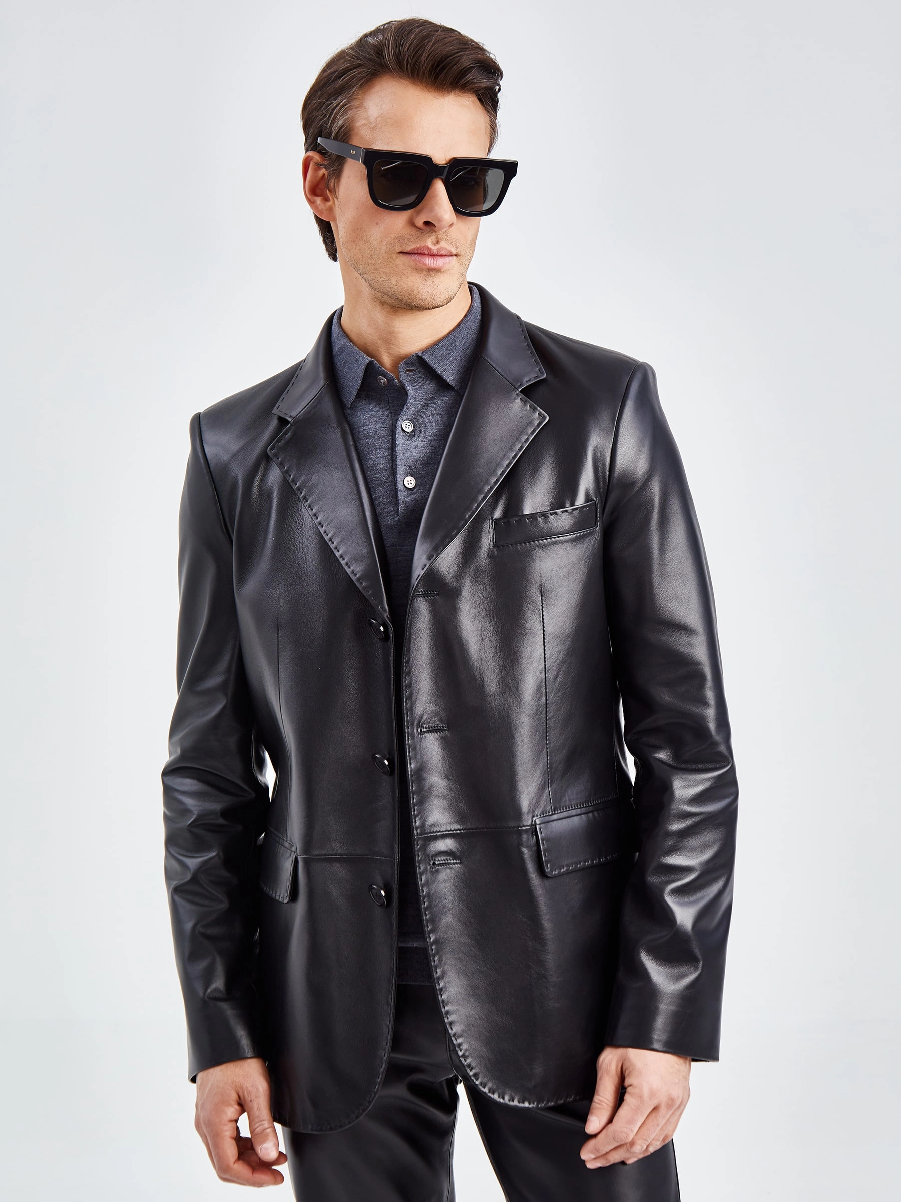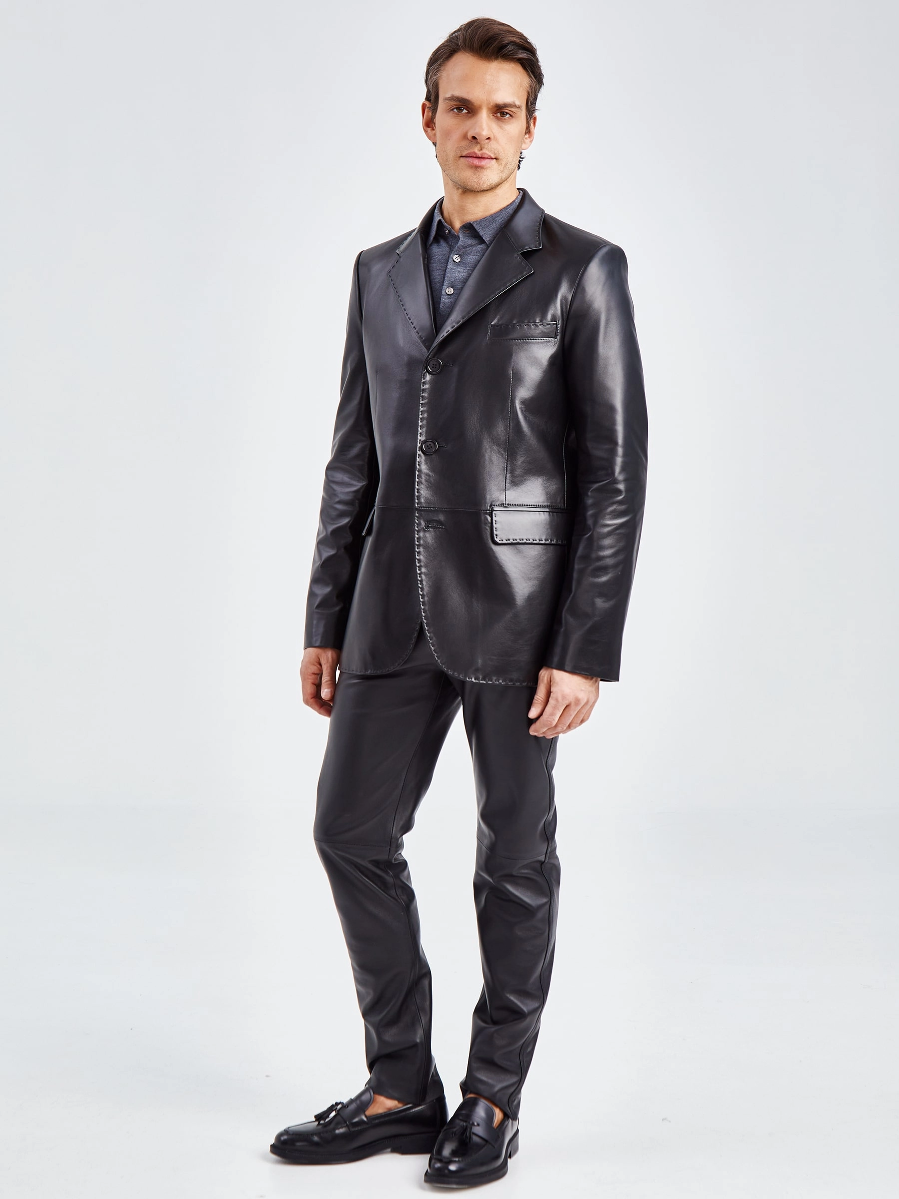 Товар мужской кожаный пиджак на ручном стежке премиум класса 543, черный, размер 48, артикул 27330 выполнен из натуральной кожи с застежкой пуговицы. Рассчитан на сезон: весна-лето. Длина изделия 78 см, силуэт полуприлегающий.