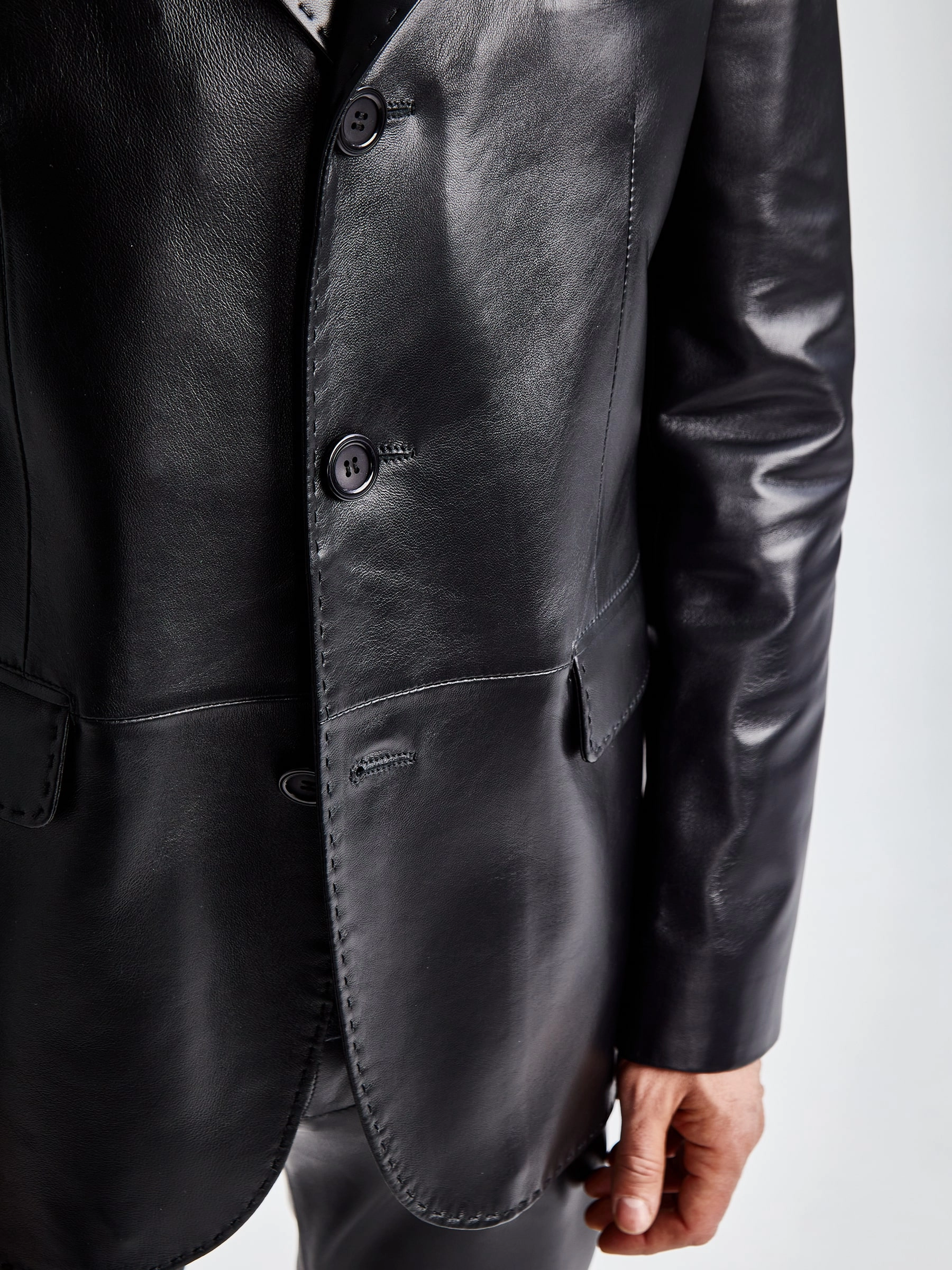 Мужской кожаный пиджак на ручном стежке премиум класса 543, черный, размер 48, артикул 27330