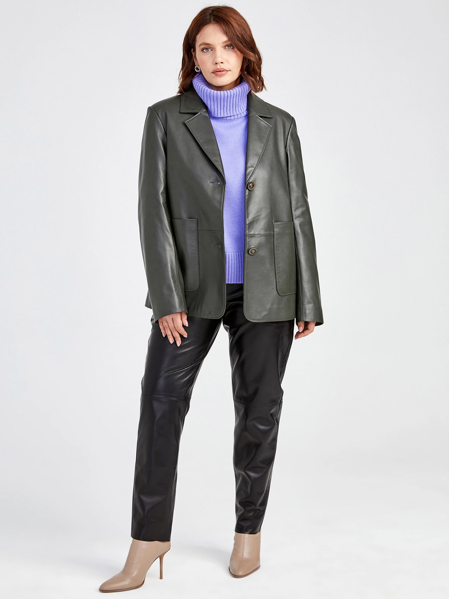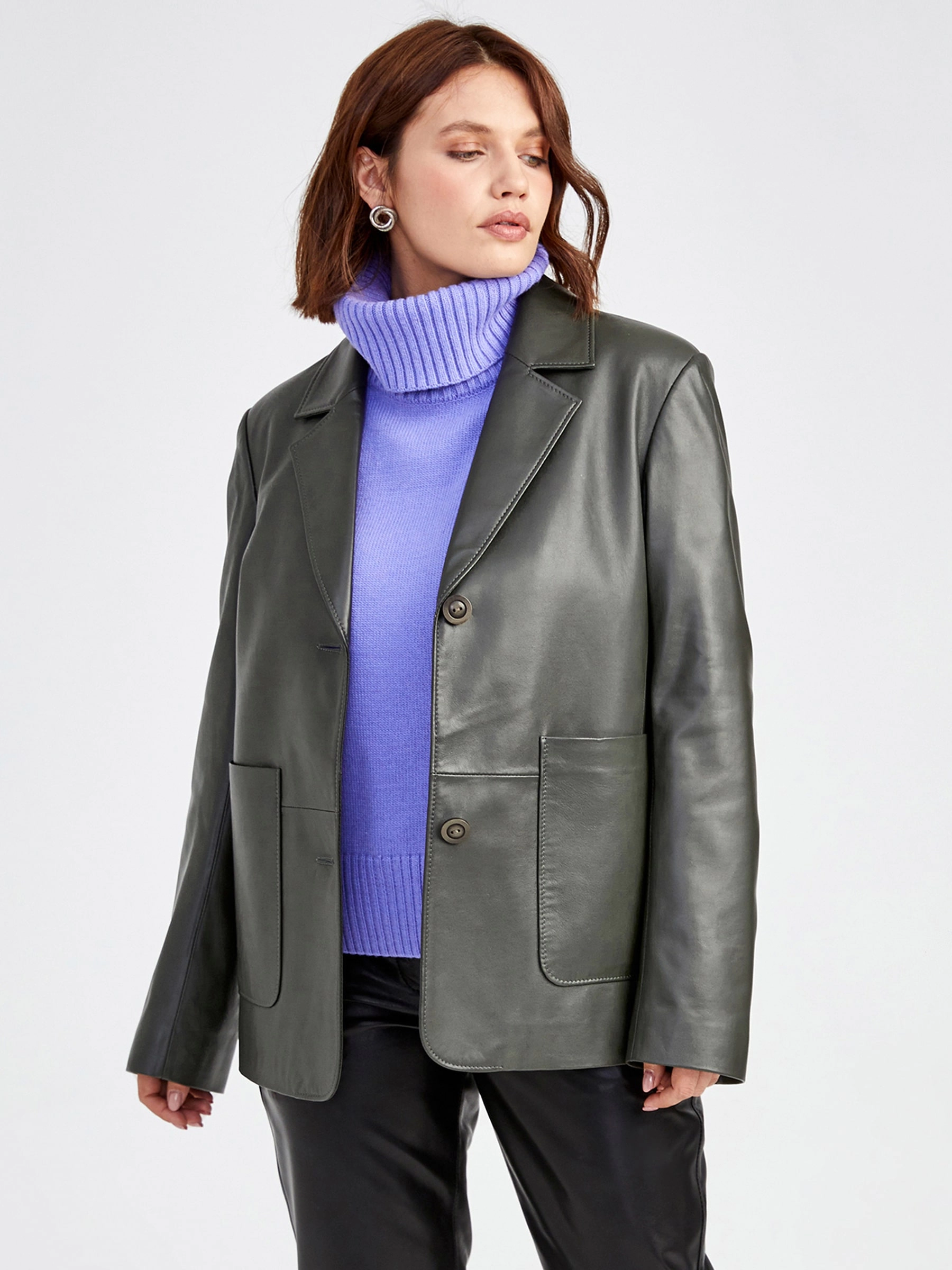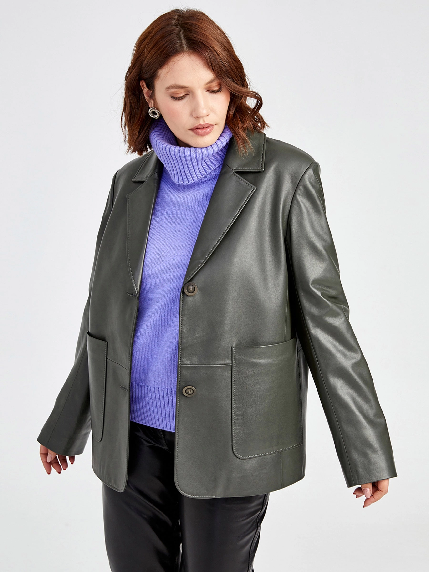 Кожаный женский пиджак премиум класса 3016, оливковый, размер 46, артикул 91581