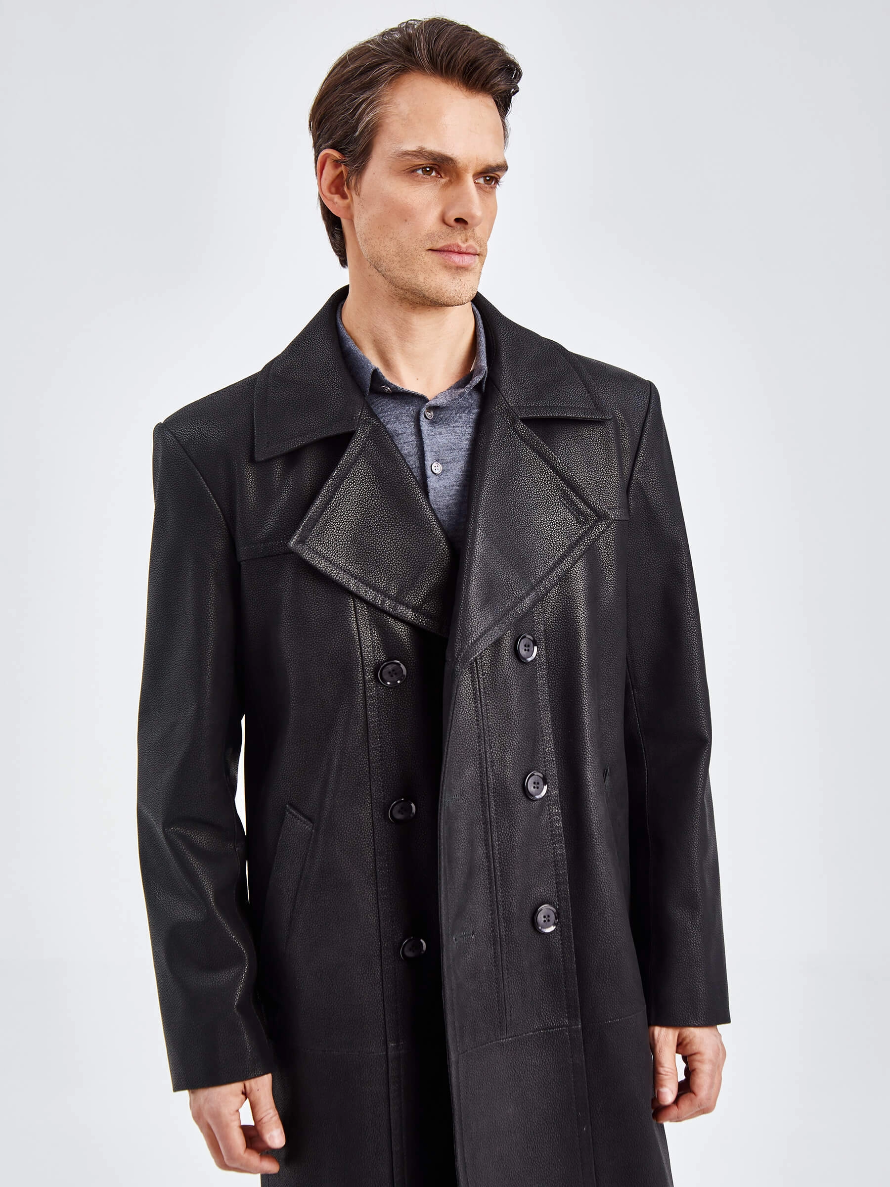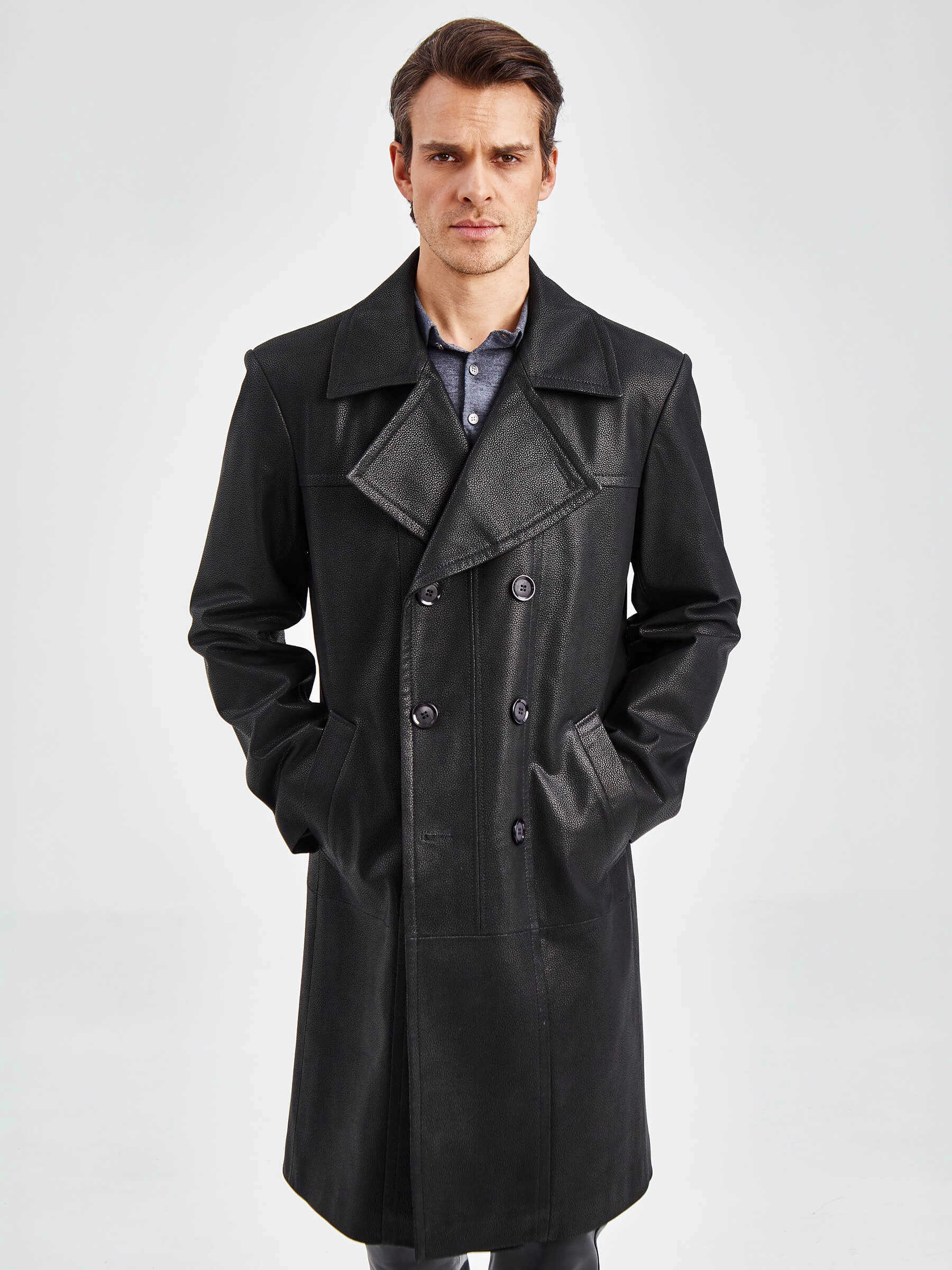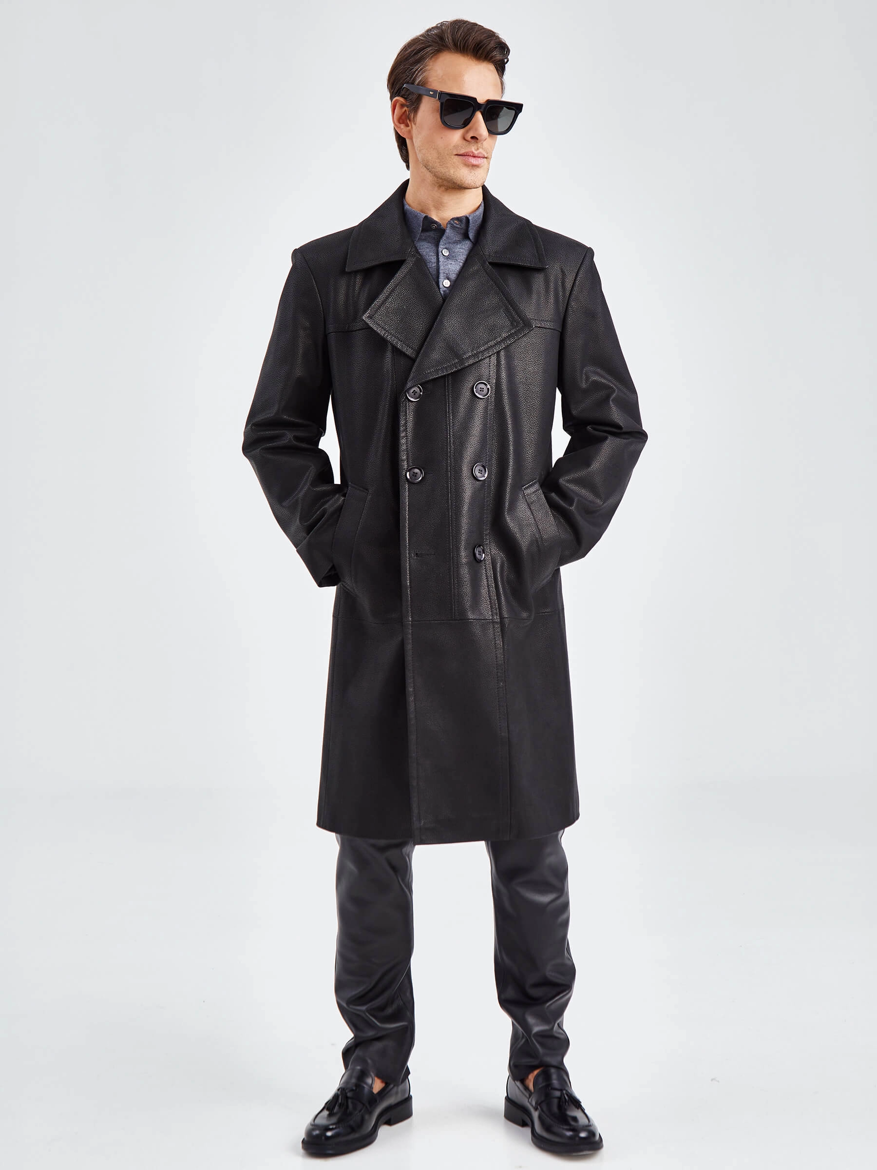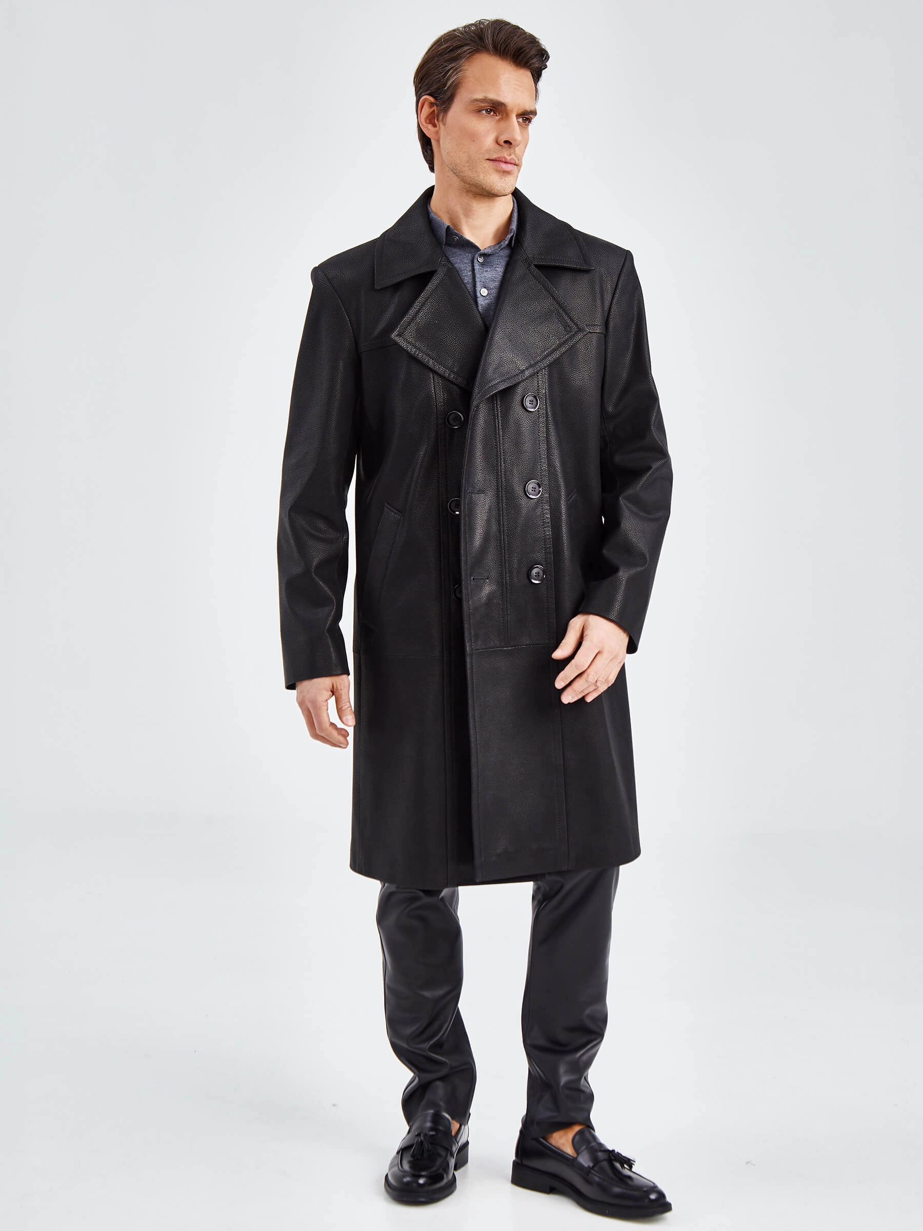 Товар двубортный мужской кожаный плащ премиум класса чикаго, черный, размер 48, артикул 21120 выполнен из натуральной кожи с застежкой пуговицы. Рассчитан на сезон: демисезон. Длина изделия 110 см, силуэт полуприлегающий.