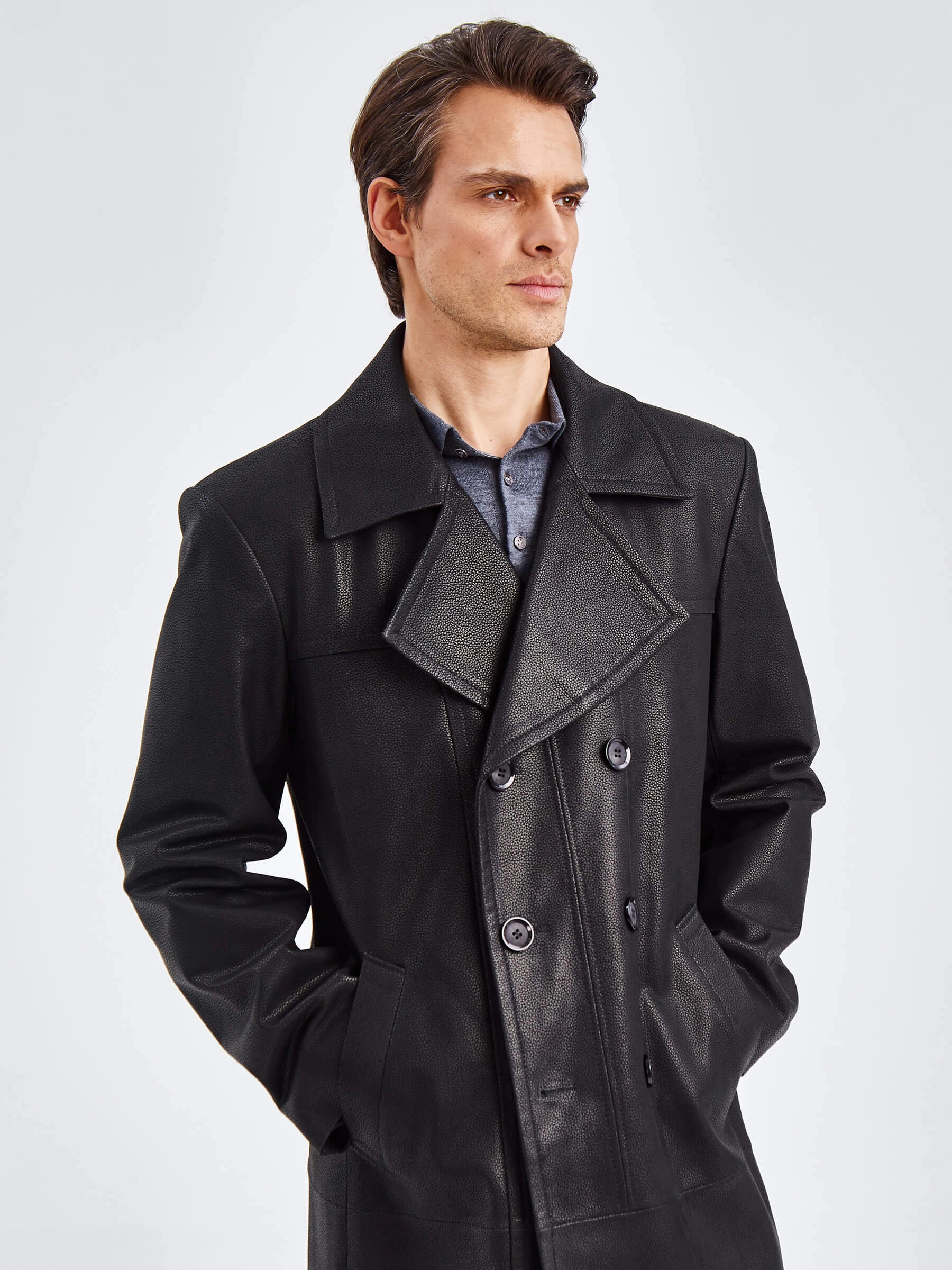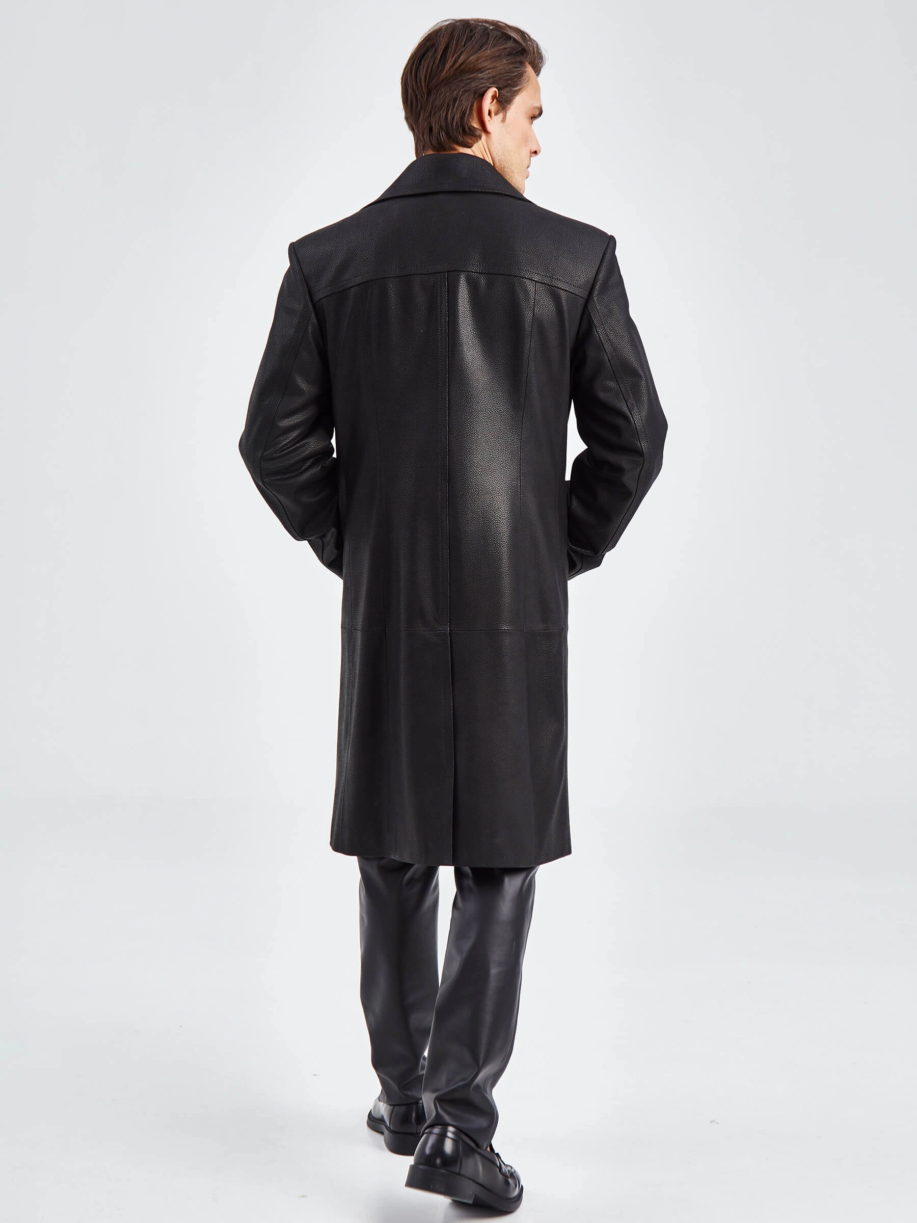 Двубортный кожаный плащ полуприлегающего силуэта с широкими лацканами и высокой шлицей- однозначно для тех, кто привык сочетать стиль и комфорт одновременно. Изделие выполнили из мягкой мелкозернистой кожи премиум класса. Безупречная посадка по фигуре. Предусмотрены боковые и внутренние застёгивающиеся карманы для документов. Прекрасное сочетание как со свободной одеждой, так и со строгим деловым костюмом.