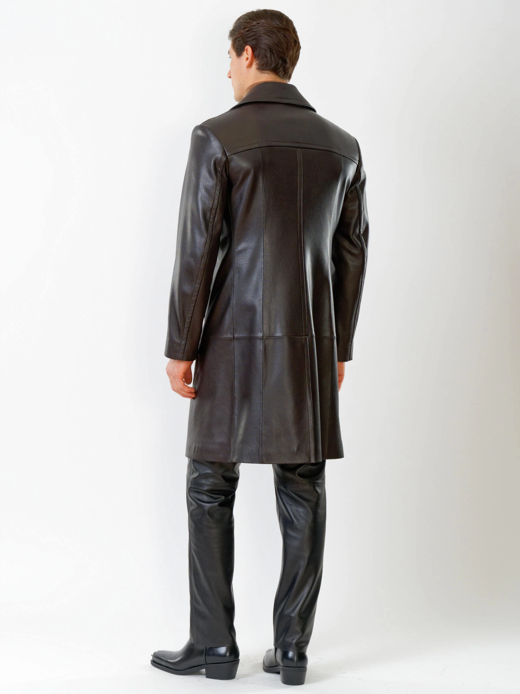 Товар двубортный мужской кожаный плащ премиум класса чикаго, коричневый, размер 46, артикул 28801 выполнен из натуральной кожи с застежкой пуговицы. Рассчитан на сезон: демисезон. Длина изделия 110 см, силуэт полуприлегающий.