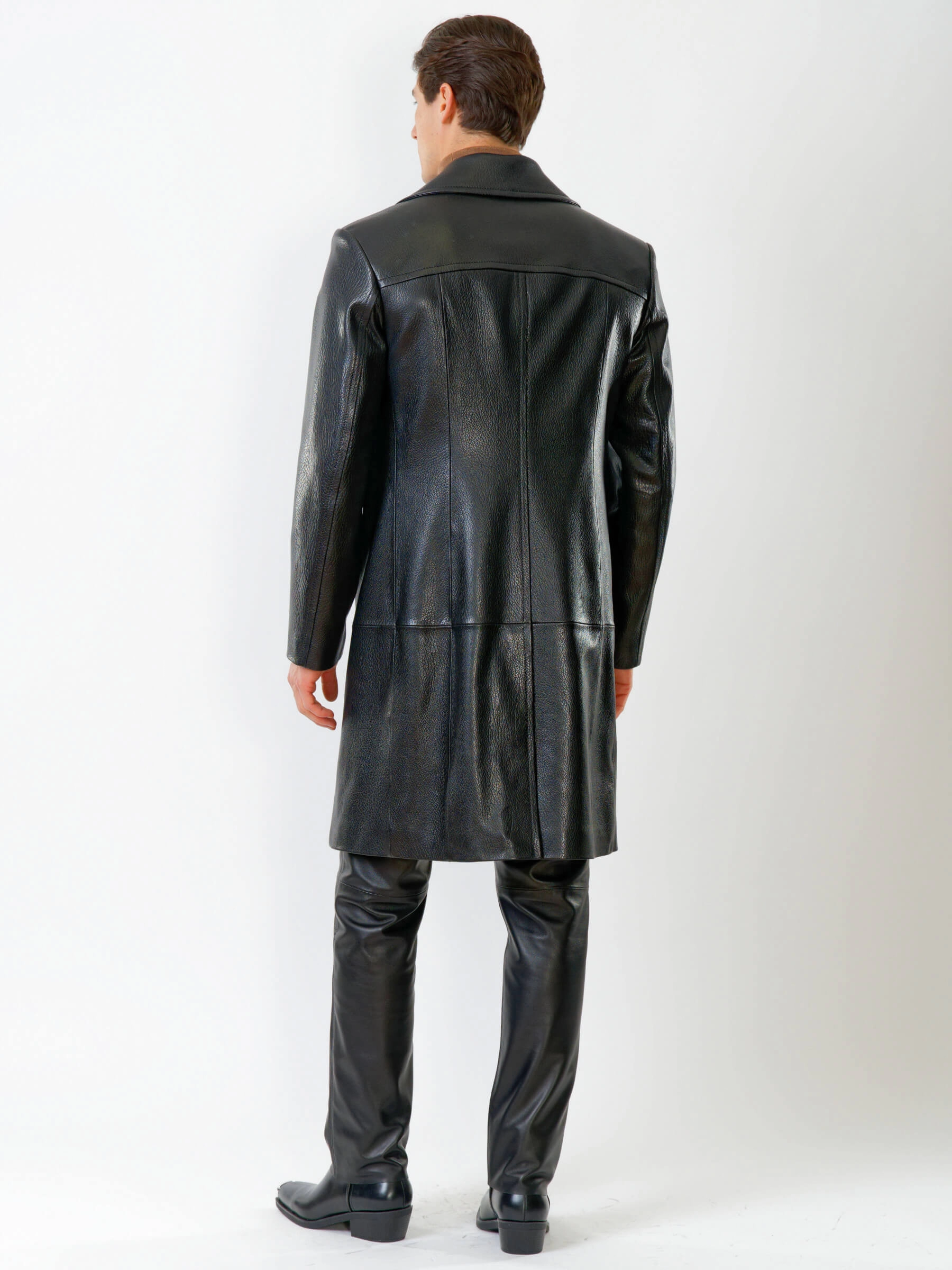 Товар двубортный мужской кожаный плащ премиум класса чикаго, черный, размер 48, артикул 21121 выполнен из натуральной кожи с застежкой пуговицы. Рассчитан на сезон: демисезон. Длина изделия 110 см, силуэт полуприлегающий.