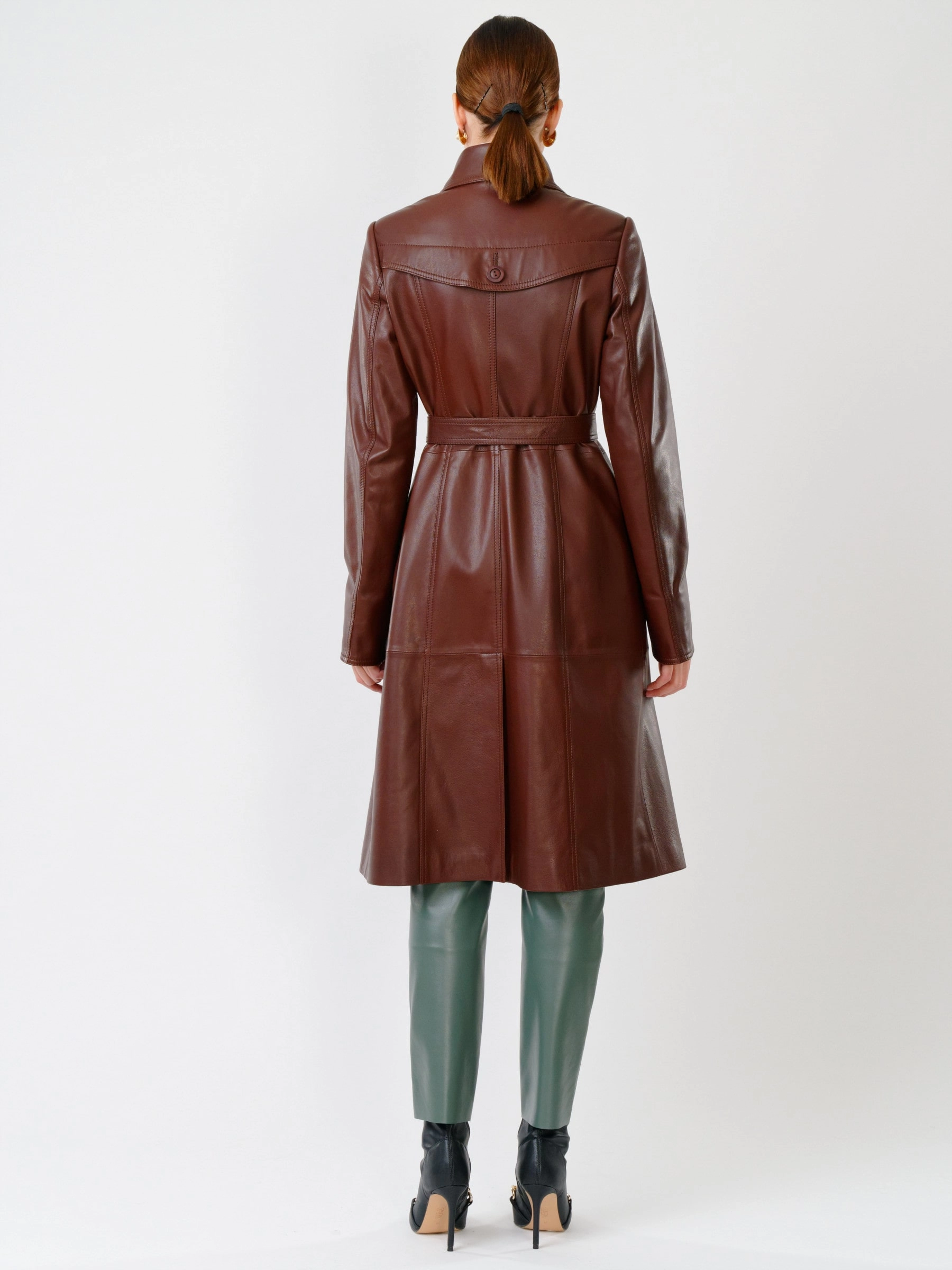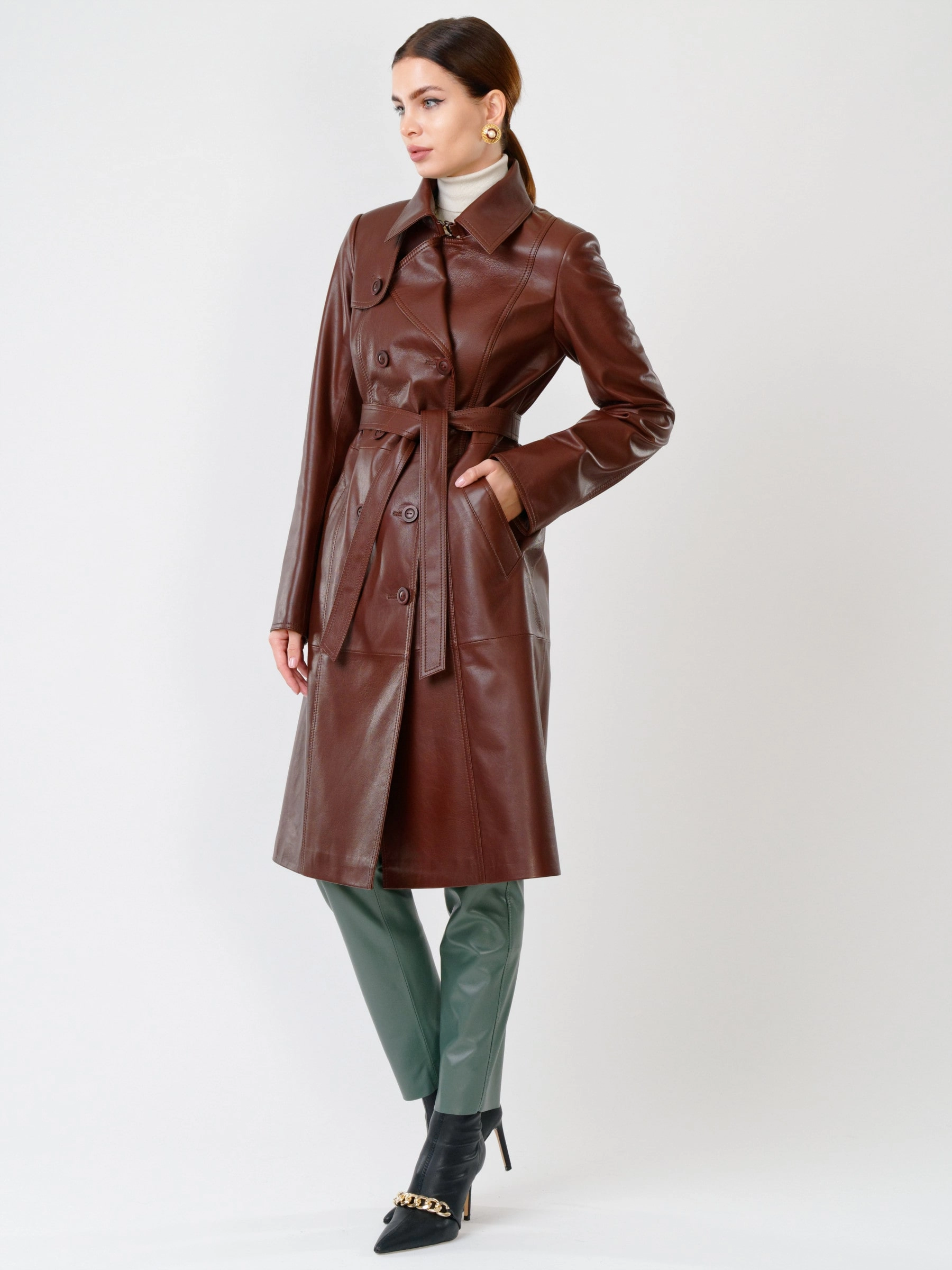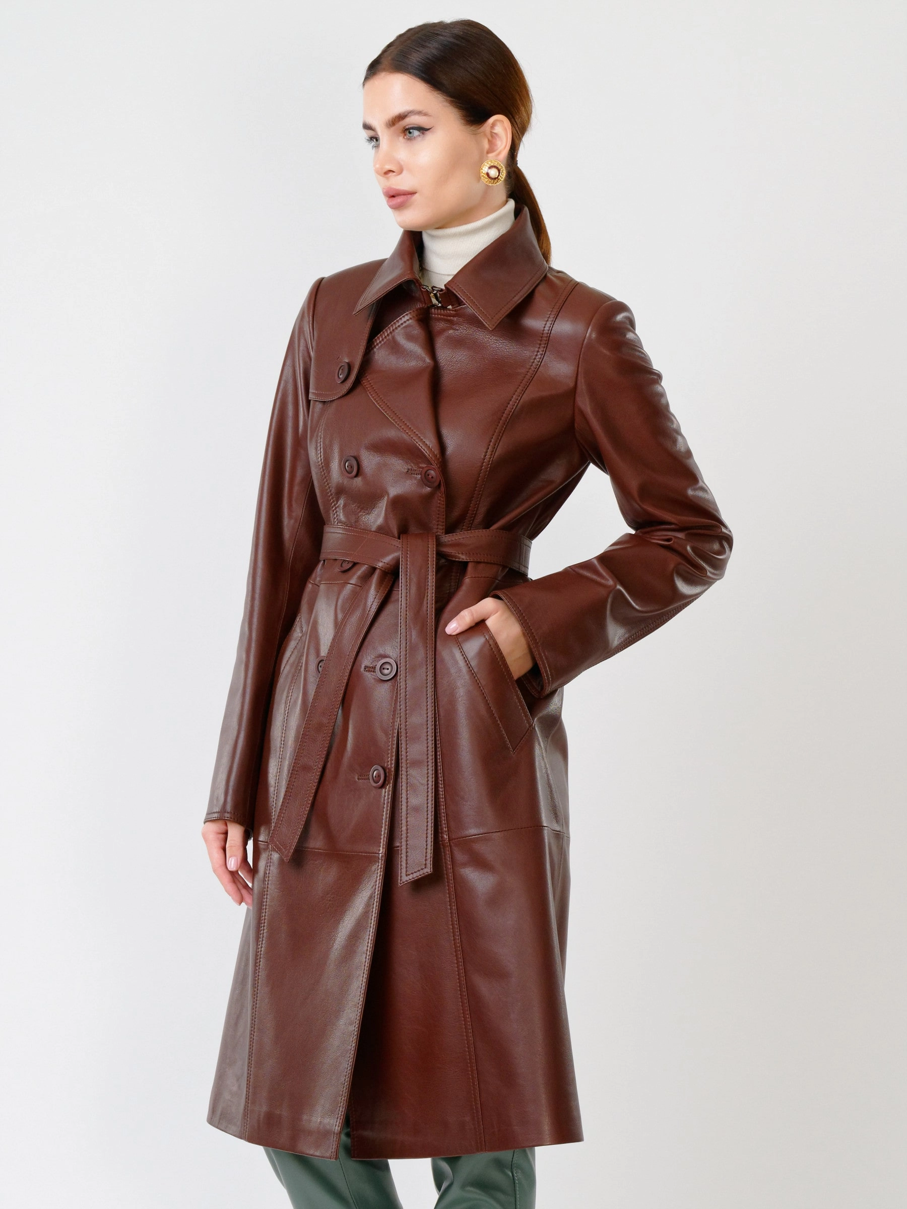 Кожаный двубортный женский плащ с поясом 3003, ореховый, размер 48, артикул 60591