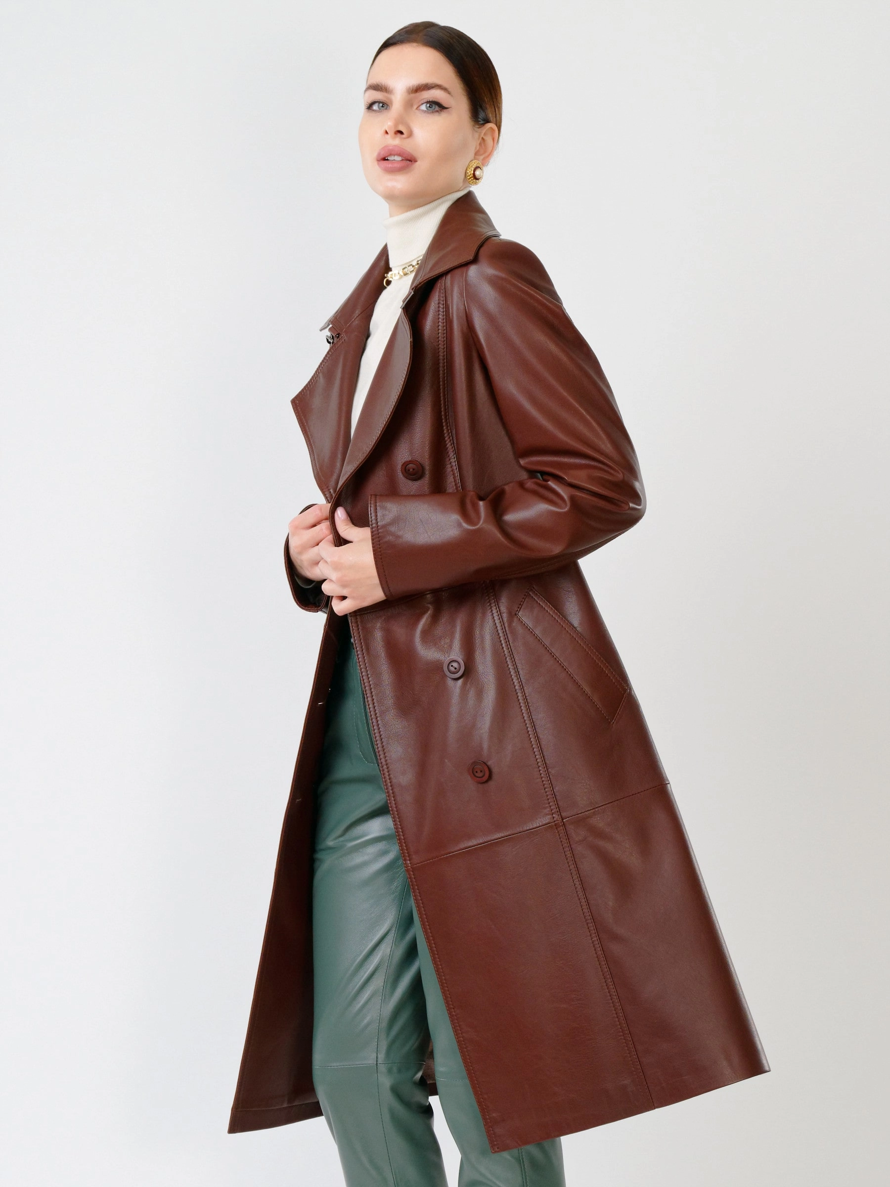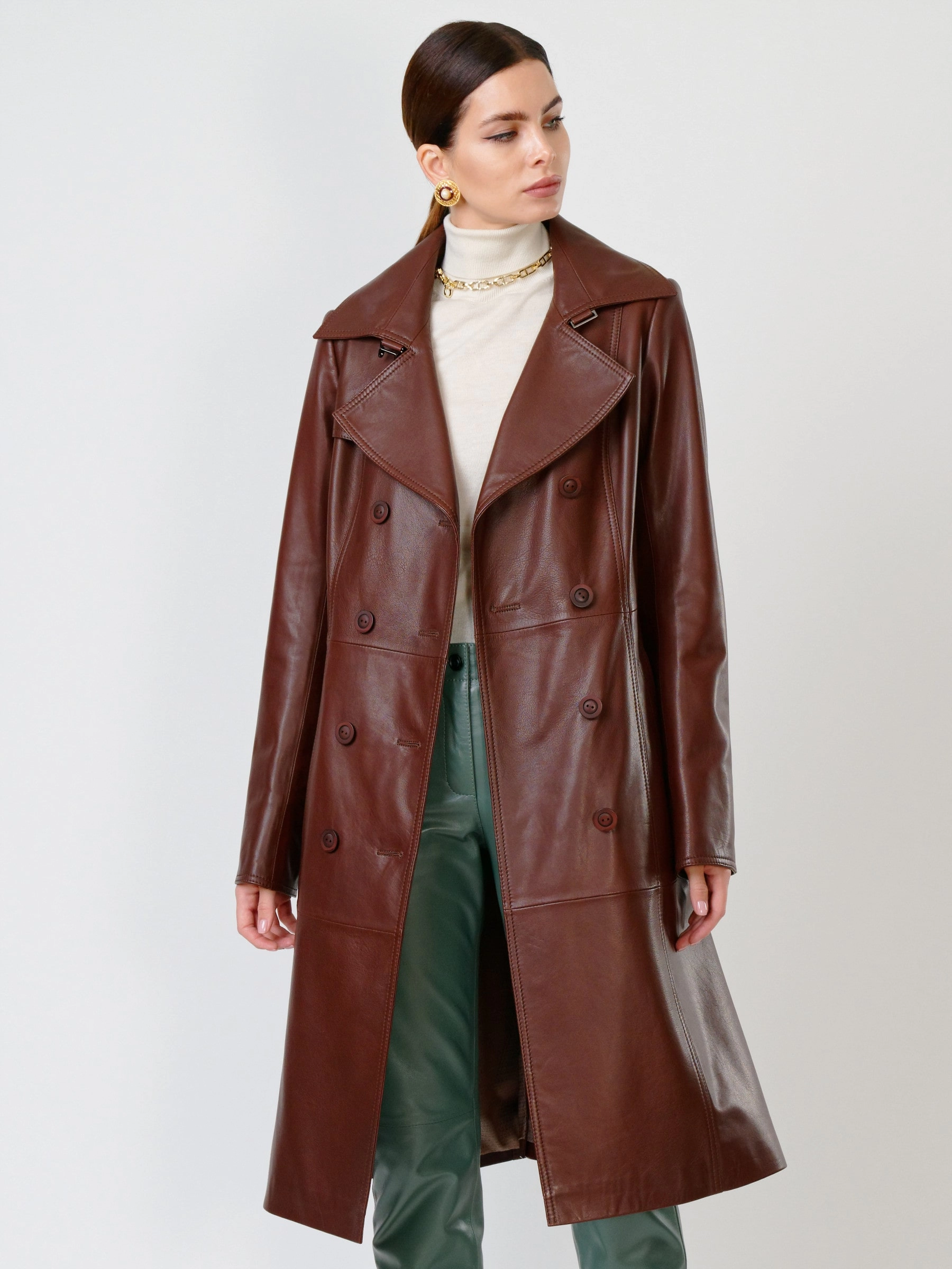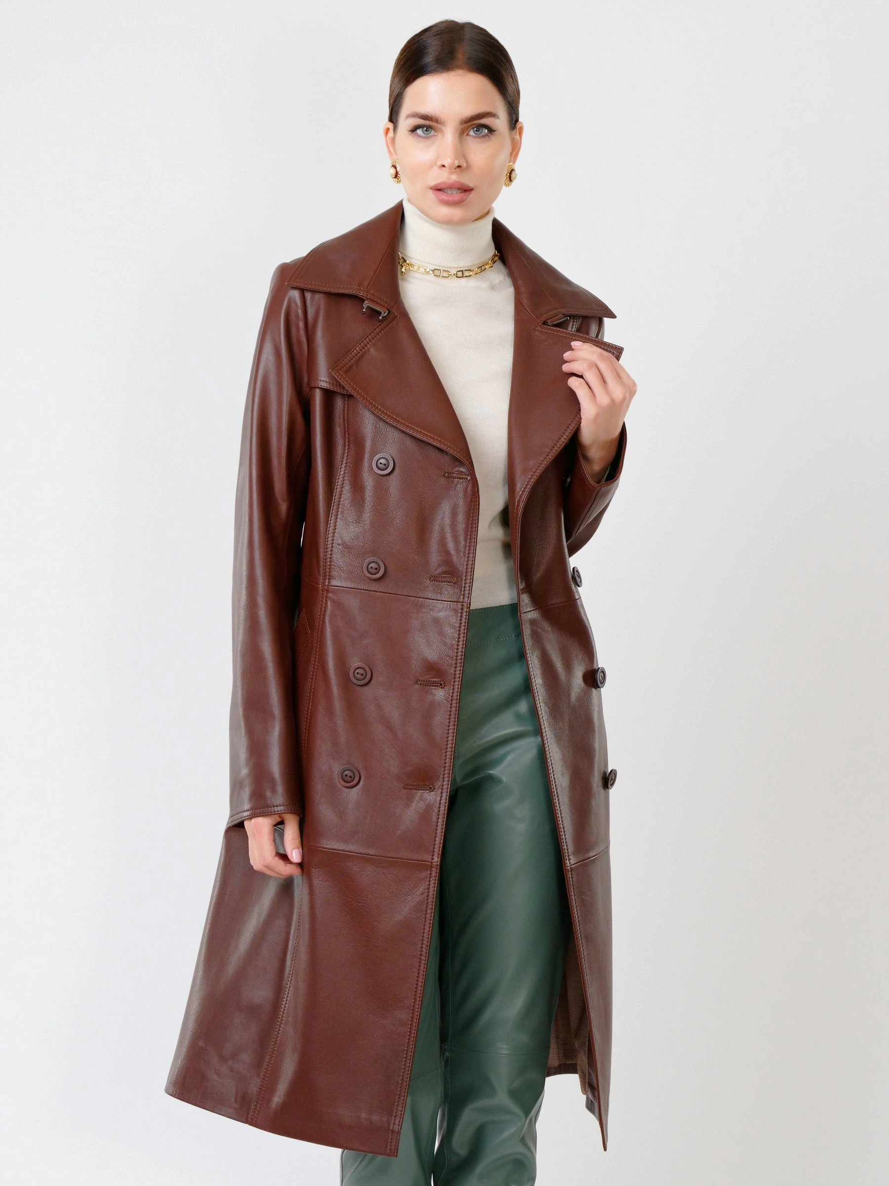 Элегантный кожаный плащ на пуговицах! Изготовленный из роскошной натуральной кожи нежнейшей выделки, двубортный тренч полуприлегающего силуэта обеспечивает идеальную посадку. Его отличает классический английский воротник на стойке и кожаный пояс, который подчеркнёт талию. Функциональность дополняют врезные карманы, втачные рукава с регулируемыми манжетами-отворотами и аккуратная шлица сзади. Этот универсальный повседневный плащ станет непререкаемым фаворитом вашего гардероба, великолепно сочетаясь с платьями, брючными костюмами или джинсами и дополняясь кожаными аксессуарами.