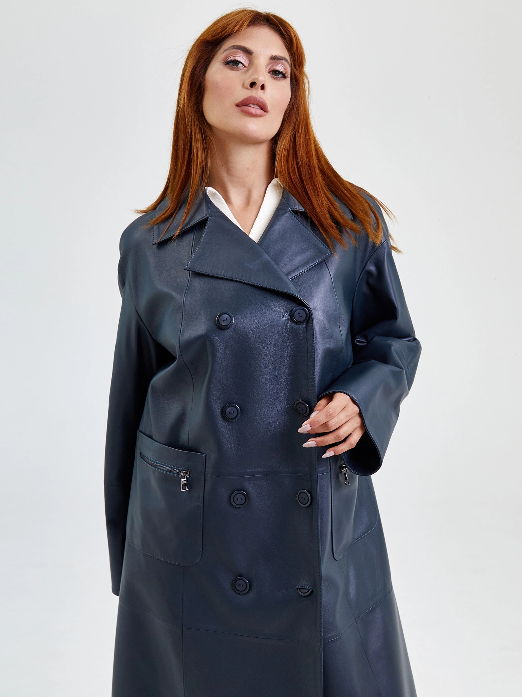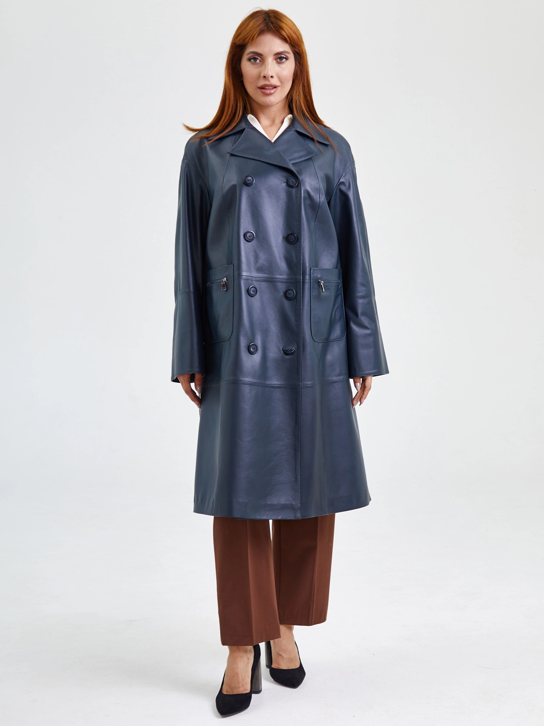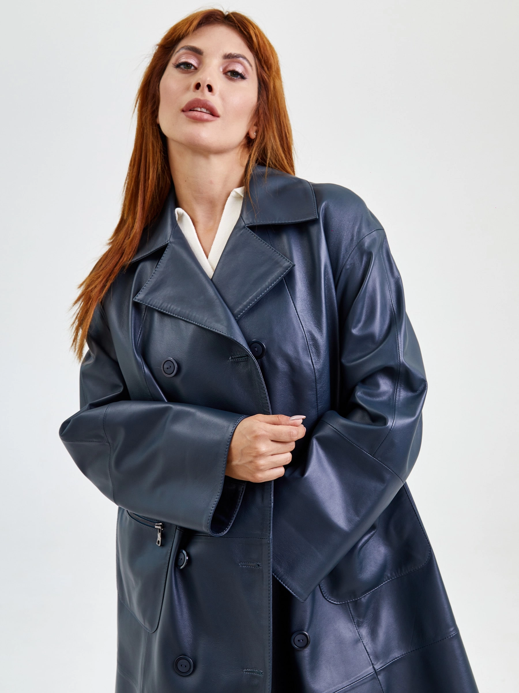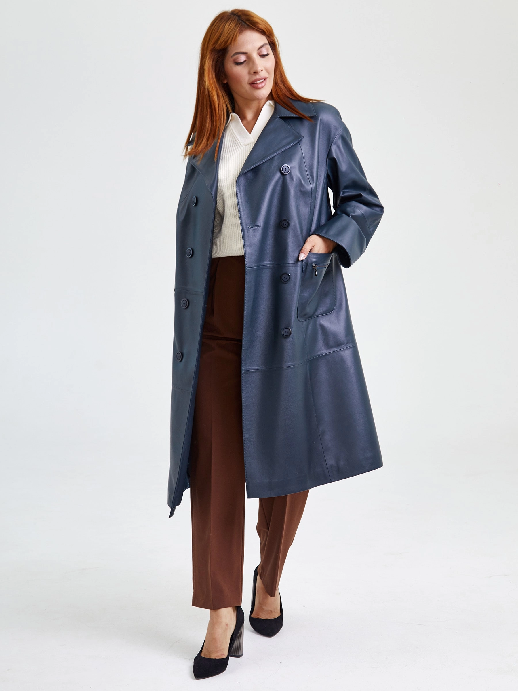 Товар кожаный двубортный плащ женский премиум класса 3012, синий, размер 56, артикул 91771 выполнен из натуральной кожи с застежкой пуговицы. Рассчитан на сезон: весна-лето. Длина изделия 110 см, силуэт свободный.