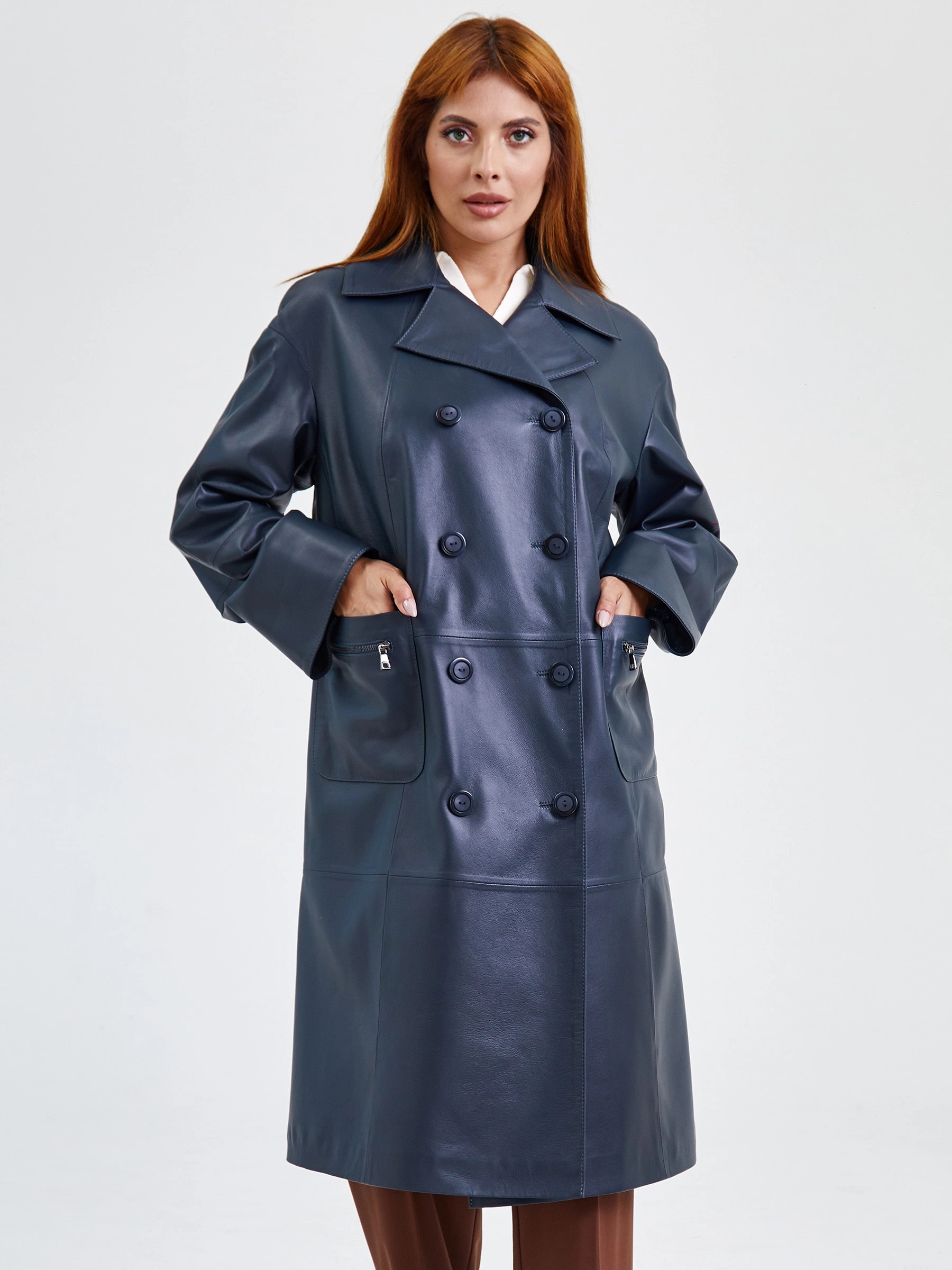 Кожаный двубортный плащ женский премиум класса 3012, синий, размер 56, артикул 91771
