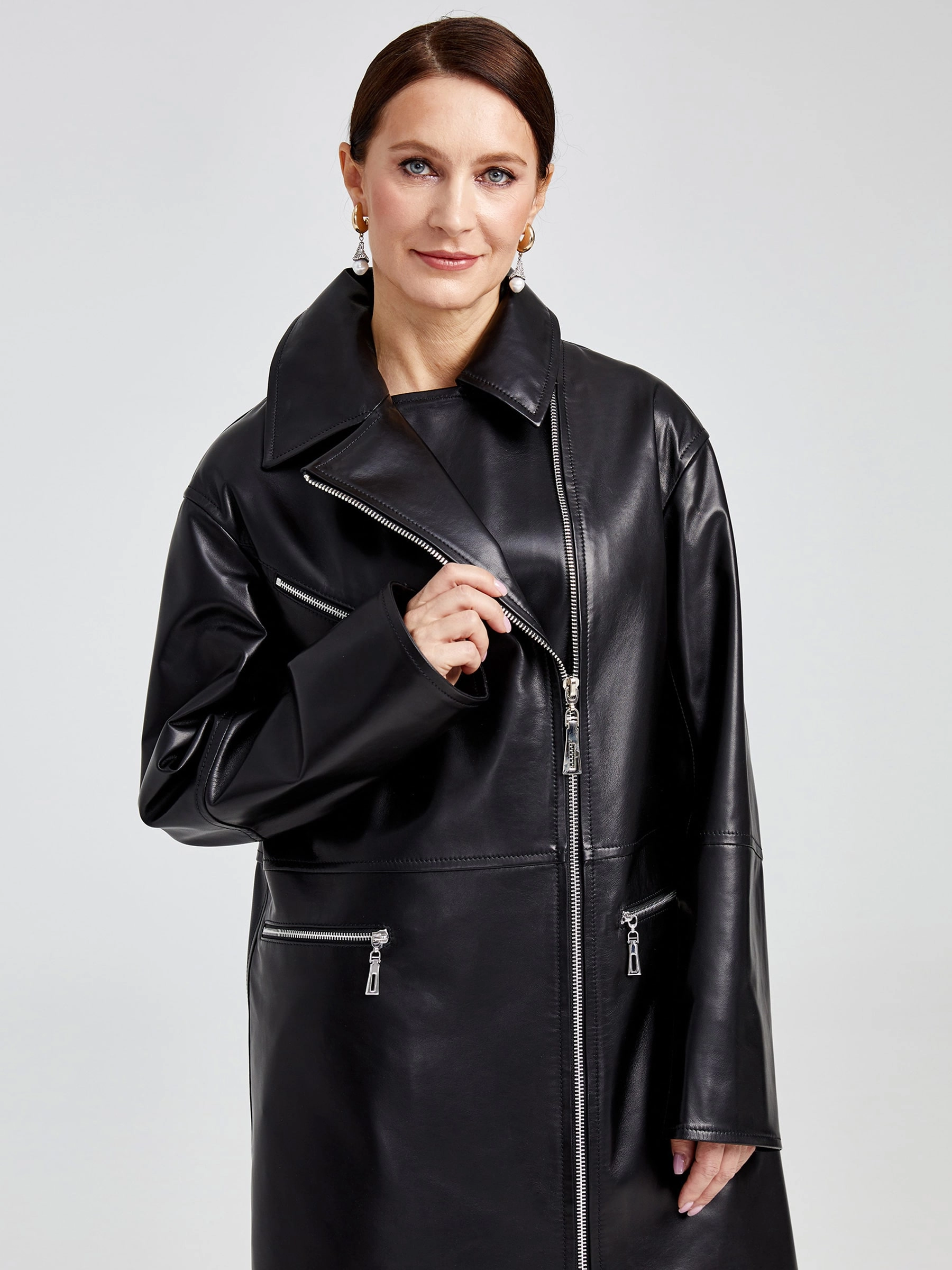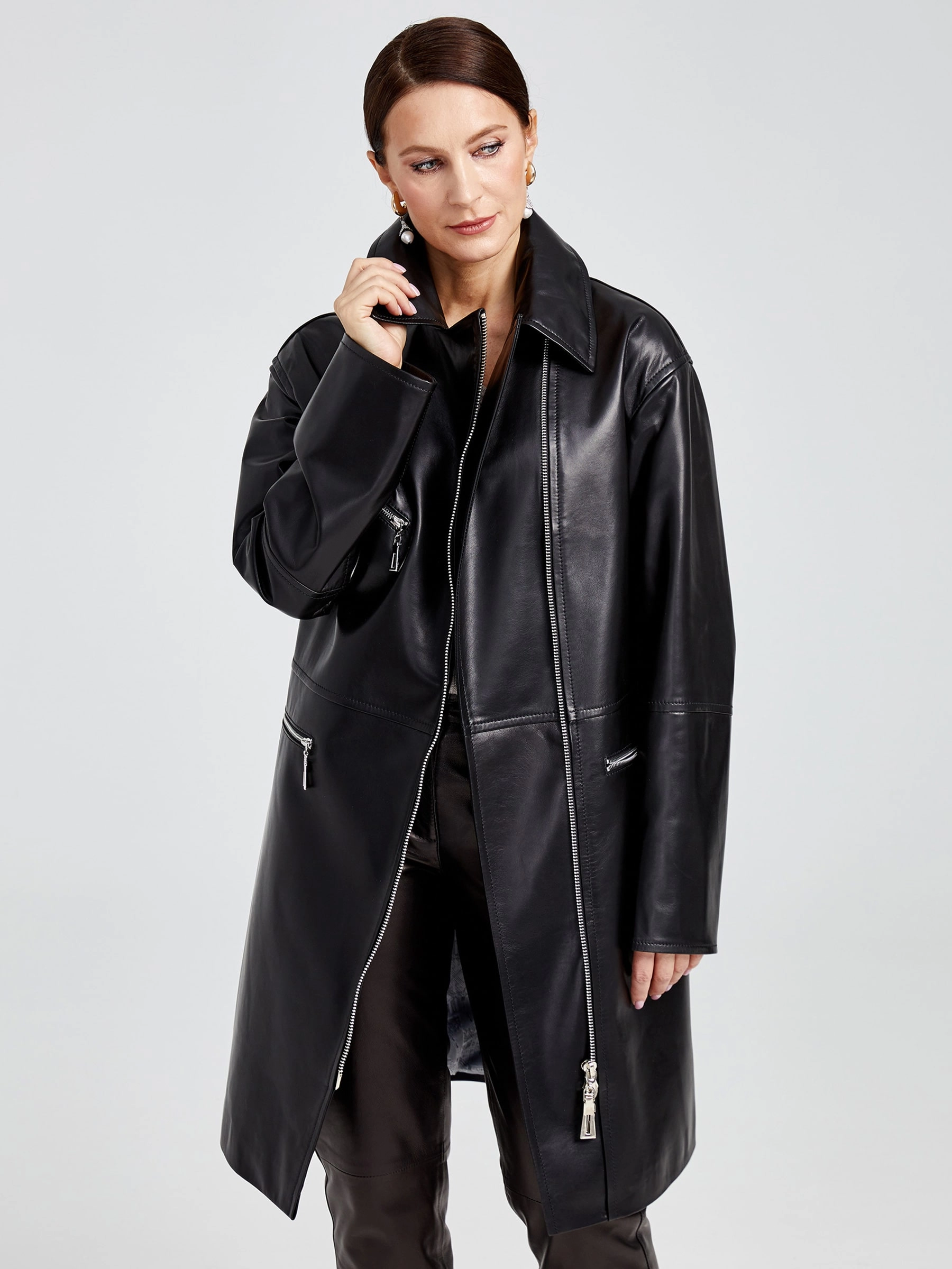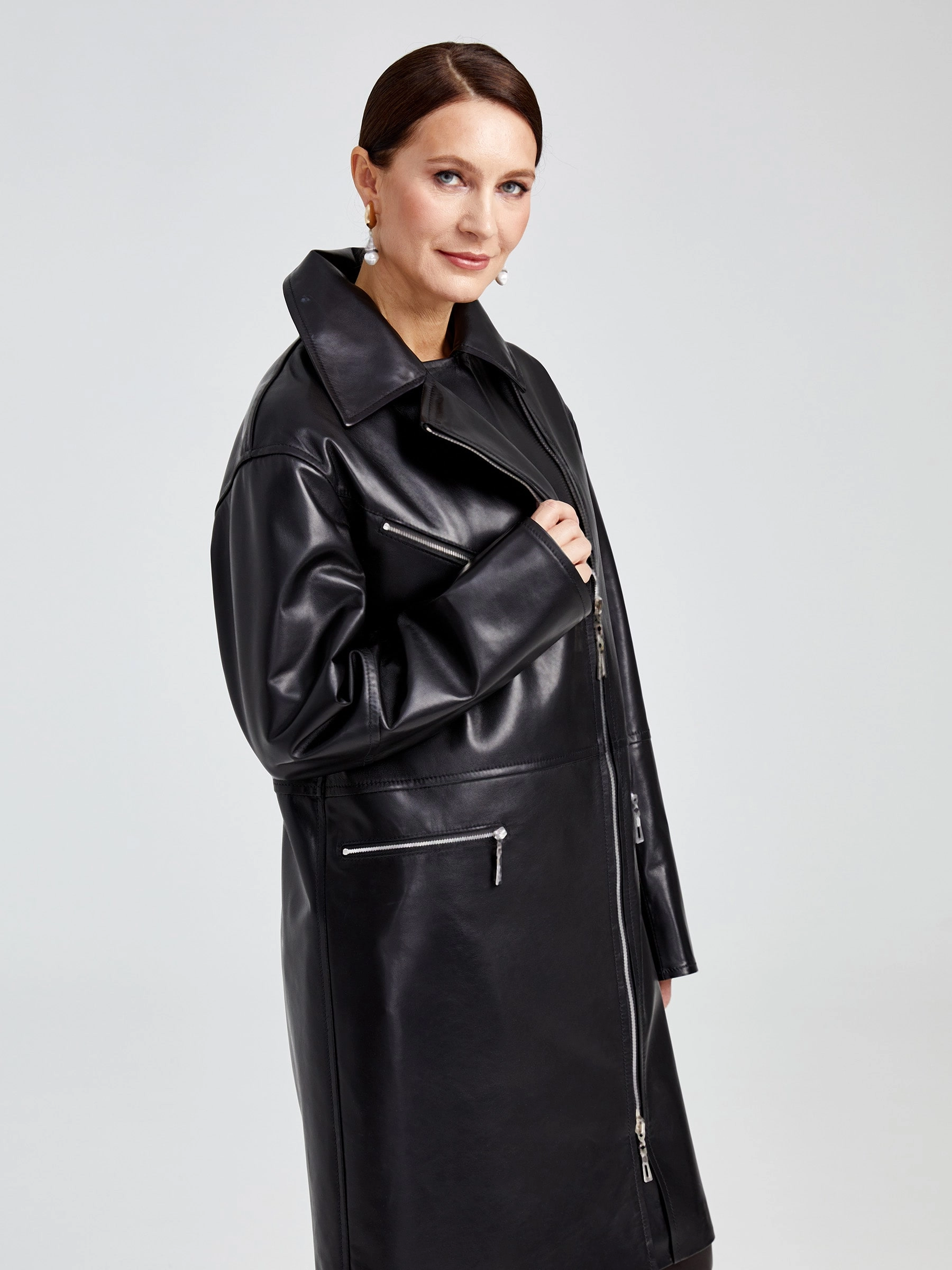 Дерзкий плащ-косуха оверсайз из роскошной натуральной кожи на молнии — современная интерпретация классики. Свободный силуэт со спущенным рукавом и отложным воротником создает динамичный спортивный образ. Крупные молнии — центральная и боковые карманы — и глянцевый блеск кожи задают мощный акцент. Незаменим для смелых луков: подчеркнет стиль с худи и кедами или добавит дерзости базовому образу с джинсами и кроссовками. Идеальная посадка и премиальное исполнение.