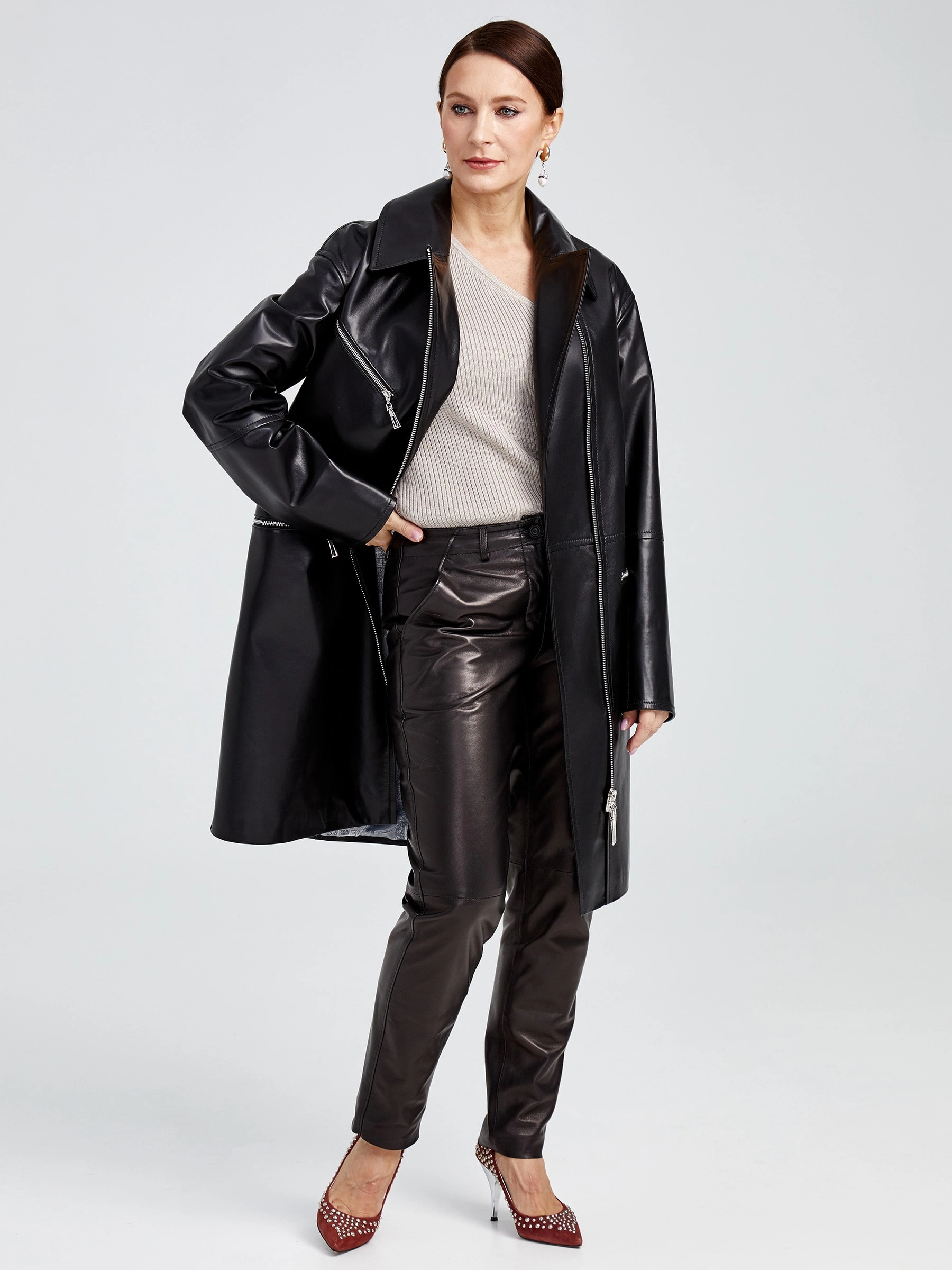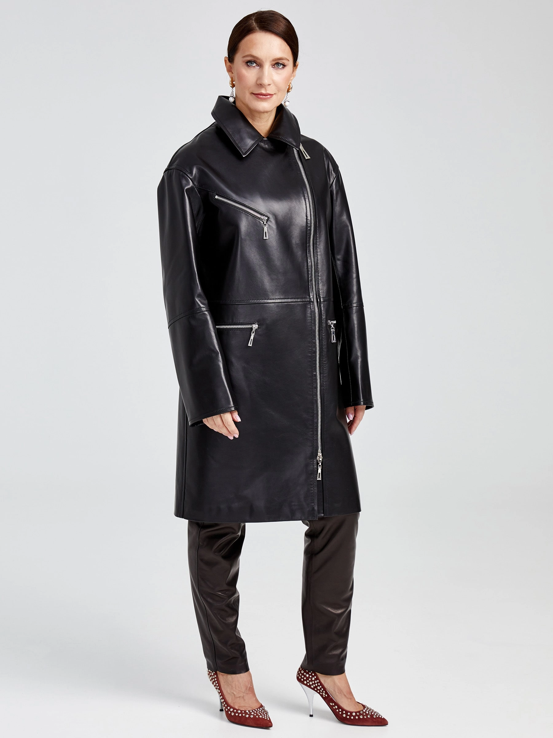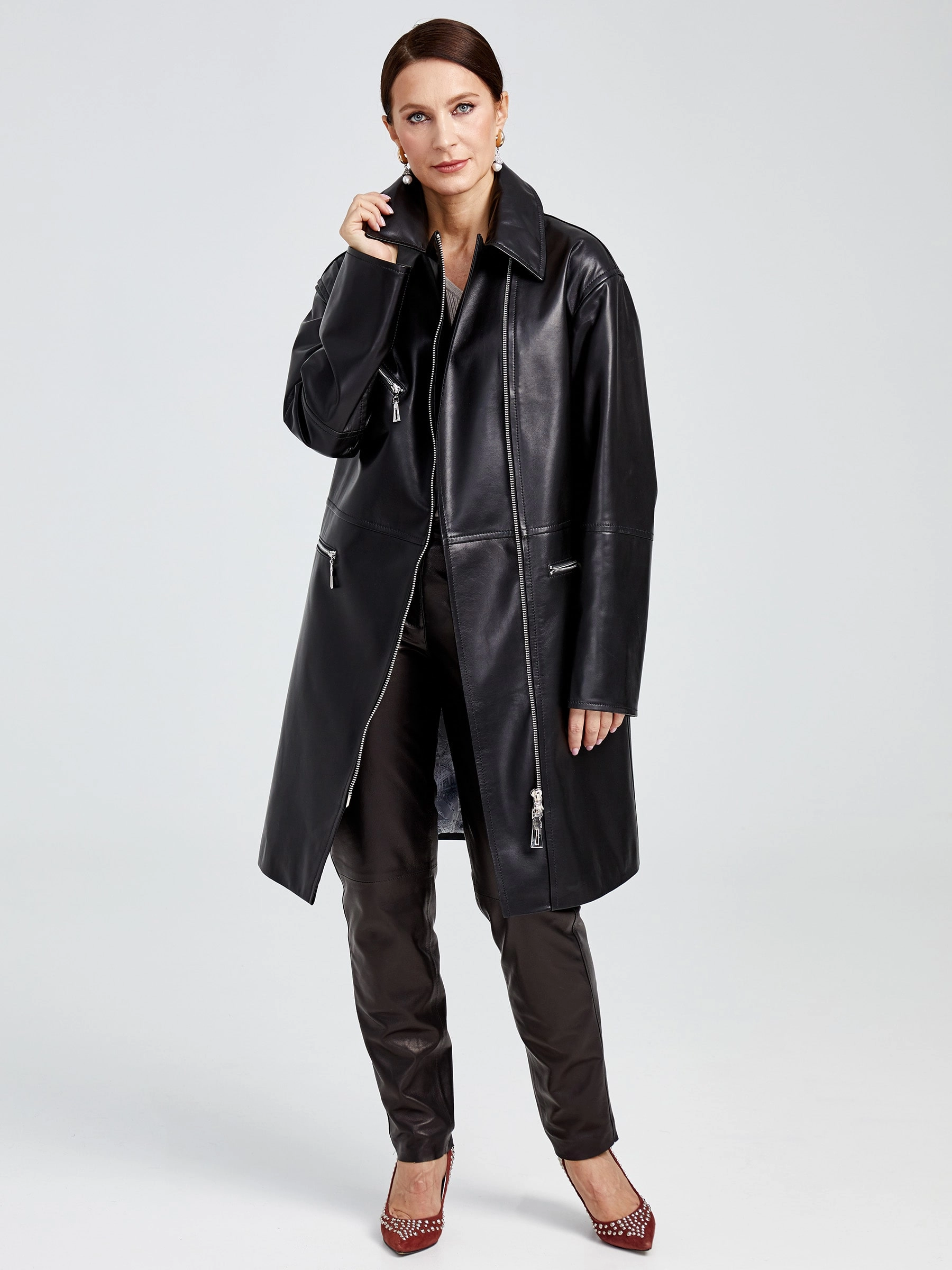 Дерзкий плащ-косуха оверсайз из роскошной натуральной кожи на молнии — современная интерпретация классики. Свободный силуэт со спущенным рукавом и отложным воротником создает динамичный спортивный образ. Крупные молнии — центральная и боковые карманы — и глянцевый блеск кожи задают мощный акцент. Незаменим для смелых луков: подчеркнет стиль с худи и кедами или добавит дерзости базовому образу с джинсами и кроссовками. Идеальная посадка и премиальное исполнение.