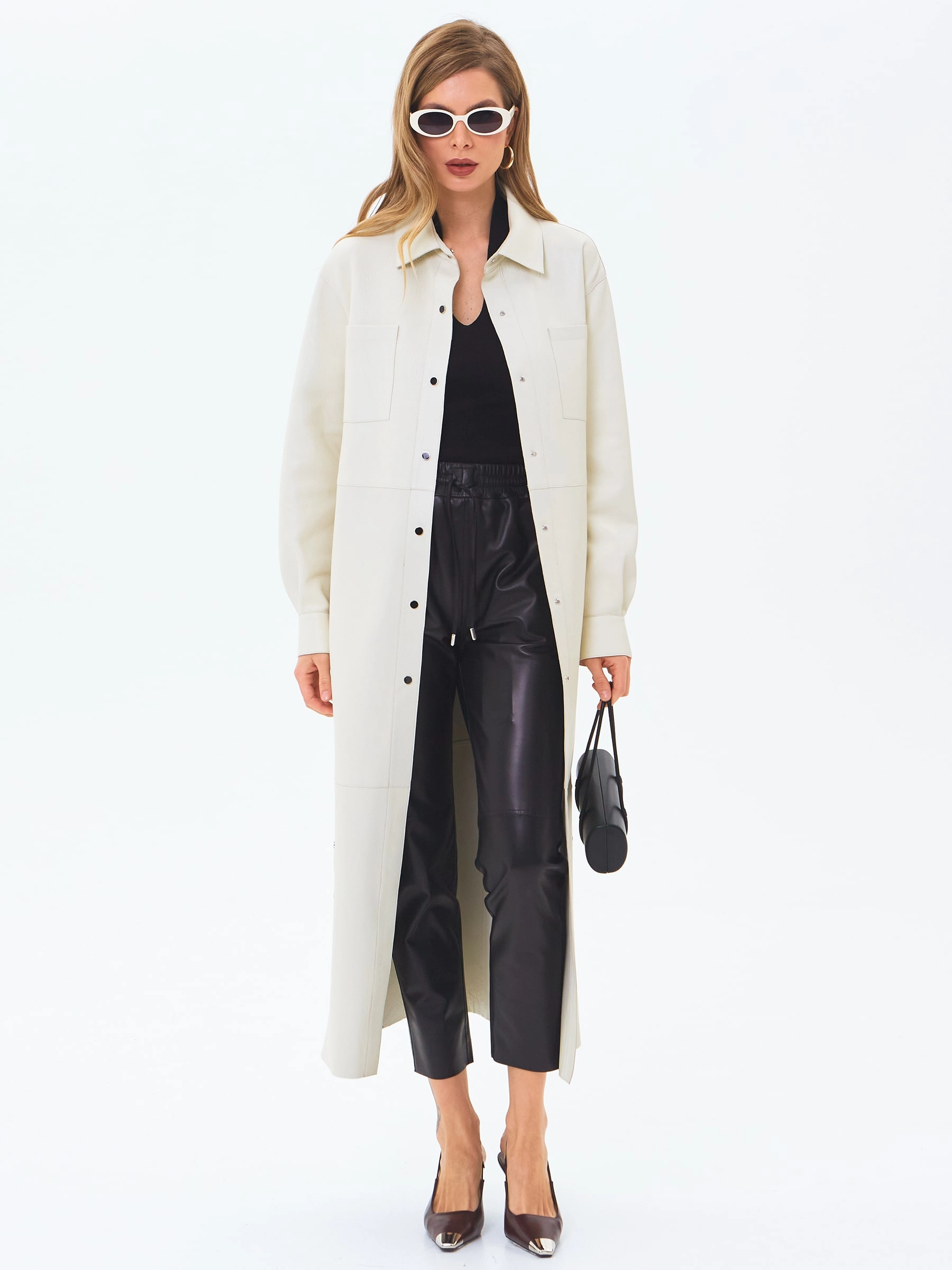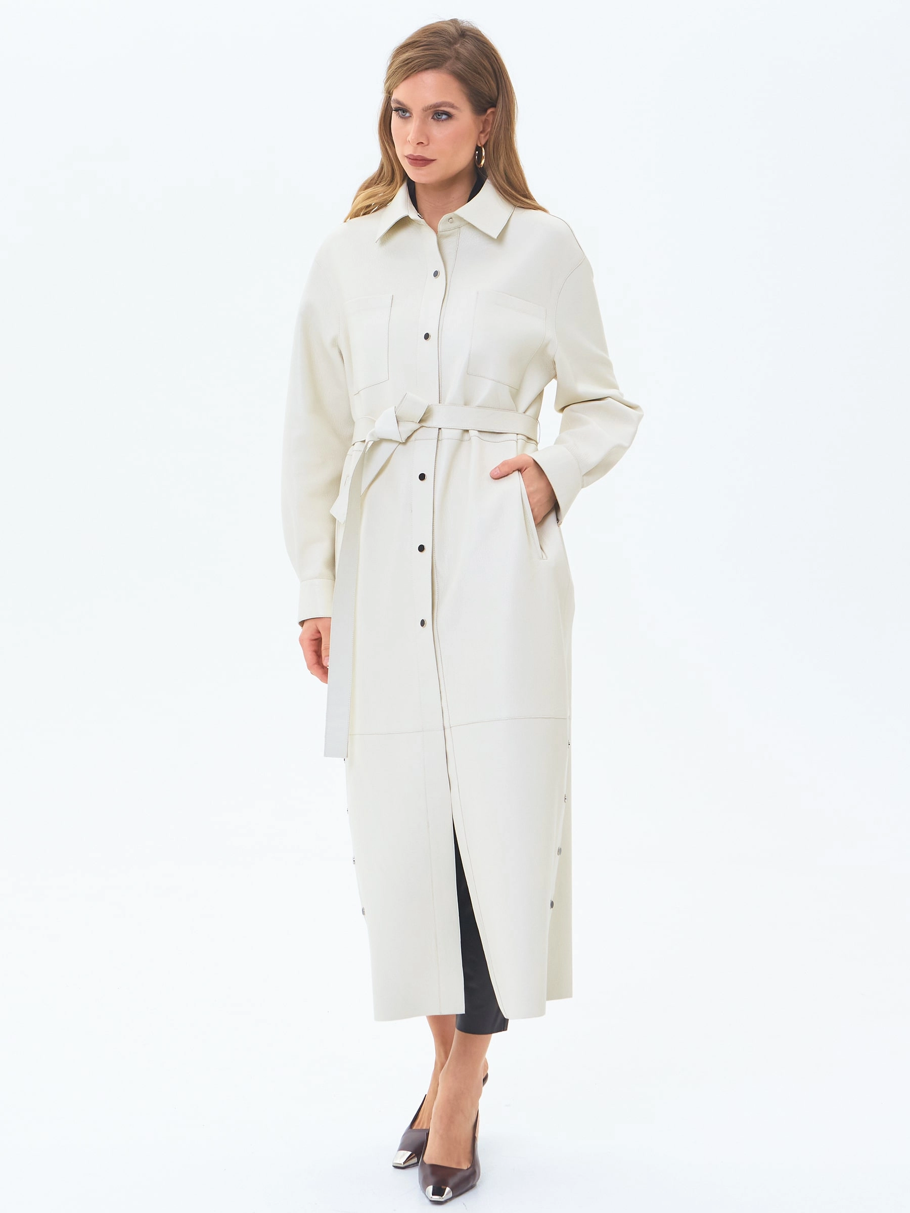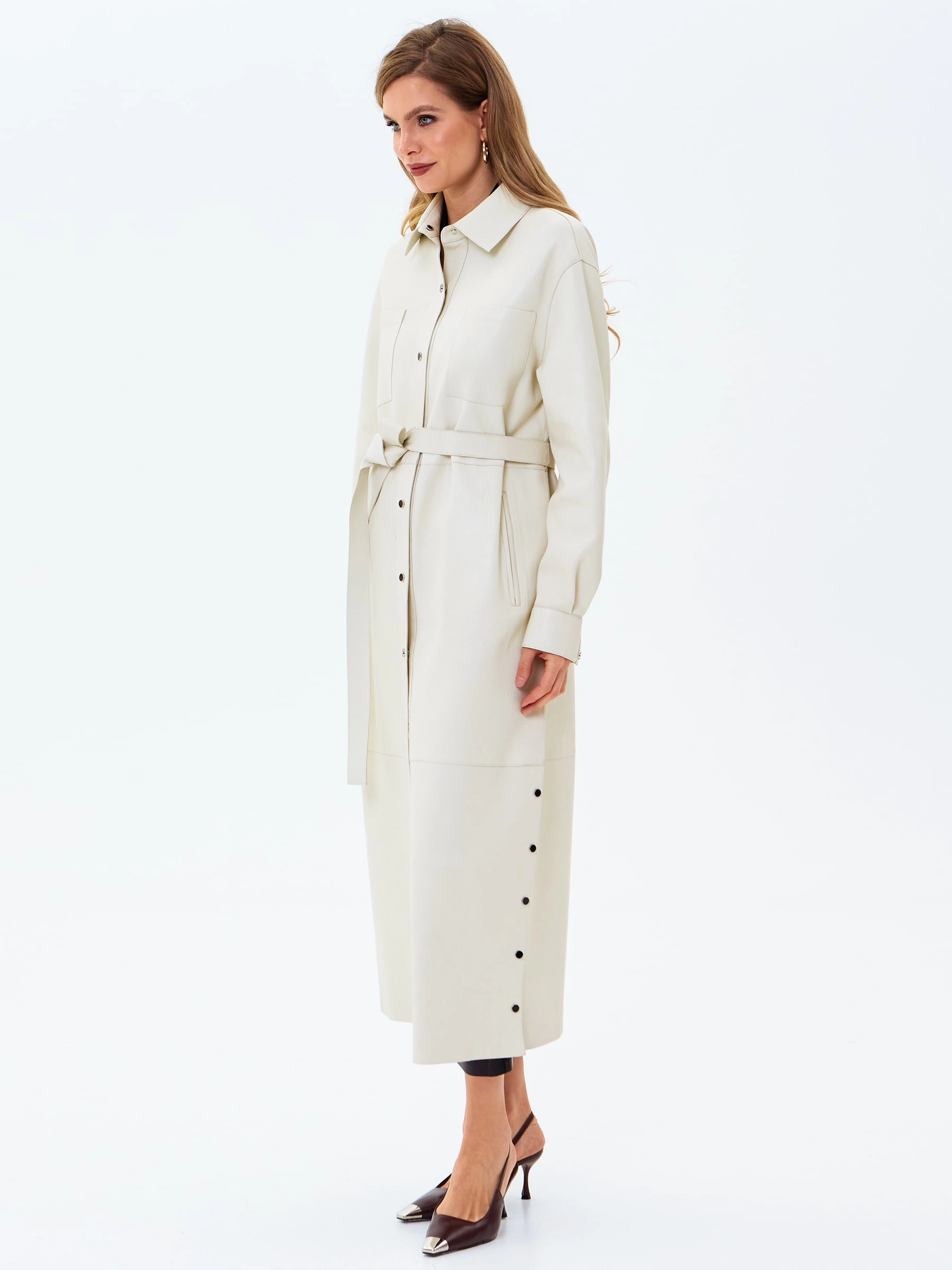 Товар плащ женский кожаный премиум класса 3091, белый, размер 44, артикул 24410 выполнен из натуральной кожи с застежкой кнопки. Рассчитан на сезон: весна-лето. Длина изделия 129 см, силуэт прямой.