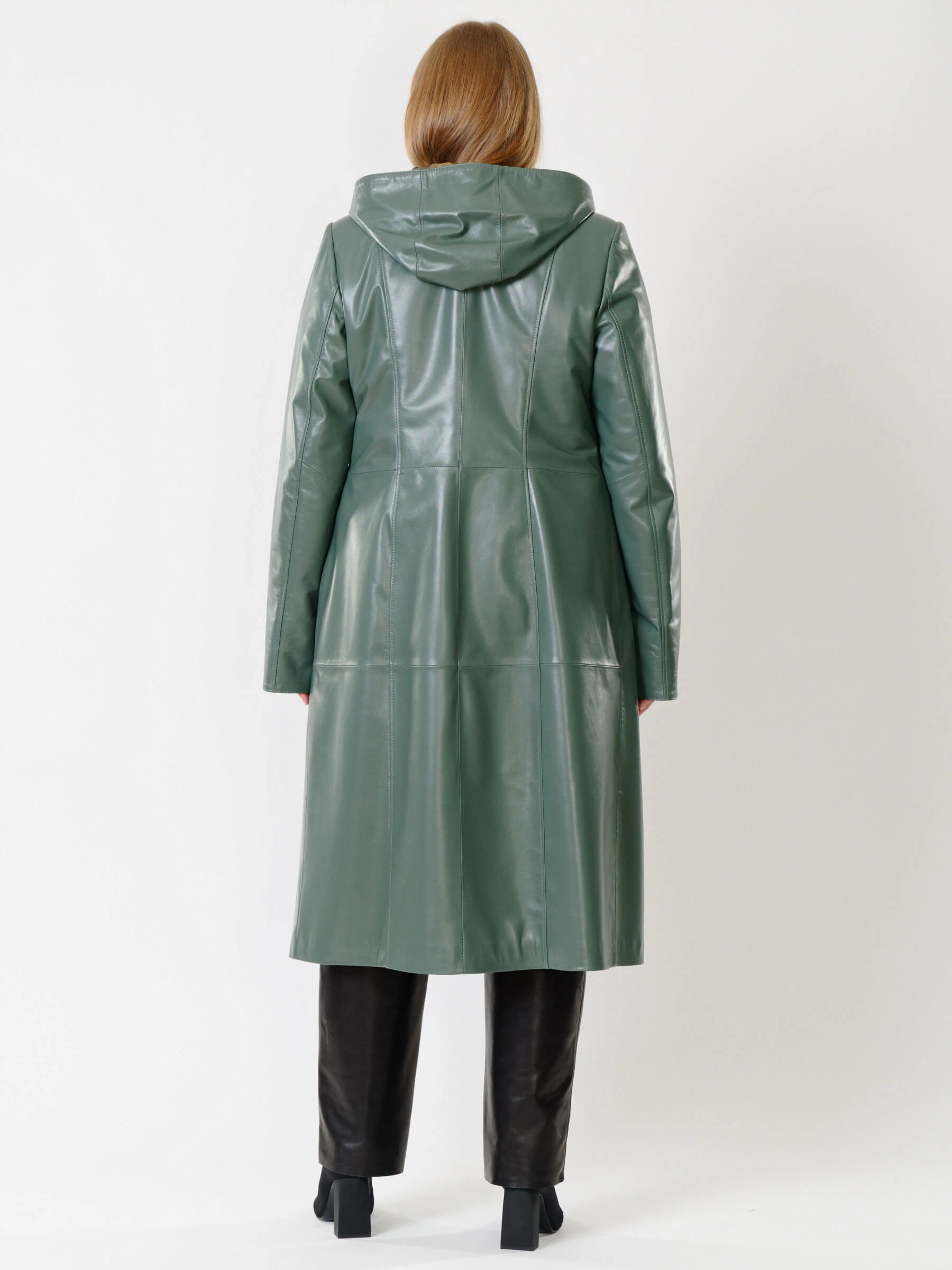 Кожаный женский утепленный плащ с капюшоном 380нш, оливковый, размер 52, артикул 91280