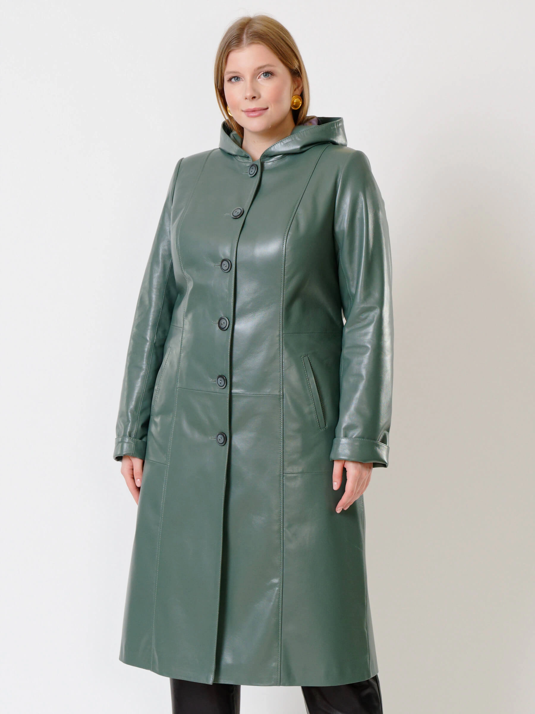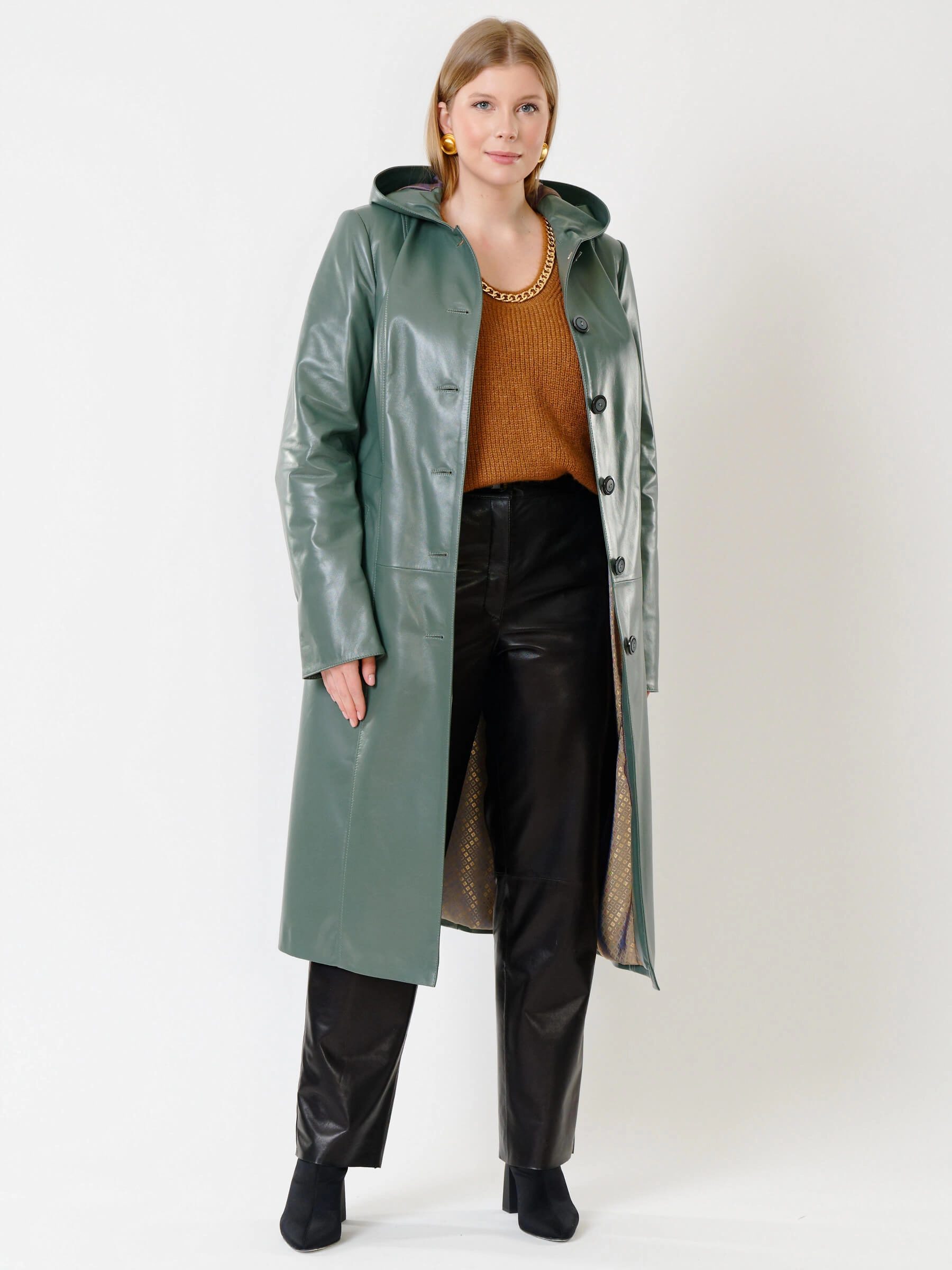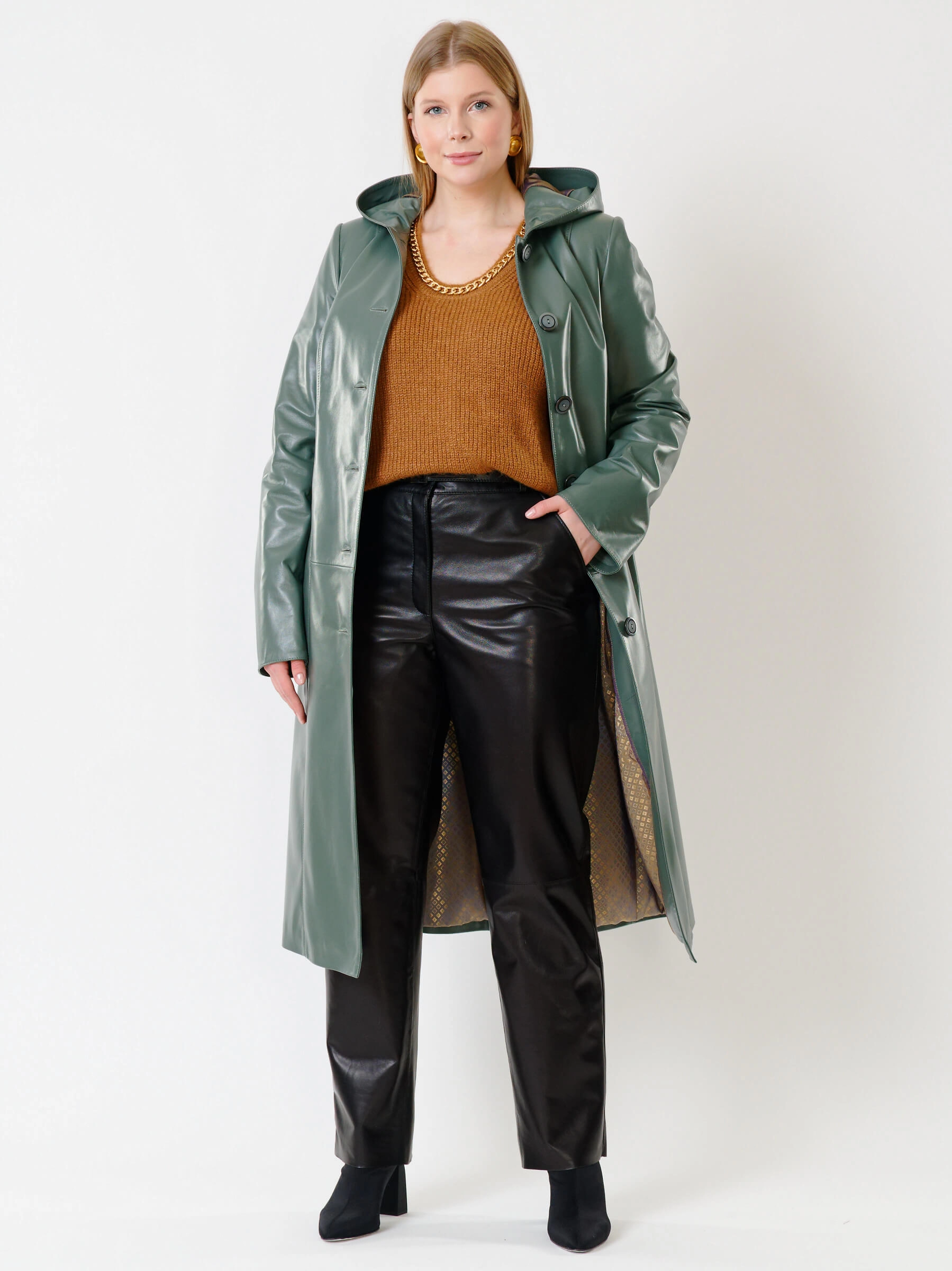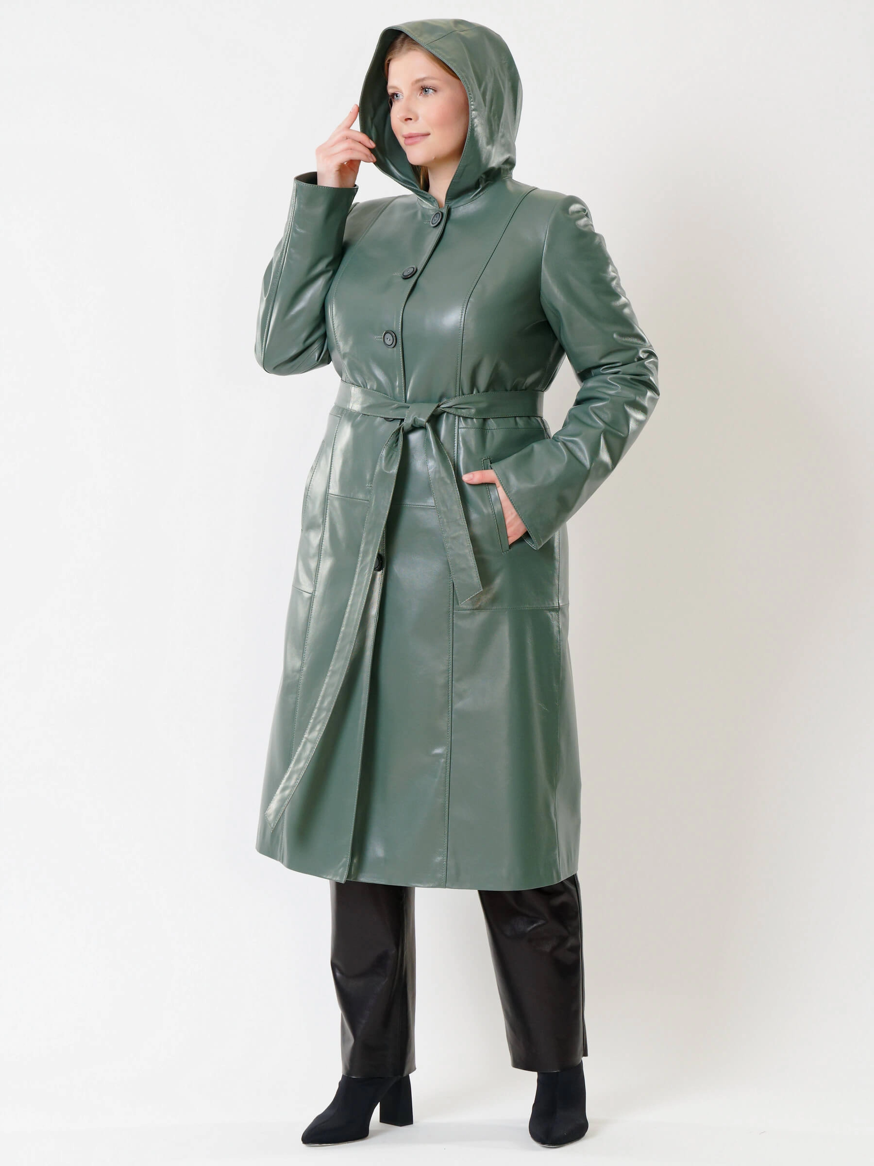 Оливковый длинный утепленный плащ из натуральной кожи на пуговицах: полуприлегающий силуэт с защитным капюшоном, подчеркивающим талию поясом, глубокими карманами и втачными рукавами для повседневной элегантности. Совет стилиста: сочетайте с объемным свитером, скинни или прямыми джинсами и грубыми кожаными ботинками.